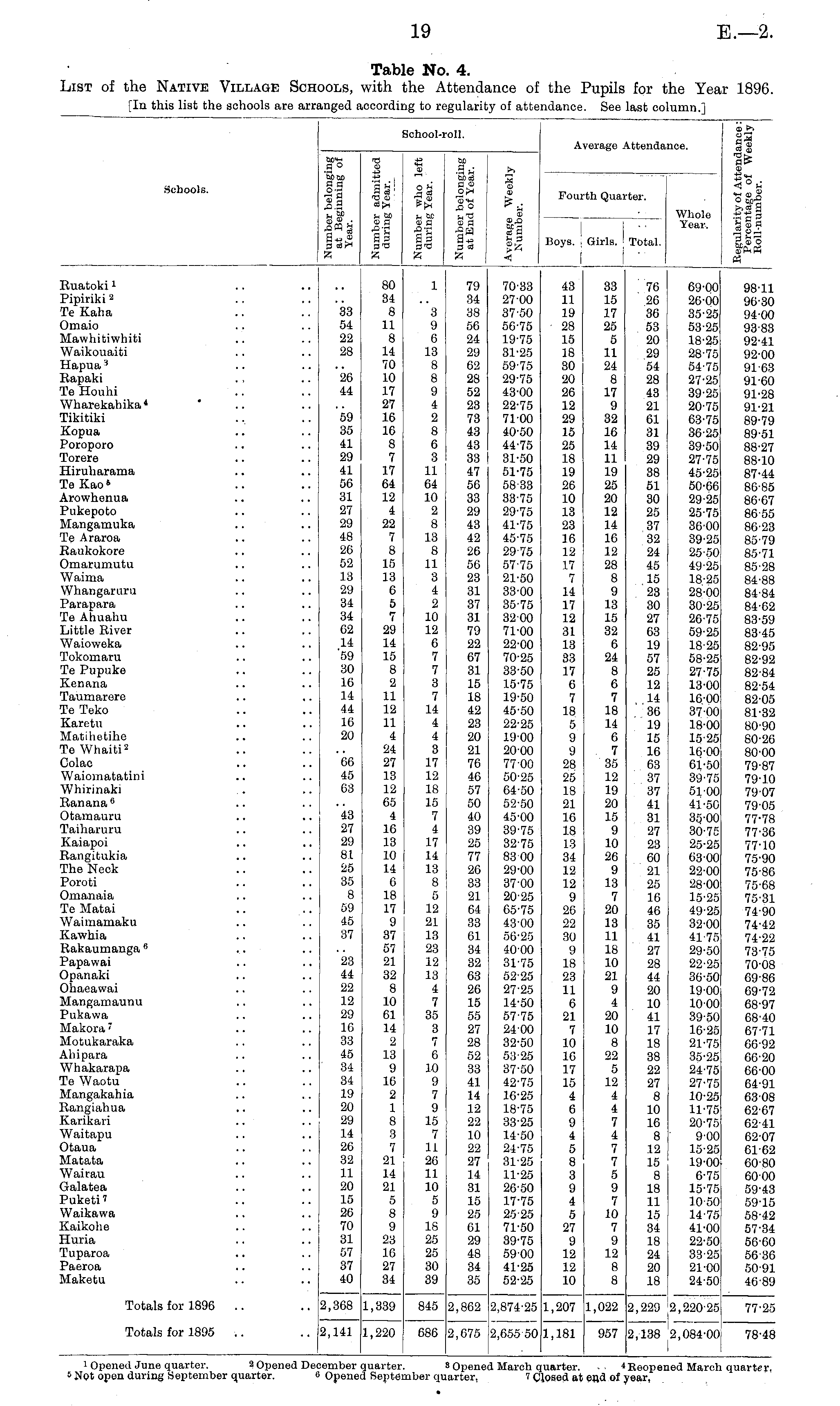 Table No. 4. List of the Native Village Schools, with the Attendance of the Pupils for the Year 1896. [In this list the schools are arranged according to regularity of attendance. See last column.]