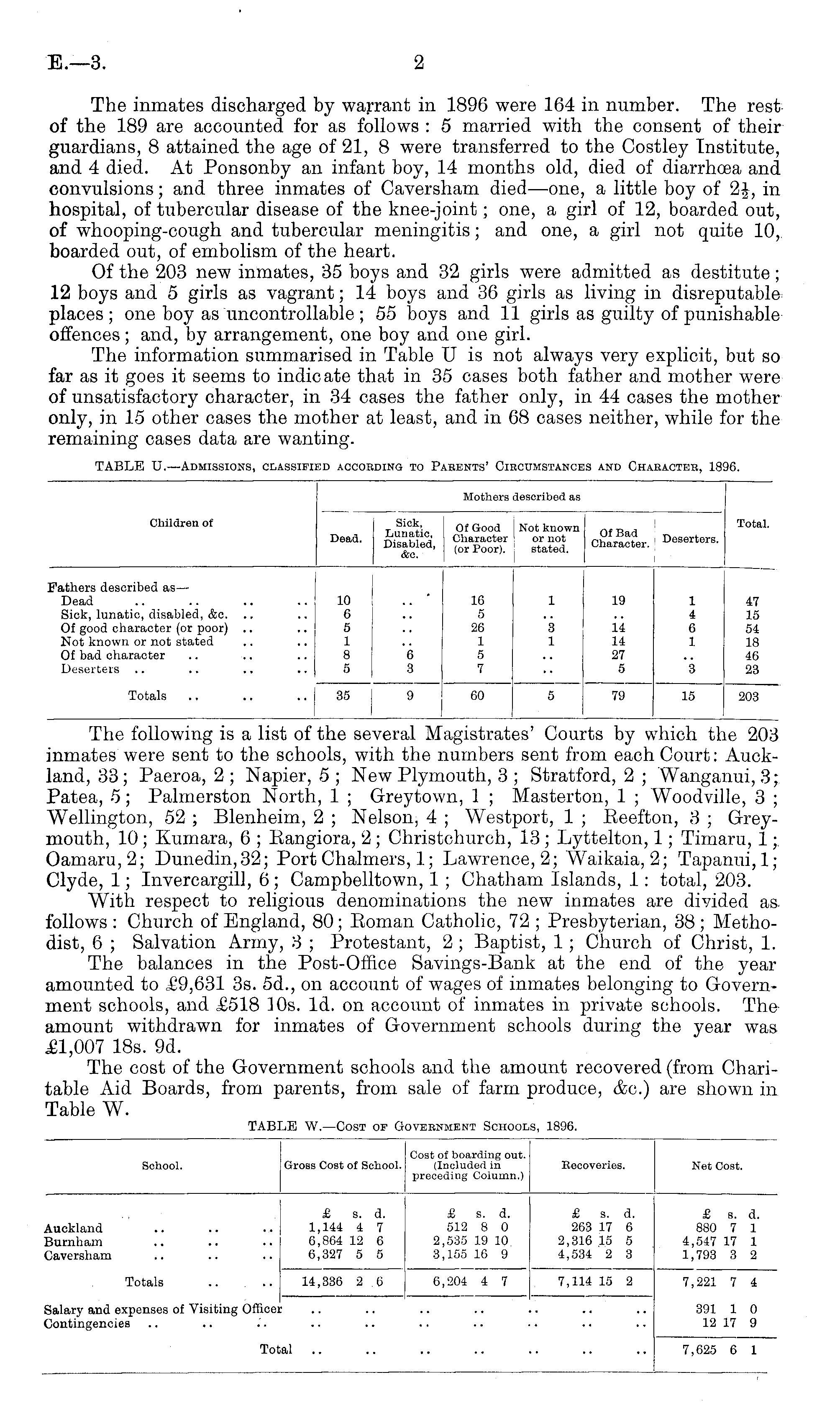 The inmates discharged by warrant in 1896 were 164 in number. The rest of the 189 are accounted for as follows : 5 married with the consent of their guardians, 8 attained the age of 21, 8 were transferred to the Costley Institute, and 4 died. At Ponsonby an infant boy, 14 months old, died of diarrhoea and convulsions; and three inmates of Caversham died —one, a little boy of 2 \, in hospital, of tubercular disease of the knee-joint; one, a girl of 12, boarded out, of whooping-cough and tubercular meningitis; and one, a girl not quite 10, boarded out, of embolism of the heart. Of the 203 new inmates, 35 boys and 32 girls were admitted as destitute; 12 boys and 5 girls as vagrant; 14 boys and 36 girls as living in disreputable places ; one boy as uncontrollable ; 55 boys and 11 girls as guilty of punishable offences; and, by arrangement, one boy and one girl. The information summarised in Table U is not always very explicit, but so far as it goes it seems to indicate that in 35 cases both father and mother were of unsatisfactory character, in 34 cases the father only, in 44 cases the mother only, in 15 other cases the mother at least, and in 68 cases neither, while for the remaining cases data are wanting.