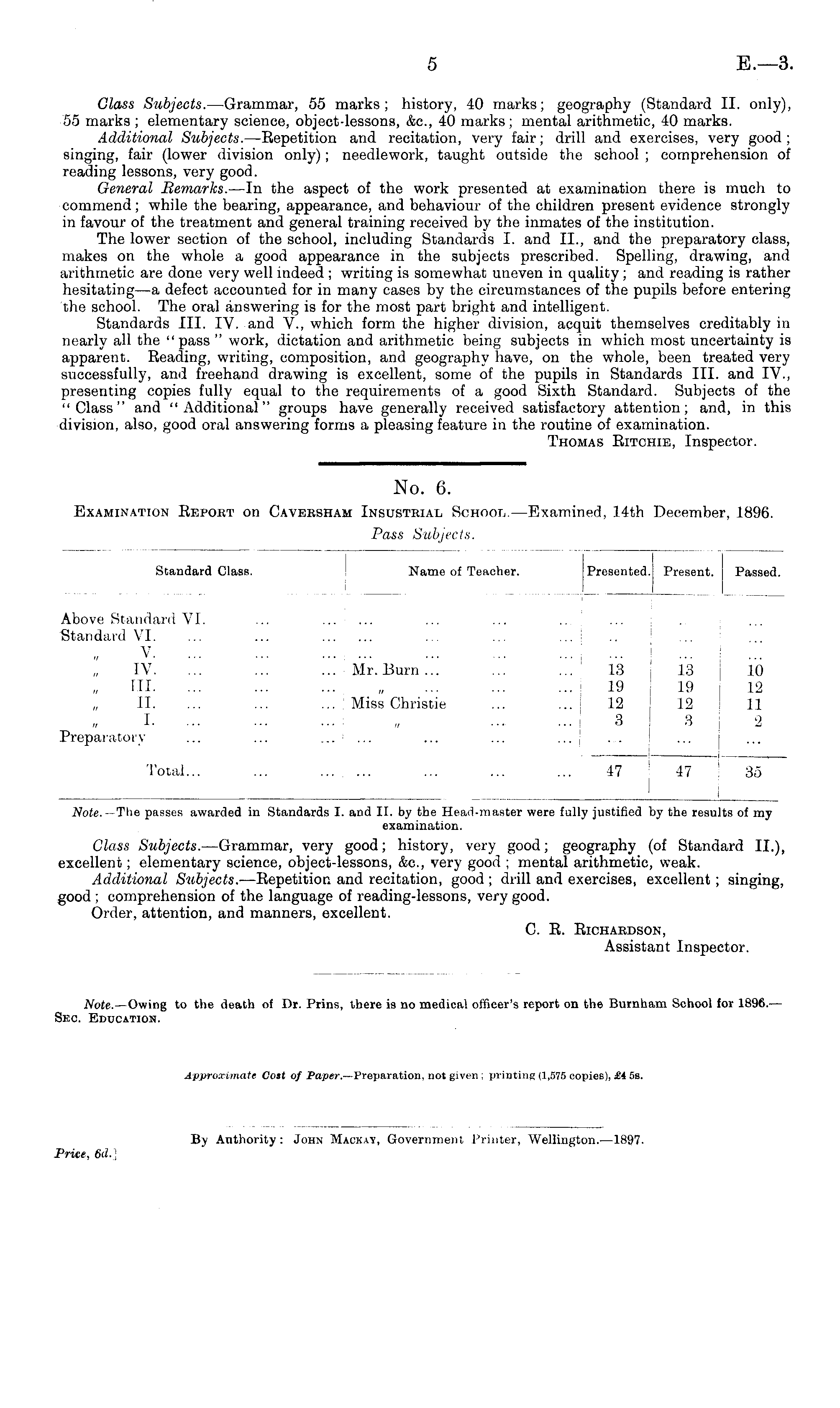Examination Report on Caversham Insustrial School.—Examined, 14th December, 1896. Pass Subjects.