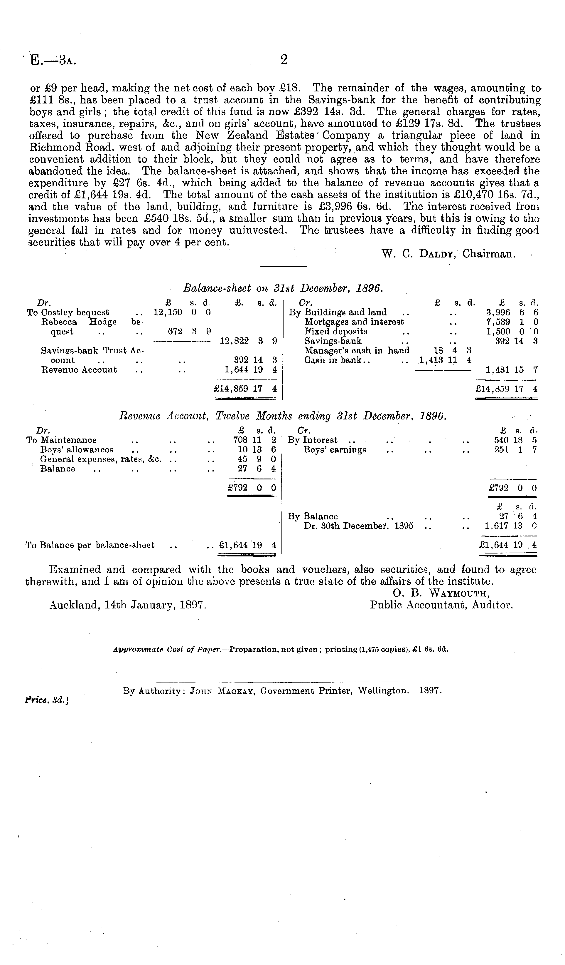 Balance-sheet on 31st December, 1896. Dr. £ s. d. & s. a. Or. & s. d. £ s. i. To Costley bequest .. 12,150 0 0 By Buildings and land .. .. 3,996 6 6 Rebecca Hodge be- Mortgages and interest .. 7,539 1 0 quest .. .. 672 3 9 Fixed deposits '.. .. 1,500 0 0 12,822 3 9 Savings-bank .. .. 392 14 3 Savings-bank Trust Ac- Manager's cash in hand 18 4 3 count .. .. .. 392 14 3 Cash in bank.. .. 1,413 11 4 Revenue Account .. .. 1,644 19 4 — 1,43115 7 £14,859 17 4 £14,859 17 4 Revenue Account, Tivelve Months ending 31st December, 1890. Dr. £ s. d. | Cr. £ s. d. To Maintenance .. .. .. 708 11 2! By Interest .. ..... .. 540 18 5 Boys' allowances .. .. .. 10 13 6 Boys' earnings .. ... .. 251 1 7 General expenses, rates, &c. .. .. 45 9 0 Balance .. .. .. .. 27 6 4 £792 0 0 £792 0 0 £ s. d. By Balance .. .. .. 27 6 4 Dr. 30th December, 1895 .. .. 1,617 13 0 To Balance per balance-sheet .. ..£1,044 19 4 £1,644 19 4 Examined and compared with the books and vouchers, also securities, and found to agree therewith, and I am of opinion the above presents a true state of the affairs of the institute. O. B. Waymouth, Auckland, 14th January, 1897. Public Accountant, Auditor.