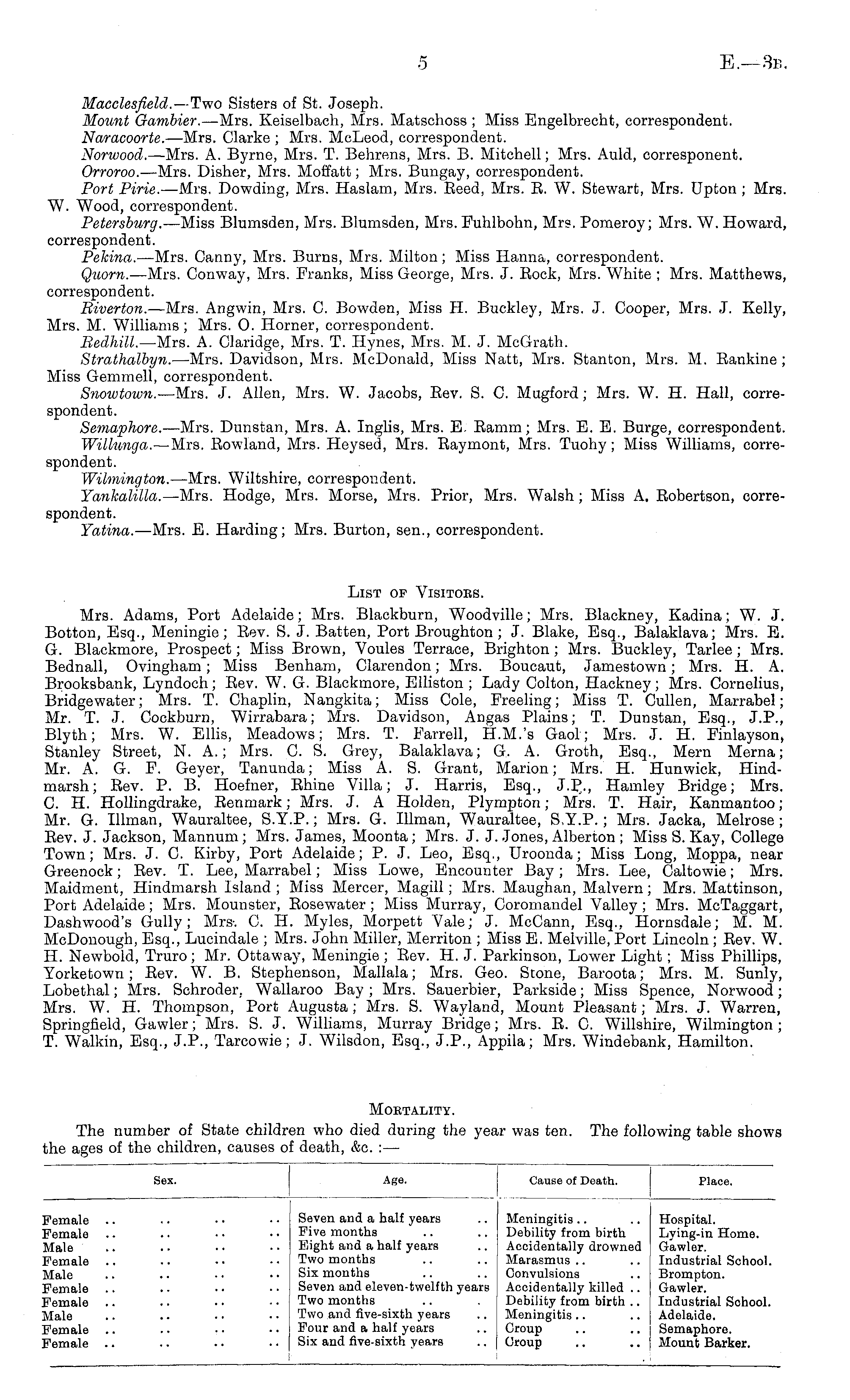 Sex. Age. Cause of Death. Place. Female Female Male Female Male Female Female Male Female Female Seven and a half years Five months Eight and a half years Two months Six months Seven and eleven-twelfth years Two months Two and five-sixth years Four and a half years Six and five-sixth years Meningitis Debility from birth Accidentally drowned Marasmus Convulsions Accidentally killed .. Debility from birth .. Meningitis Group Group Hospital. Lying-in Home. Gawler. Industrial School. Brompton. Gawler. Industrial School. Adelaide. Semaphore. Mount Barker.