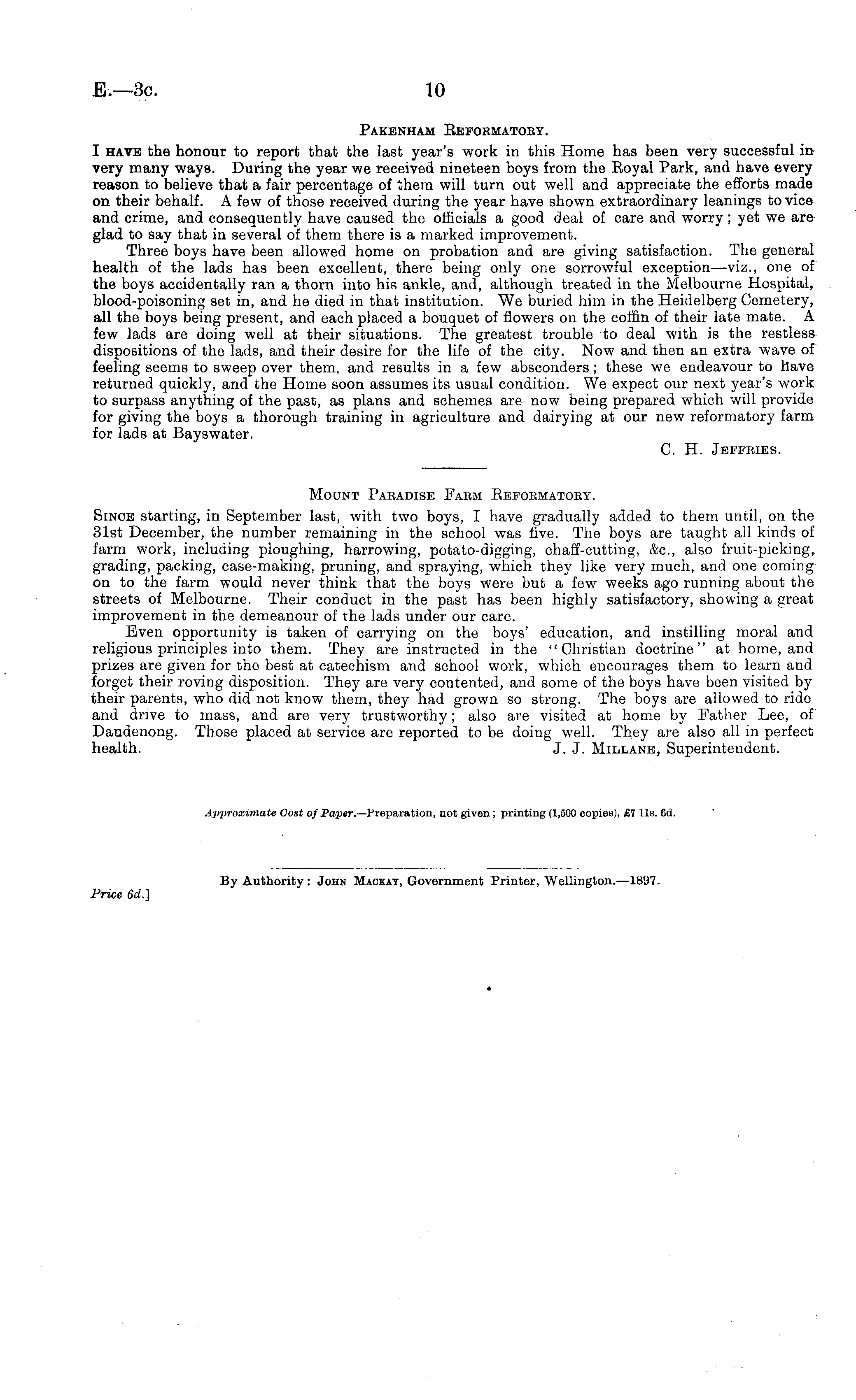 Mount Pakadise Fabm Eefokmatoby. Since starting, in September last, with two boys, I have gradually added to them until, on the 31st December, the number remaining in the school was five. The boys are taught all kinds of farm work, including ploughing, harrowing, potato-digging, chaff-cutting, &c, also fruit-picking, grading, packing, case-making, pruning, and spraying, winch they like very much, and one coming on to the farm would never think that the boys were but a few weeks ago running about the streets of Melbourne. Their conduct in the past has been highly satisfactory, showing a great improvement in the demeanour of the lads under our care. Even opportunity is taken of carrying on the boys' education, and instilling moral and religious principles into them. They are instructed in the "Christian doctrine" at home, and prizes are given for the best at catechism and school work, which encourages them to learn and forget their roving disposition. They are very contented, and some of the boys have been visited by their parents, who did not know them, they had grown so strong. The boys are allowed to ride and drive to mass, and are very trustworthy; also are visited at home by Father Lee, of Dandenong. Those placed at service are reported to be doing well. They are also all in perfect health. J. J. Millane, Superintendent. Approximate Cost of Paper. —Preparation, not given ; printing (1,500 copies), £7 11s. 6d.