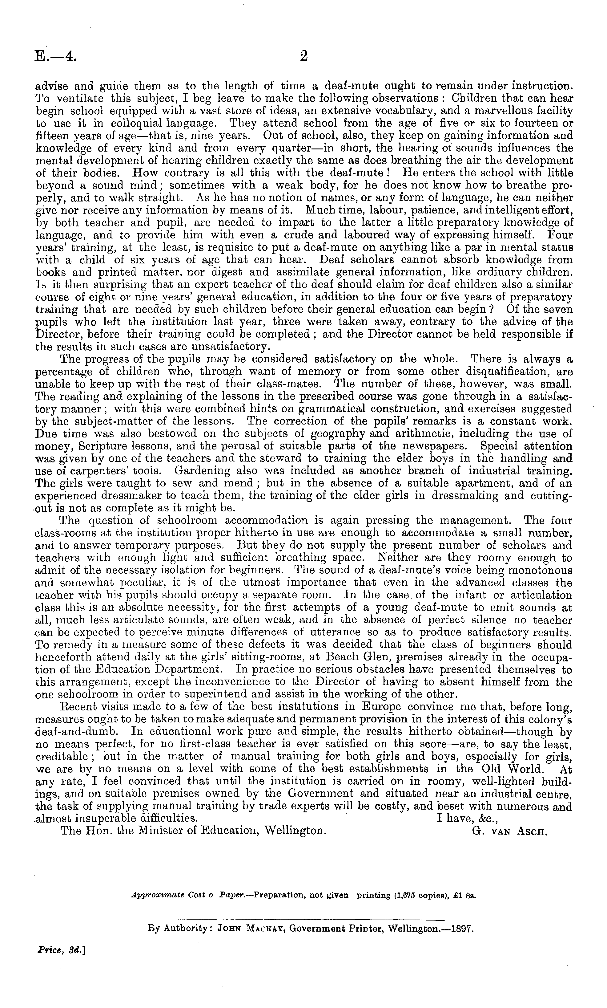 advise and guide them as to the length of time a deaf-mute ought to remain under instruction. To ventilate this subject, I beg leave to make the following observations : Children that can hear begin school equipped with a vast store of ideas, an extensive vocabulary, and a marvellous facility to use it in colloquial language. They attend school from the age of five or six to fourteen or fifteen years of age—that is, nine years. Out of school, also, they keep on gaining information and knowledge of every kind and from every quarter —in short, the hearing of sounds influences the mental development of hearing children exactly the same as does breathing the air the development of their bodies. How contrary is all this with the deaf-mute ! He enters the school with little beyond a sound mind; sometimes with a weak body, for he does not know how to breathe properly, and to walk straight. As he has no notion of names, or any form of language, he can neither give nor receive any information by means of it. Much time, labour, patience, and intelligent effort, by both teacher and pupil, are needed to impart to the latter a little preparatory knowledge of language, and to provide him with even a crude and laboured way of expressing himself. Four years' training, at the least, is requisite to put a deaf-mute on anything like a par in mental status with a child of six years of age that can hear. Deaf scholars cannot absorb knowledge from books and printed matter, nor digest and assimilate general information, like ordinary children. Is it then surprising that an expert teacher of the deaf should claim for deaf children also a similar course of eight or nine years' general education, in addition to the four or five years of preparatory training that are needed by such children before their general education can begin ? Of the seven pupils who left the institution last year, three were taken away, contrary to the advice of the Director, before their training could be completed ; and the Director cannot be held responsible if the results in such cases are unsatisfactory. The progress of the pupils may be considered satisfactory on the whole. There is always a percentage of children who, through want of memory or from some other disqualification, are unable to keep up with the rest of their class-mates. The number of these, however, was small. The reading and explaining of the lessons in the prescribed course was gone through in a satisfactory manner; with this were combined hints on grammatical construction, and exercises suggested by the subject-matter of the lessons. The correction of the pupils' remarks is a constant work. Due time was also bestowed on the subjects of geography and arithmetic, including the use of money, Scripture lessons, and the perusal of suitable parts of the newspapers. Special attention was given by one of the teachers and the steward to training the elder boys in the handling and use of carpenters' tools. Gardening also was included as another branch of industrial training. The girls were taught to sew and mend ; but in the absence of a suitable apartment, and of an experienced dressmaker to teach them, the training of the elder girls in dressmaking and cuttingout is not as complete as it might be. The question of schoolroom accommodation is again pressing the management. The four class-rooms at the institution proper hitherto in use are enough to accommodate a small number, and to answer temporary purposes. But they do not supply the present number of scholars and teachers with enough light and sufficient breathing space. Neither are they roomy enough to admit of the necessary isolation for beginners. The sound of a deaf-mute's voice being monotonous and somewhat peculiar, it is of the utmost importance that even in the advanced classes the teacher with his pupils should occupy a separate room. In the case of the infant or articulation class this is an absolute necessity, for the first attempts of a young deaf-mute to emit sounds at all, much less articulate sounds, are often weak, and in the absence of perfect silence no teacher can be expected to perceive minute differences of utterance so as to produce satisfactory results. To remedy in a measure some of these defects it was decided that the class of beginners should henceforth attend daily at the girls' sitting-rooms, at Beach Glen, premises already in the occupation of the Education Department. In practice no serious obstacles have presented themselves to this arrangement, except the inconvenience to the Director of having to absent himself from the one schoolroom in order to superintend and assist in the working of the other. Recent visits made to a few of the best institutions in Europe convince me that, before long, measures ought to be taken to make adequate and permanent provision in the interest of this colony's deaf-and-dumb. In educational work pure and simple, the results hitherto obtained—though by no means perfect, for no first-class teacher is ever satisfied on this score—are, to say the least, creditable ; but in the matter of manual training for both girls and boys, especially for girls, we are by no means on a level with some of the best establishments in the Old World. At any rate, I feel convinced that until the institution is carried on in roomy, well-lighted buildings, and on suitable premises owned by the Government and situated near an industrial centre, the task of supplying manual training by trade experts will be costly, and beset with numerous and almost insuperable difficulties. I have, &c, The Hon. the Minister of Education, Wellington. G. van Asch. Approximate Cost o Paper.— Preparation, not given printing (1,675 copies), £1 Bs.