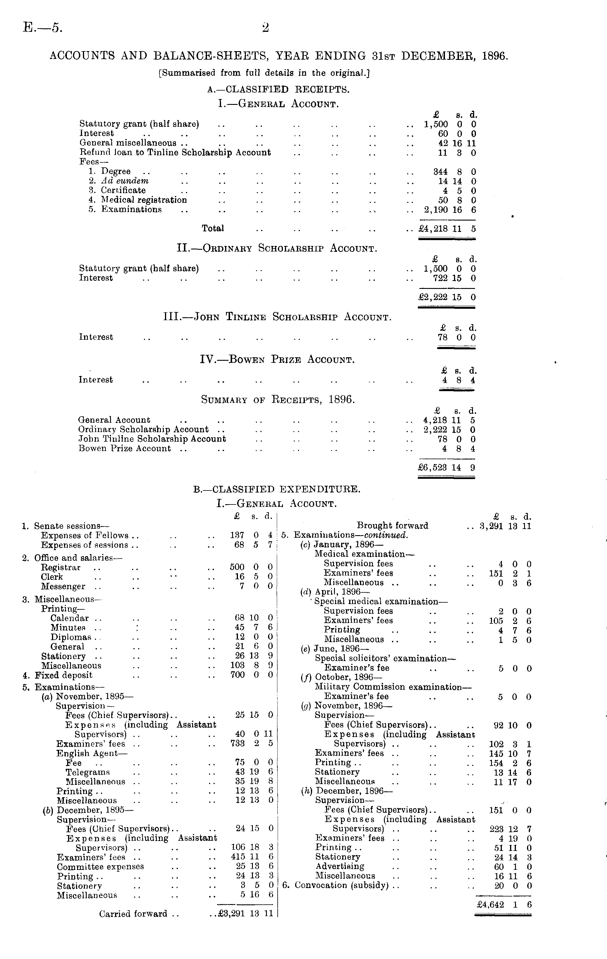 ACCOUNTS AND BALANCE-SHEETS, YEAB ENDING 31st DECEMBEB, 1896. [Summarised from full details in the original.] A.—CLASSIFIED RECEIPTS. I.—General Account. £ s. d. Statutory grant (half share) .. .. .. .. .. .. 1,500 0 0 Interest .. .. .. .. .. .. .. .. 60 0 0 General miscellaneous .. .. .. .. .. .. .. 42 16 11 Refund loan to Tinline Scholarship Account .. .. .. .. 11 3 0 Fees— 1. Degree .. .. .. .. .. .. .. 344 8 0 2. Ad eundem .. .. .. .. .. .. .. 14 14 0 3. Certificate .. .. .. .. .. .. .. 450 4. Medical registration .. .. .. .. .. .. 50 8 0 5. Examinations .. .. .. .. .. ... .. 2,190 16 6 i Total .. .. .. .. .. £4,218 11 5 ll.—Ordinary Scholarship Account. £ s. d. Statutory grant (half share) .. .. .. .. .. .. 1,500 0 0 Interest .. .. .. .. .. .. .. .. 722 15 0 £2,222 15 0 lll.—John Tinline Scholarship Account. £ s. d. Interest .. .. .. .. .. .. .. .. 78 0 0 IV. —Bowen Prize Account. £ s. d. Interest .. .. .. .. .. .. .. .. 484 Summary of Beceipts, 1896. £ s. d. General Account .. .. .. .. .. .. .. 4,218 11 5 Ordinary Scholarship Account .. .. .. .. .. .. 2,222 15 0 John Tinline Scholarship Account .. .. .. .. .. 78 0 0 Bowen Prize Account .. .. .. .. .. .. .. 484 £6,523 14 9
