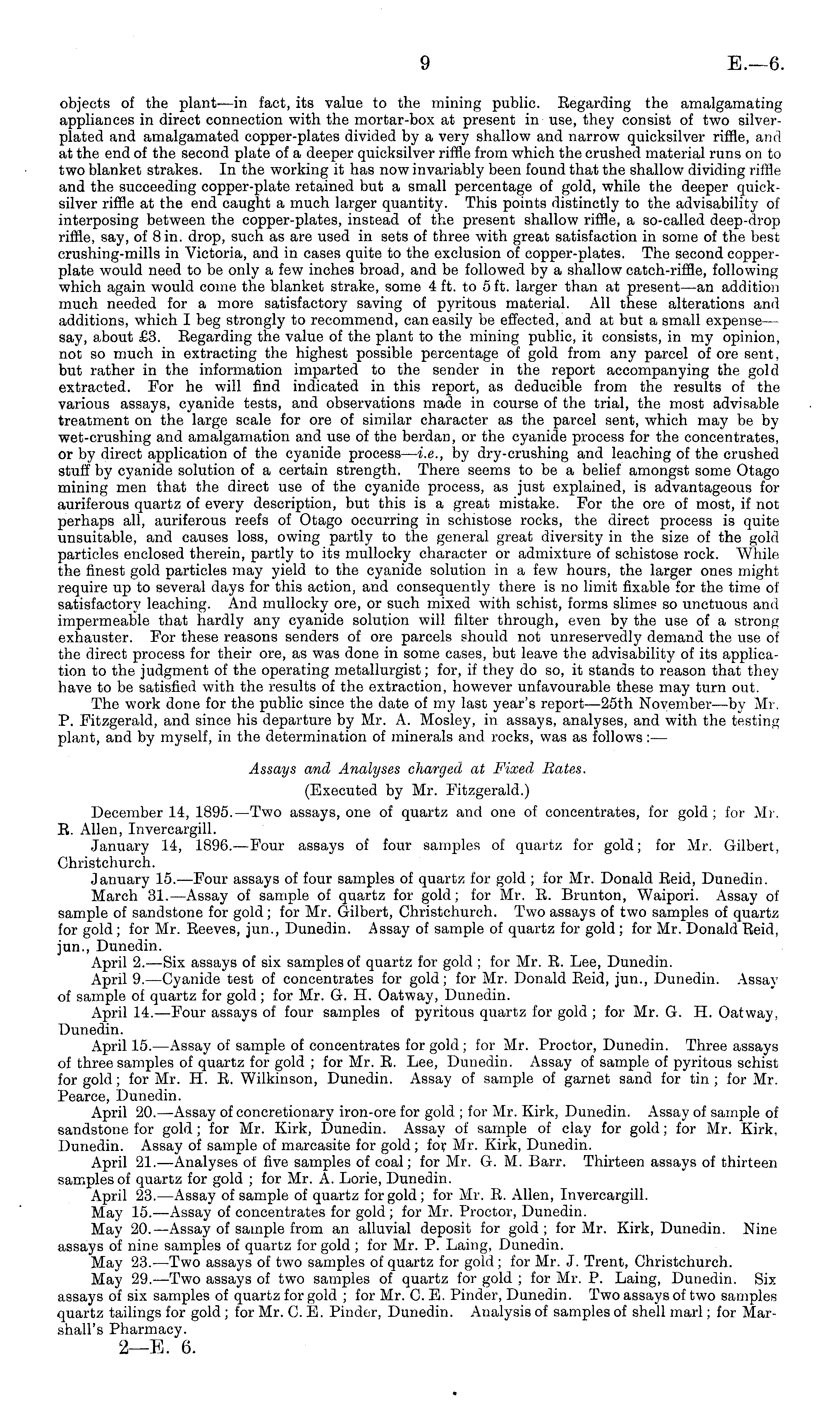 objects of the plant —in fact, its value to the mining public. Eegarding the amalgamating appliances in direct connection with the mortar-box at present in use, they consist of two silverplated and amalgamated copper-plates divided by a very shallow and narrow quicksilver riffle, and at the end of the second plate of a deeper quicksilver riffle from which the crushed material runs on to two blanket strakes. In the working it has now invariably been found that the shallow dividing riffle and the succeeding copper-plate retained but a small percentage of gold, while the deeper quicksilver riffle at the end caught a much larger quantity. This points distinctly to the advisability of interposing between the copper-plates, instead of the present shallow riffle, a so-called deep-drop riffle, say, of 8 in. drop, such as are used in sets of three with great satisfaction in some of the best crushing-mills in Victoria, and in cases quite to the exclusion of copper-plates. The second copperplate would need to be only a few inches broad, and be followed by a shallow catch-riffle, following which again would come the blanket strake, some 4 ft. to 5 ft. larger than at present—an addition much needed for a more satisfactory saving of pyritous material. All these alterations and additions, which I beg strongly to recommend, can easily be effected, and at but a small expense— say, about £3. Eegarding the value of the plant to the mining public, it consists, in my opinion, not so much in extracting the highest possible percentage of gold from any parcel of ore sent, but rather in the information imparted to the sender in the report accompanying the gold extracted. For he will find indicated in this report, as deducible from the results of the various assays, cyanide tests, and observations made in course of the trial, the most advisable treatment on the large scale for ore of similar character as the parcel sent, which may be by wet-crushing and amalgamation and use of the berdan, or the cyanide process for the concentrates, or by direct application of the cyanide process — i.e., by dry-crushing and leaching of the crushed stuff by cyanide solution of a certain strength, There seems to be a belief amongst some Otago mining men that the direct use of the cyanide process, as just explained, is advantageous for auriferous quartz of every description, but this is a great mistake. For the ore of most, if not perhaps all, auriferous reefs of Otago occurring in schistose rocks, the direct process is quite unsuitable, and causes loss, owing partly to the general great diversity in the size of the gold particles enclosed therein, partly to its mullocky character or admixture of schistose rock. While the finest gold particles may yield to the cyanide solution in a few hours, the larger ones might require up to several days for this action, and consequently there is no limit fixable for the time of satisfactory leaching. And mullocky ore, or such mixed with schist, forms slimes so unctuous and impermeable that hardly any cyanide solution will filter through, even by the use of a strong exhauster. For these reasons senders of ore parcels should not unreservedly demand the use of the direct process for their ore, as was done in some cases, but leave the advisability of its application to the judgment of the operating metallurgist; for, if they do so, it stands to reason that they have to be satisfied with the results of the extraction, however unfavourable these may turn out. The work done for the public since the date of my last year's report—2sth November—by Mr. P. Fitzgerald, and since his departure by Mr. A. Mosley, in assays, analyses, and with the testing plant, and by myself, in the determination of minerals and rocks, was as follows: — Assays and Analyses charged at Fixed, Rates. (Executed by Mr. Fitzgerald.) December 14, 1895. —Two assays, one of quartz and one of concentrates, for gold ; for Mr. E. Allen, Invercargill. January 14, 1896. —Four assays of four samples of quartz for gold; for Mr. Gilbert, Christchurch. January 15.—Four assays of four samples of quartz for gold ; for Mr. Donald Eeid, Dunedin. March 31. —Assay of sample of quartz for gold; for Mr. E. Brunton, Waipori. Assay of sample of sandstone for gold; for Mr. Gilbert, Christchurch. Two assays of two samples of quartz for gold ; for Mr. Beeves, jun., Dunedin. Assay of sample of quartz for gold ; for Mr. Donald Eeid, jun., Dunedin. April 2.—Six assays of six samples of quartz for gold ; for Mr. E. Lee, Dunedin. April 9. —Cyanide test of concentrates for gold; for Mr. Donald Eeid, jun., Dunedin. Assay of sample of quartz for gold; for Mr. G. H. Oatway, Dunedin. April 14.—Four assays of four samples of pyritous quartz for gold ; for Mr. G. H. Oatway, Dunedin. April 15. —Assay of sample of concentrates for gold ; for Mr. Proctor, Dunedin. Three assays of three samples of quartz for gold ; for Mr. E. Lee, Dunedin. Assay of sample of pyritous schist for gold; for Mr. H. E. Wilkinson, Dunedin. Assay of sample of garnet sand for tin; for Mr. Pearce, Dunedin. April 20. —Assay of concretionary iron-ore for gold ; for Mr. Kirk, Dunedin. Assay of sample of sandstone for gold; for Mr. Kirk, Dunedin. Assay of sample of clay for gold; for Mr. Kirk, Dunedin. Assay of sample of marcasite for gold ; for Mr. Kirk, Dunedin. April 21.—Analyses of five samples of coal; for Mr. G. M. Barr. Thirteen assays of thirteen samples of quartz for gold ; for Mr. A. Lorie, Dunedin. April 23. —Assay of sample of quartz for gold; for Mr. E. Allen, Invercargill. May 15. —Assay of concentrates for gold ; for Mr. Proctor, Dunedin. May 20.—Assay of sample from an alluvial deposit for gold ; for Mr. Kirk, Dunedin. Nine assays of nine samples of quartz for gold ; for Mr. P. Laing, Dunedin. May 23. —Two assays of two samples of quartz for gold; for Mr. J. Trent, Christchurch. May 29.—Two assays of two samples of quartz for gold ; for Mr. P.