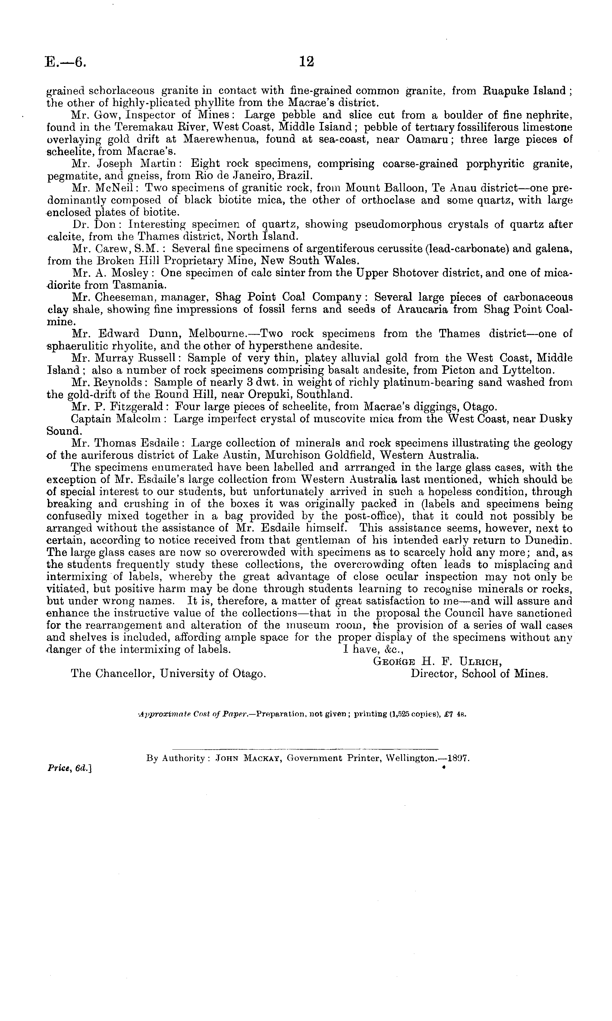 grained schorlaceous granite in contact with fine-grained common granite, from Ruapuke Island ; the other of highly-plicated phyllite from the Macrae's district. Mr. Gow, Inspector of Mines: Large pebble and slice cut from a boulder of fine nephrite, found in the Teremakau River, West Coast, Middle Island ; pebble of tertiary fossiliferous limestone overlaying gold drift at Maerewhenua, found at sea-coast, near Oamaru; three large pieces of scheelite, from Macrae's. Mr. Joseph Martin : Eight rock specimens, comprising coarse-grained porphyritic granite, pegmatite, and gneiss, from Eio de Janeiro, Brazil. Mr. McNeil: Two specimens of granitic rock, from Mount Balloon, Te Anau district —one predominantly composed of black biotite mica, the other of orthoclase and some quartz, with large enclosed plates of biotite. Dr. Don : Interesting specimen of quartz, showing pseudomorphous crystals of quartz after calcite, from the Thames district, North Island. Mr. Carew, S.M. : Several fine specimens of argentiferous cerussite (lead-carbonate) and galena, from the Broken Hill Proprietary Mine, New South Wales. Mr. A. Mosley : One specimen of calc sinter from the Upper Shotover district, and one of micadiorite from Tasmania. Mr. Cheeseman, manager, Shag Point Coal Company : Several large pieces of carbonaceous clay shale, showing fine impressions of fossil ferns and seeds of Araucaria from Shag Point Coalmine. Mr. Edward Dunn, Melbourne.—Two rock specimens from the Thames district—one of sphaerulitic rhyolite, and the other of hypersthene andesite. Mr. Murray Eussell: Sample of very thin, platey alluvial gold from the West Coast, Middle Island ; also a number of rock specimens comprising basalt andesite, from Picton and Lyttelton. Mr. Eeynolds : Sample of nearly 3 dwt, in weight of richly platinum-bearing sand washed from the gold-drift of the Round Hill, near Orepuki, Southland. Mr. P. Fitzgerald: Four large pieces of scheelite, from Macrae's diggings, Otago. Captain Malcolm : Large imperfect crystal of muscovite mica from the West Coast, near Dusky Sound. Mr. Thomas Esdaile : Large collection of minerals and rock specimens illustrating the geology of the auriferous district of Lake Austin, Murchison Goldfield, Western Australia. The specimens enumerated have been labelled and arrranged in the large glass cases, with the exception of Mr. Esdaile's large collection from Western Australia last mentioned, which should be of special interest to our students, but unfortunately arrived in such a hopeless condition, through breaking and crushing in of the boxes it was originally packed in (labels and specimens being confusedly mixed together in a bag provided by the post-office), that it could not possibly be arranged without the assistance of Mr. Esdaile himself. This assistance seems, however, next to certain, according to notice received from that gentleman of his intended early return to Dunedin. The large glass cases are now so overcrowded with specimens as to scarcely hold any more; and, as the students frequently study these collections, the overcrowding often leads to misplacing and intermixing of labels, whereby the great advantage of close ocular inspection may not only be vitiated, but positive harm may be done through students learning to recognise minerals or rocks, but under wrong names. It is, therefore, a matter of great satisfaction to me—and will assure and enhance the instructive value of the collections —that in the proposal the Council have sanctioned for the rearrangement and alteration of the museum room, the provision of a series of wall cases and shelves is included, affording ample space for the proper display of the specimens without any danger of the intermixing of labels. I have, Ac, Geoßge H. F. Ulrich, The Chancellor, University of Otago. Director, School of Mines. •Approximate Cost of Paper. —Preparation, not given ; printing (1/32.1 copies), £7 4s.