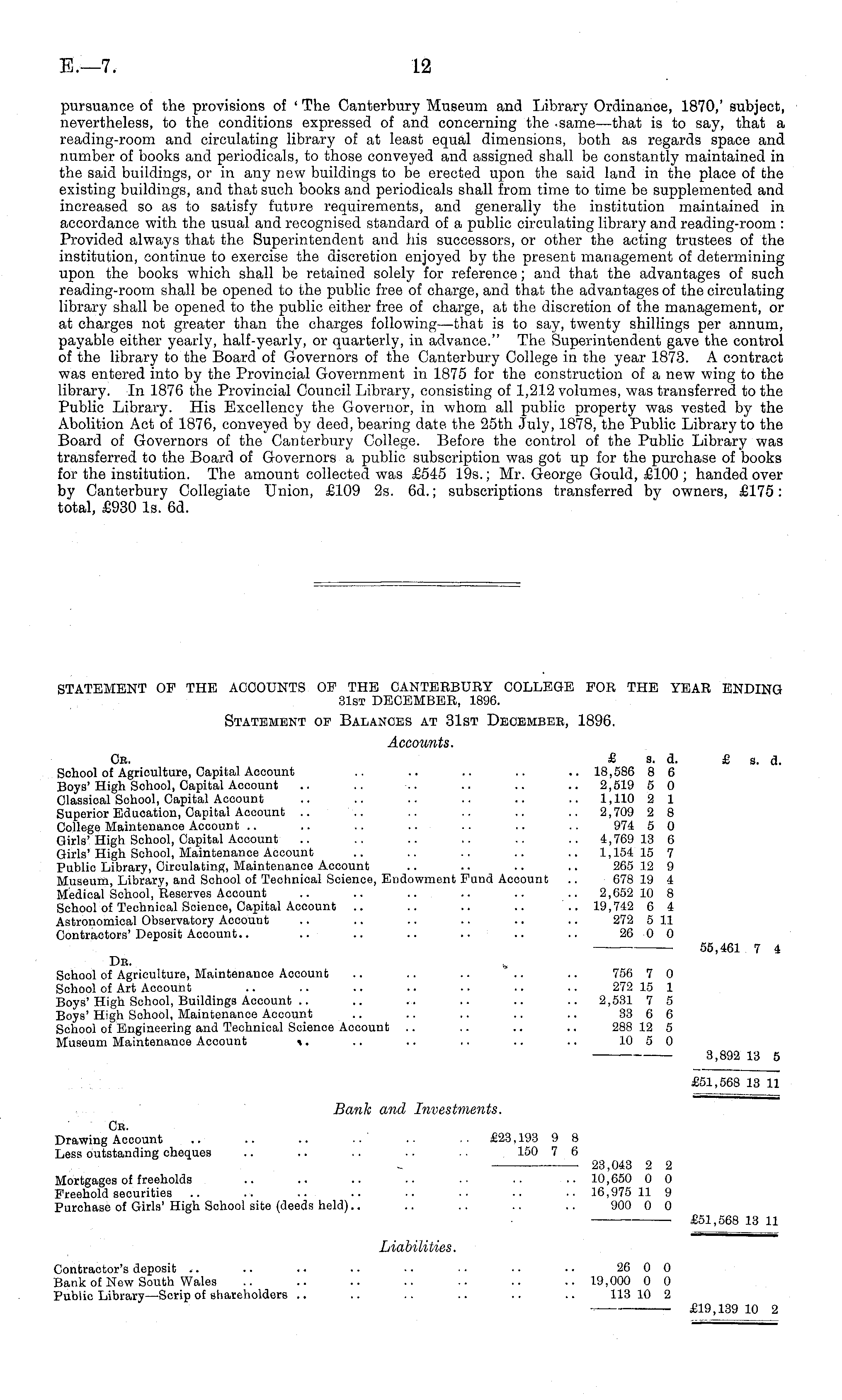 STATEMENT OF THE ACCOUNTS OP THE CANTERBURY COLLEGE FOR THE YEAR ENDING 31st DECEMBER, 1896. Statement op Balances at 31st December, 1896. Accounts. Cb. £ s. d. £ s. d. School of Agriculture, Capital Account .. .. .. .. .. 18,586 8 6 Boys' High School, Capital Account .. .. .. .. .. .. 2,519 5 0 Classical School, Capital Account .. .. .. .. .. .. 1,110 2 1 Superior Education, Capital Account .. .. .. .. .. .. 2,709 2 8 College Maintenance Account .. .. .. .. .. .. .. 974 5 0 Girls' High School, Capital Account .. .. .. .. .. .. 4,769 13 6 Girls' High School, Maintenance Account .. .. .. .. .. 1,154 15 7 Public Library, Circulating, Maintenance Account .. .. .. .. 265 12 9 Museum, Library, and School of Technical Science, Endowment Fund Account .. 678 19 4 Medical School, Reserves Account .. .. ... .. .. .. 2,652 10 8 School of Technical Science, Capital Account .. .. .. .. '.. 19,742 6 4 Astronomical Observatory Account .. .. .. .. .. .. 272 511 Contractors' Deposit Account.. .. .. .. .. .. .. 26 0 0 55,461 7 4 Db. School of Agriculture, Maintenance Account .. .. .. .. .. 756 7 0 School of Art Account .. .. .. .. .. .. .. 272 15 1 Boys' High School, Buildings Account .. .. .. .. .. .. 2,531 7 5 Boys' High School, Maintenance Account .. .. .. .. .. 33 6 6 School of Engineering and Technical Science Account .. .. .. .. 288 12 5 Museum Maintenance Account *. .. .. .. .. .. 10 5 0 3,892 13 5 £51,568 13 11 Bank and Investments. Cb. Drawing Account .. .. .. ..' .. .. £23,193 9 8 Less outstanding cheques .. .. .. .. .. 150 7 6 23,043 2 2 Mortgages of freeholds .. .. .. .. .. .. .. 10,650 0 0 Freehold securities .. .-. .. .. •• ■• •• .. 16,975 11 9 Purchase of Girls' High School site (deeds held).. .. .. .. .. 900 0 0 ■ £51,568 13 11 Liabilities. Contractor's deposit .. .. .. .. •. ■ • ■ • • • 26 0 0 Bank of New South Wales .. .. .. .. .. .. .. 19,000 0 0 Public Library—Scrip of shareholders .. .. .. .. .. .. 113 10 2 £19,139 10 2