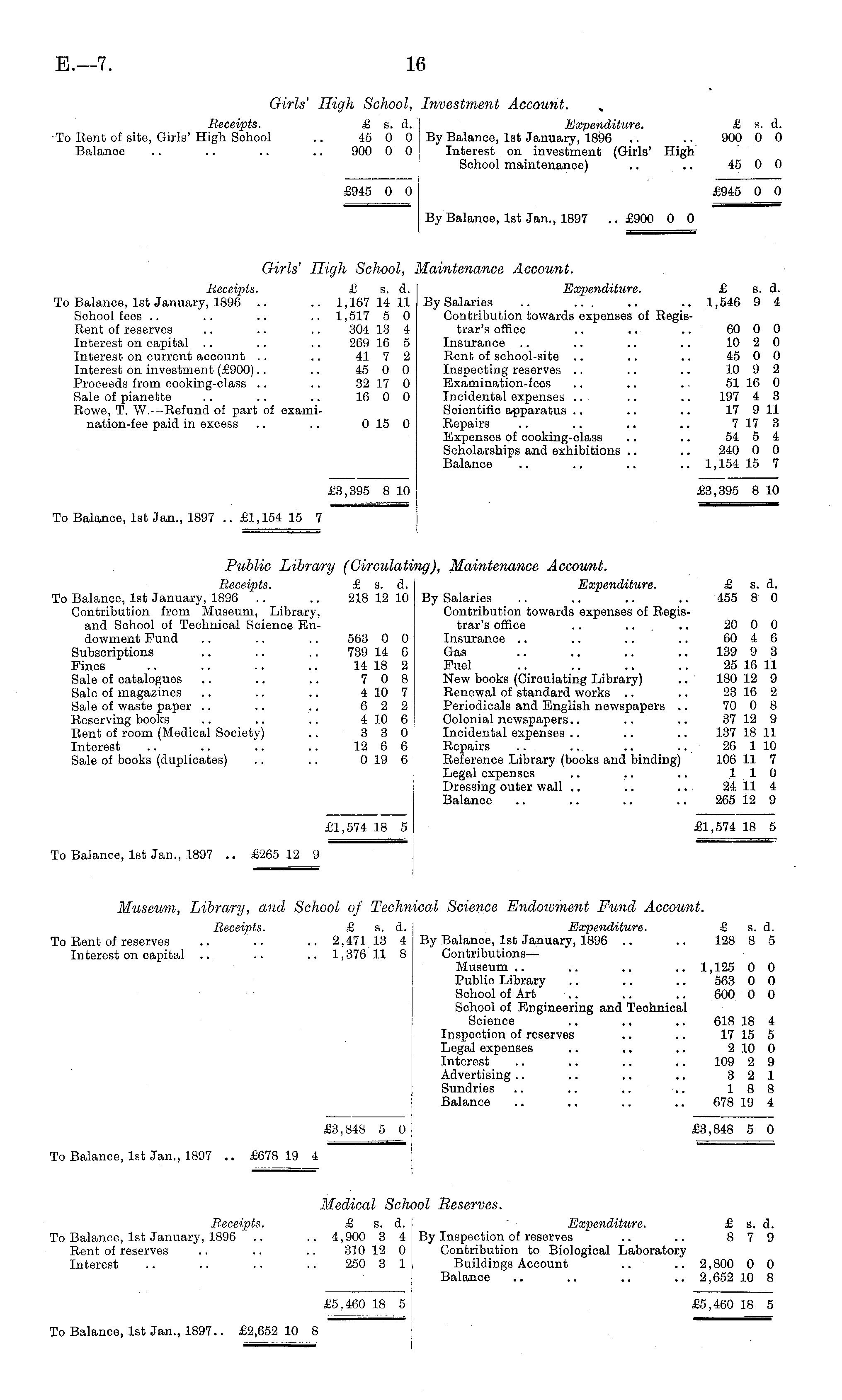 Girls' High School, Investment Account. Receipts. £ s. d. Expenditure. £ s. d. To Rent of site, Girls' High School .. 45 0 0 By Balance, Ist January, 1896 .. .. 900 0 0 Balance .. .. .. .. 900 0 0 Interest on investment (Girls' High School maintenance) .. .. 45 0 0 £945 0 0 £945 0 0 By Balance, Ist Jan., 1897 ..£9OO 0 0 Girls' High School, Maintenance Account. Receipts. £ s. d. Expenditure. £ s. d. To Balance, Ist January, 1896 .. .. 1,167 14 11 By Salaries .. .. 1,546 9 4 School fees .. .. .. .. 1,517 5 0 Contribution towards expenses of RegisRent of reserves .. .. .. 304 18 4 trar's office .. .. .. 60 0 0 Interest on capital .. .. .. 269 16 5 Insurance .. .. .. .. 10 2 0 Interest on current account .. .. 41 7 2 Rent of school-site .. .. .. 45 0 0 Interest on investment (£900).. .. 45 0 0 Inspecting reserves .. .. .. 10 9 2 Proceeds from cooking-class .. .. 32 17 0 Examination-fees .. .. .. 51 16 0 Sale of pianette .. .. .. 16 0 0 Incidental expenses .. .. .. 197 4 3 Rowe, T. W.—Refund of part of exami- Scientific apparatus .. .. .. 17 9 11 nation-fee paid in excess .. .. 015 0 Repairs .. .. .. .. 717 3 Expenses of cooking-class .. .. 54 5 4 Scholarships and exhibitions .. .. 240 0 0 Balance .. .. .. .. 1,154 15 7 £3,395 8 10 £3,395 8 10 To Balance, Ist Jan., 1897 .. £1,154 15 7 Public Library (Circulating), Maintenance Account. Receipts. £ s. d. Expenditure. £ s. d. To Balance, Ist January, 1896 .. .. 218 12 10 By Salaries .. .. .. .. 455 8 0 Contribution from Museum, Library, Contribution towards expenses of Regisand School of Technical Science En- trar's office .. ... .. 20 0 0 dowment Fund .. .. .. 563 0 0 Insurance .. .. .. .. 60 4 6 Subscriptions .. .. .. 739 14 6 Gas .. .. .. .. 139 9 3 Fines .. .. .. .. 14 18 2 Fuel .. .. .. .. 25 16 11 Sale of catalogues .. .. .. 7 0 8 New books (Circulating Library) .. 180 12 9 Sale of magazines .. .. .. 410 7 Renewal of standard works .. .. 23 16 2 Sale of waste paper .. .. .. 6 2 2 Periodicals and English newspapers .. 70 0 8 Reserving books .. .. .. 4 10 6 Colonial newspapers.. .. .. 37 12 9 Rent of room (Medical Society) .. 3 3 0 Incidental expenses .. .. .. 137 18 11 Interest .. .. .. .. 12 6 6 Repairs .. .. .. .. 26 1 10 Sale of books (duplicates) .. .. 019 6 Reference Library (books and binding) 106 11 7 Legal expenses .. .. .. 110 Dressing outer wall .. .. .. 24 11 4 Balance .. .. .. .. 265 12 9 £1,574 18 5 £1,574 18 5 To Balance, Ist Jan., 1897 .. £265 12 9 Museum, Library, and School of Technical Science Endowment Fitnd Account. Receipts. £ s. d. Expenditure. £ s. d. To Rent of reserves .. .. .. 2,47113 4 By Balance, Ist January, 1896 .. .. 128 8 5 Interest on capital .. .. .. 1,376 11 8 Contributions — Museum .. .. .. .. 1,125 0 0 Public Library .. .. .. 563 0 0 School of Art .. .. .. 600 0 0 School of Engineering and Technical Science .. .. .. 618 18 4 Inspection of reserves .. .. 17 15 5 Legal expenses .. .. .. 210 0 Interest .. .. .. .. 109 2 9 Advertising.. .. .. .. 3 2 1 Sundries .. .. ..- .. 188 Balance .. .. .. .. 678 19 4 £3,848 5 0 £3,848 5 0 To Balance, Ist Jan., 1897 .. £678 19 4 Medical School Reserves. Receipts. £ s. d. Expenditure. £ s. d. To Balance, Ist January, 1896 .. .. 4,900 3 4 By Inspection of reserves .. .. 8 7 9 Rent of reserves .. .. .. 310 12 0 Contribution to Biological Laboratory Interest .. .. .. .. 250 3 1 Buildings Account .. .. 2,800 0 0 Balance .. .. .. .. 2,652 10 8 £5,460 18 5 £5,460 18 5 To Balance, Ist Jan., 1897.. £2,652 10 8