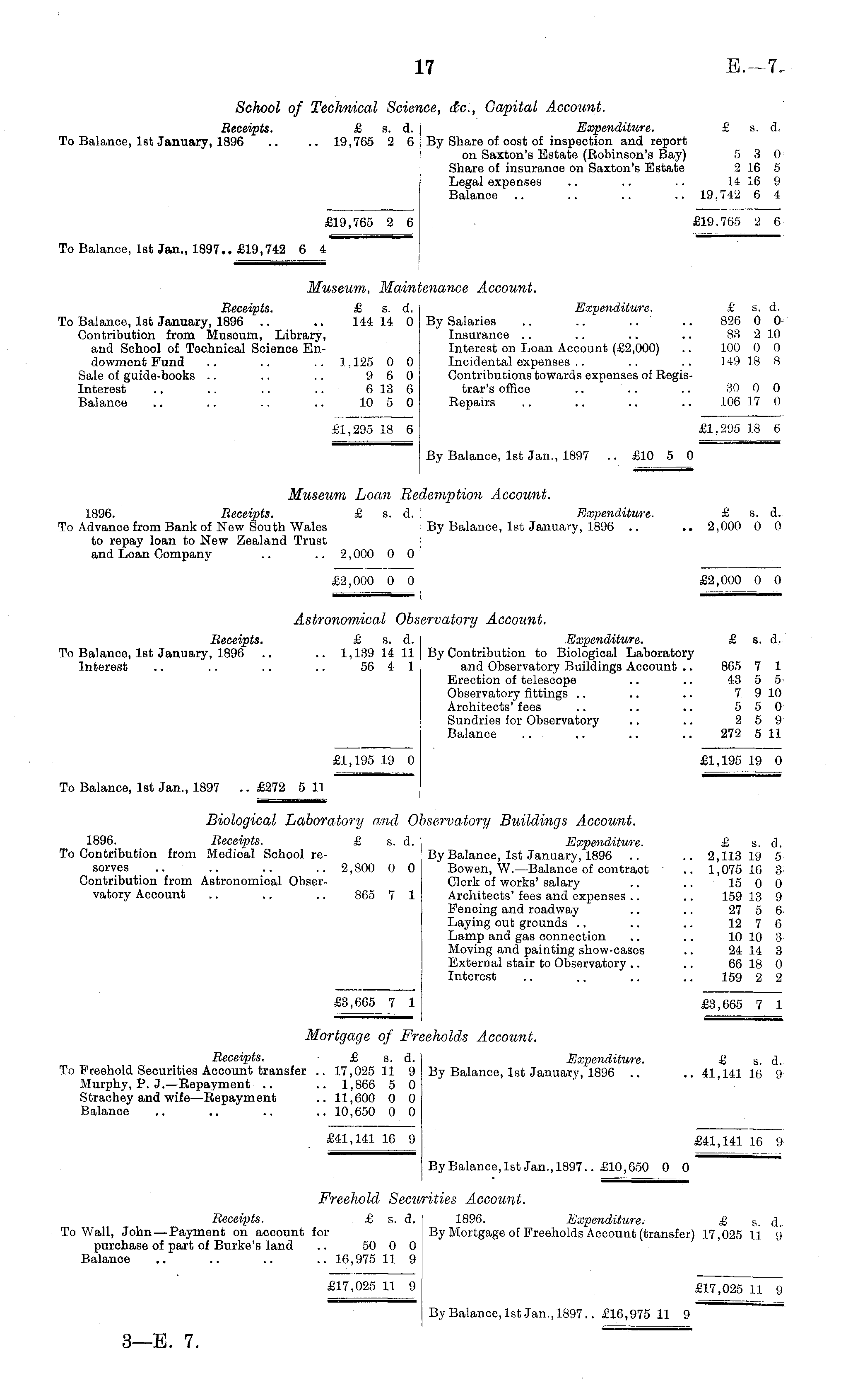 School of Technical Science, <£c, Capital Account. Receipts. £ s. d. Expenditure. £ s. d. To Balance, Ist January, 1896 .. .. 19,765 2 6 By Share of cost of inspection and report on Saxton's Estate (Robinson's Bay) 5 3 0 Share of insurance on Saxton's Estate 2 16 5 Legal expenses .. .. .. 14 16 9 Balance .. .. .. .. 19,742 6 4 £19,765 2 6 £19.765 2 6 To Balance, Ist Jan., 1897.. £19,742 6 4 Museum, Maintenance Account. Receipts. £ s. d. Expenditure. £ s. d. To Balance, Ist January, 1896 .. .. 144 14 0 By Salaries .. .. .. .. 826 0 0 Contribution from Museum, Library, Insurance .. .. .. .. 83 210 and School of Technical Science En- Interest on Loan Account (£2,000) .. 100 0 0 dowment Fund .. .. 1,125 0 0 Incidental expenses .. .. .. 149 18 8 Sale of guide-books .. .. .. 9 6 0 Contributions towards expenses of RegisInterest .. .. .. .. 6 13 6 trar's office .. .. .. 30 0 0 Balance .. .. .. .. 10 5 0 Bepairs .. .. .. .. 106 17 0 £1,295 18 6 £1,295 18 6 By Balance, Ist Jan., 1897 .. £10 5 0 Museum Loan Redemption Account. 1896. Receipts. £ s. d. Expenditure. £ s. d. To Advance from Bank of New South Wales By Balance, Ist January, 1896 .. .. 2,000 0 0 to repay loan to New Zealand Trust and Loan Company .. .. 2,000 0 0 £2,000 0 0 I £2,000 0 0 1 mm—-mmmm^ Astronomical Observatory Account. Receipts. £ s. d. I Expenditure. £ s. d. To Balance, Ist January, 1896 .. .. 1,139 14 11 IBy Contribution to Biological Laboratory Interest .. .. .. .. 56 4 1 and Observatory Buildings Account .. 865 7 1 Erection of telescope .. .. 43 5 5 Observatory fittings .. .. .. 7 9 10 Architects'fees .. .. .. 5 5 0 Sundries for Observatory .. .. 2 5 9 Balance .. .. .. .. 272 5 11 £1,195 19 0 £1,195 19 0 To Balance, Ist Jan., 1897 .. £272 511 Biological Laboratory and, Observatory Buildings Account. 1896. Receipts. £ s. d. Expenditure. £ s. d. To Contribution from Medical School re- By Balance, Ist January, 1896 .. .. 2,113 19 5 serves .. .. .. .. 2,800 0 0 Bowen, W.—Balance of contract .. 1,075 16 3 Contribution from Astronomical Obser- Clerk of works' salary .. .. 15 0 0 vatory Account .. .. .. 865 7 1 Architects' fees and expenses .. .. 159 13 9 Fencing and roadway .. .. 27 5 6 Laying out grounds .. .. .. 12 7 6 Lamp and gas connection .. .. 10 10 3 Moving and painting show-cases .. 24 14 3 External stair to Observatory .. .. 66 18 0 Interest .. .. .. .. 159 2 2 £3,665 7 1 £3,665 7 1 Mortgage of Freeholds Account. Receipts. £ s. d. Expenditure. £ s. d.. To Freehold Securities Account transfer .. 17,025 11 9 By Balance, Ist January, 1896 .. .. 41,14116 9 Murphy, P. J.—Repayment .. .. 1,866 5 0 Strachey and wife —Repayment .. 11,600 0 0 Balance .. .. .. .. 10,650 0 0 £41,141 16 J) £41,141 16 - !* By Balance, Ist Jan., 1897.. £10,650 0 0 Freehold Securities Account. Receipts. £ s. d. 1896. Expenditure. £ a. d. To Wall, John — Payment on account for By Mortgage of Freeholds Account (transfer) 17,025 li 9 purchase of part of Burkes land .. 50 0 0 Balance .. .. .. .. 16,975 11 9 £17,025 11 9 £17T025 11 9 By Balance,lst Jan.,1897.. £16,975 11 9