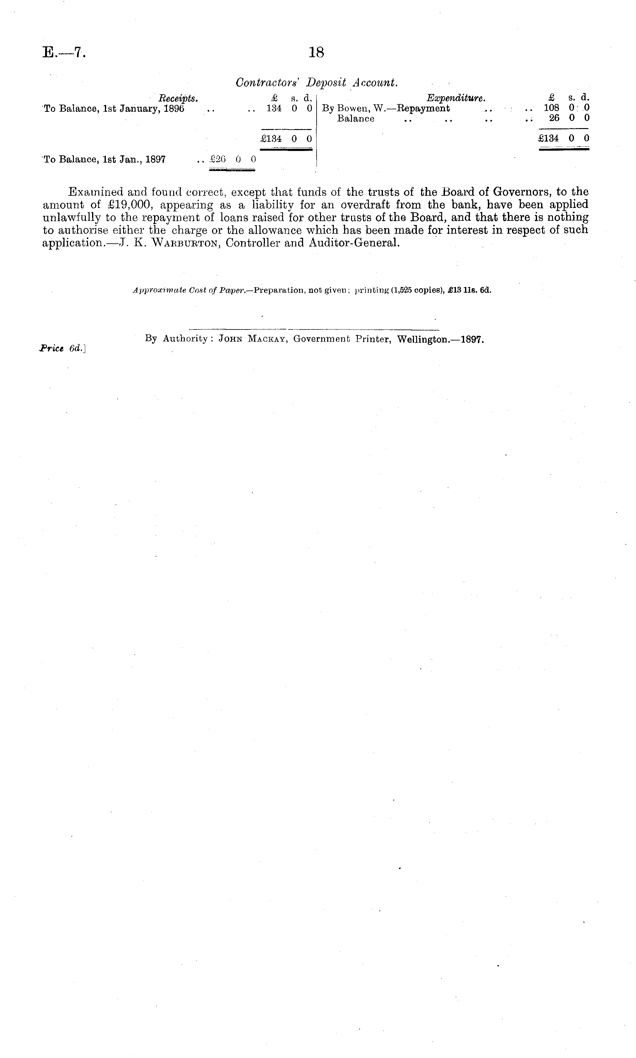 Examined and found correct, except that funds of the trusts of the Board of Governors, to the amount of £19,000, appearing as a liability for an overdraft from the bank, have been applied unlawfully to the repayment of loans raised for other trusts of the Board, and that there is nothing to authorise either the charge or the allowance which has been made for interest in respect of such application. —J. K. Wakburton, Controller and Auditor-General. Approximate Cost of Paper. —Preparation, not given ; printing (1,525 copies), £13 lis. 6d.