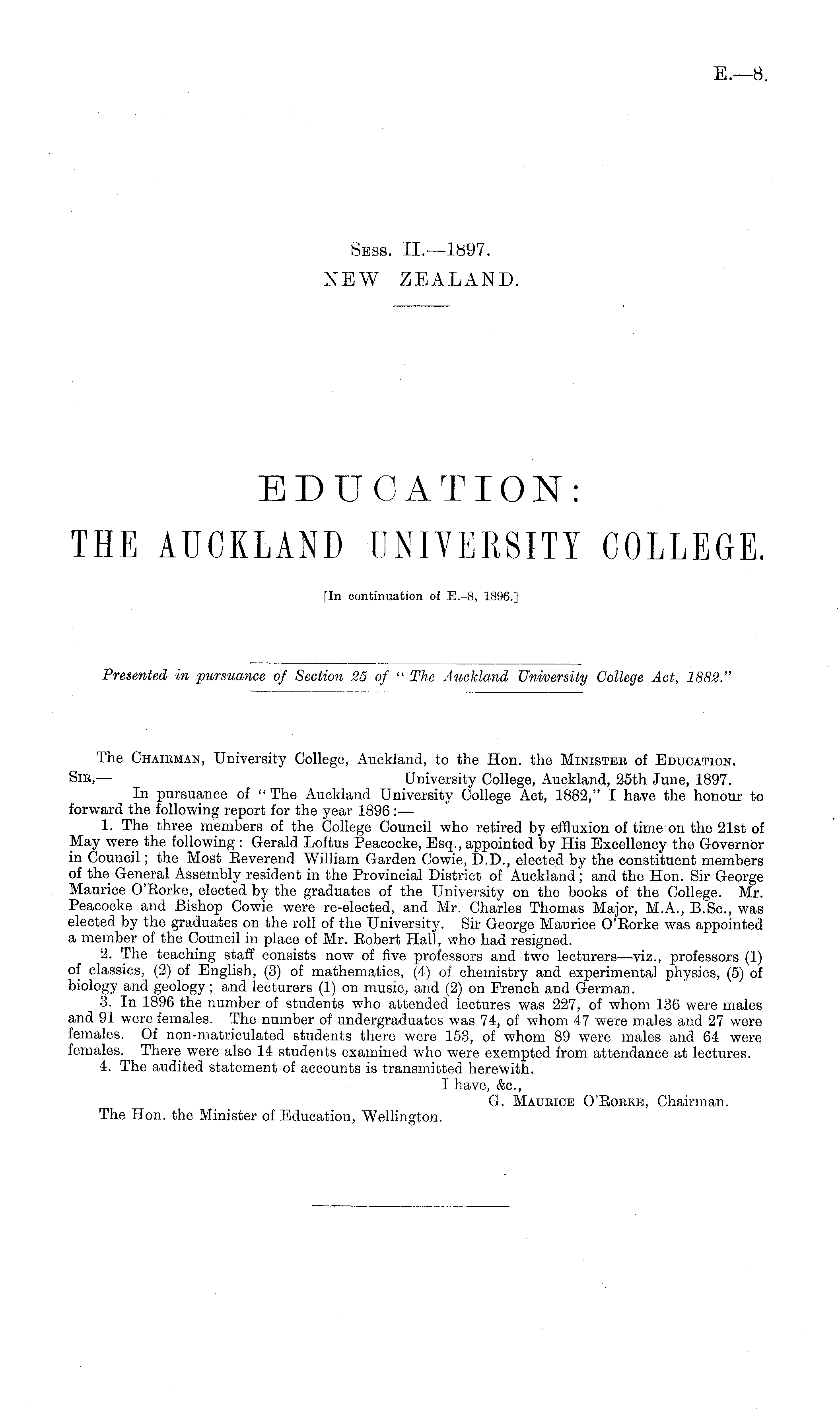 Presented in pursuance of Section 25 of " The Auckland University College Act, 1882." The Chaibman, University College, Auckland, to the Hon. the Ministeb of Education. Sib. — University College, Auckland, 25th June, 1897. In pursuance of "The Auckland University College Act, 1882," I have the honour to forward the following report for the year 1896 : — 1. The three members of the College Council who retired by effluxion of time on the 21st of May were the following : Gerald Loftus Peacocke, Esq., appointed by His Excellency the Governor in Council; the Most Beverend William Garden Cowie, D.D., elected by the constituent members of the General Assembly resident in the Provincial District of Auckland; and the Hon. Sir George Maurice O'Eorke, elected by the graduates of the University on the books of the College. Mr. Peacocke and Bishop Cowie were re-elected, and Mr. Charles Thomas Major, M.A., B.Sc, was elected by the graduates on the roll of the University. Sir George Maurice O'Eorke was appointed a member of the Council in place of Mr. Eobert Hall, who had resigned. 2. The teaching staff consists now of five professors and two lecturers—viz., professors (1) of classics, (2) of English, (3) of mathematics, (4) of chemistry and experimental physics, (5) of biology and geology; and lecturers (1) on music, and (2) on French and German. 3. In 1896 the number of students who attended lectures was 227, of whom 136 were males and 91 were females. The number of undergraduates was 74, of whom 47 were males and 27 were females. Of non-matriculated students there were 153, of whom 89 were males and 64 were females. There were also 14 students examined who were exempted from attendance at lectures. 4. The audited statement of accounts is transmitted herewith. I have, &c, G. Maurice O'Eokke, Chairman. The Hon. the Minister of Education, Wellington.