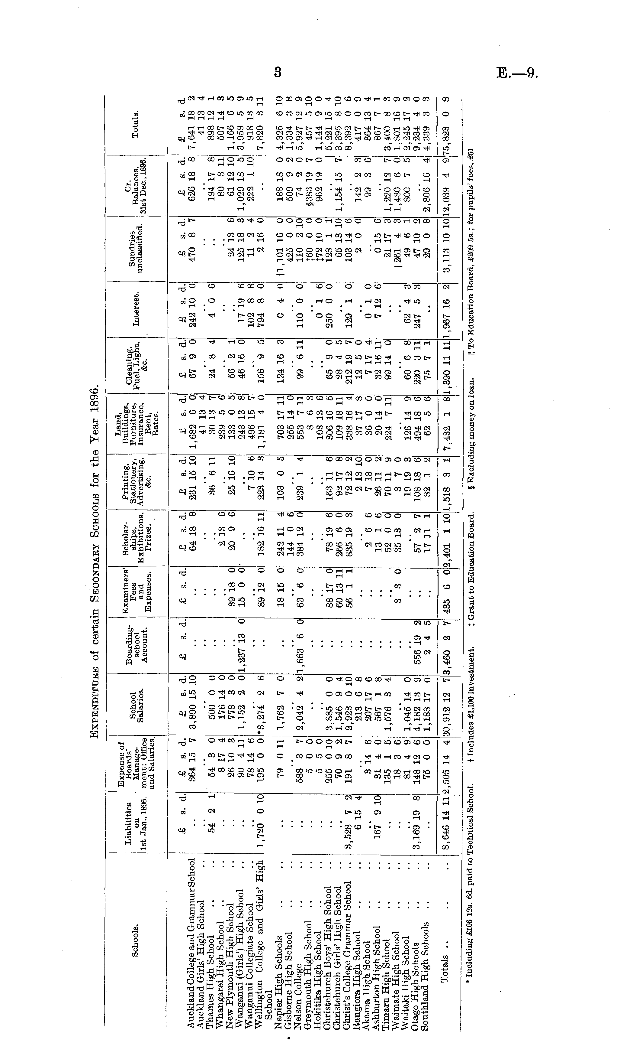 Schools. Liabilities on 1st Jan., 1896. Expense of Boards' Management: Office and Salaries. School Salaries. Boarding- Examiners' school *?, e , s Acc °™ t- Expanses, j Scholarships, Exhibitions, Prizes. Printing, Stationery, Advertising, Land, Buildings, Furniture, Insurance, Eent, Bates. Cleaning, Fuel, Light, &c. Interest. Sundries unclassified. Cr. Balances, 31st Dec, 1896. Totals. Auckland College and Grammar School Auckland Girls' High School Thames High School Whangarei High School New Plymouth High School Wanganui (Girls') High School Wanganui Collegiate School Wellington College and Girls' High School Napier High Schools Gisborne High School Nelson College Greymouth High School Hokitika High School Christchurch Boys' High School Christchurch Girls' High School Christ's College Grammar School Eangiora High School Akaroa High School Ashburton High School Timaru High School Waimate High School Waitaki High School Otago High Schools Southland High Schools £ s. d. 5l" 2 1 £ s. a. 364 15 7 . 54 3 0 8 17 4 26 10 3 90 4 11 78 14 6 1 195 0 0 £ s. a. 3,890 15 10 500 0 0 176 14 0 778 3 0 1,152 2 0 £ s. a. 1 1 £ s. a. • • I 3918 0 15 0 0 £ s. a. 64 18 8 2 13 6 20 9 6 £ s. a. 231 15 10 3e' f 6 11 25 16 10 £ s. a. 1,682 6 0 41 13 4 30 13 7 239 5 6 133 0 5 243 13 8 496 15 7 1,181 4 0 £ s. a. 67 9 0 24"8 4 56 2 1 46 16 0 £ s. a. 242 10 0 4 0 6! £ s. a. 470 8 7 24 13 6 125 18 3 11 2 4 2 16 0 £ s. a. 626 18 8 194 17 8 80 3 11 61 12 101 1,029 18 5 222 1 10: £ s. a. 7,641 18 2 41 13 4 898 12 1 507 14 3 1,166 6 5 3,959 5 9 918 13 5 7,820 3 11 il,237 13 0 7 10 6 223 14 3 i 17 19 6 102 8 8 794 8 0 1,726' 0 10 *3,274" 2 6 8912 0 182 16 11 156 9 5 "" 79 0 11 1,762 7 0 18 15 0 242 11 4 144 0 6 384 12 0 103 0 5 703 17 11 255 14 0 553 7 11 8 6 3 103 13 6 306 16 5 109 18 11 338 16 4 37 17 8 36 0 0 20 14 0 224 7 11 124 16 3 0 4 0 tl,101 16 0 425 0 0 110 2 10 +60 0 0 J72 10 0 128 1 1 65 13 10 103 14 6 2 0 0 188 18 0 509 9 2: 74 2 0 §383 19 7 962 19 0 4,325 6 10 1,334 3 8 5,927 12 9 457 5 10 1,144 9 0 5,221 15 4 3,395 8 10 8,392 0 6 417 0 9 364 13 4 867 7 1 3,400 8 3 1,801 16 9 2,245 17 2 9,234 4 0 4,339 3 3 588 3 7 5 0 0 5 5 0 255 0 10 70 9 2 191 8 7 2,042' 4 2 1,663 "6 0 63 6 0 239 "l 4 99 "6 11 110 0 0 3,885 0 0 1,546 9 4 2,923 0 10 213 6 8 207 17 6 567 1 8 1,576 3 4 88 17 0 60 13 11 56 1 1 78 19 6 266 6 0 835 19 3 163 11 6 9a 17 8 72 12 2 2 13 10 7 13 0 26 11 2 70 11 9 3 7 0 19 19 3 108 18 6 82 1 2 65 9 0 28 4 5 212 19 7 12 5 0 7 17 4 32 16 11 99 14 0 0 16 250 0 0 3,528' 7 2 6 15 4 129*1 0 1,15413 7 3 14 6 31 4 0 135 1 5 18 3 6 81 4 9 148 12 6 75 0 0 ■• 2 6 6 13 1 6 52 0 0 35 13 0 0 10 7 12 6 142 - 2 3 99 3 6 167 9 10 0 15 6 21 17 3 ||261 4 3 49 6 1 47 10 2 29 0 8 •• 3 "3 0 1,220 12 7; 1,480 6 0! 800 7 5 1 3,169 19 8 1,045 14 0 4,182 13 9 1,188 17 0 556 19 2 2 4 5 57 "2 7 17 11 1 126 14 9 494 18 6 62 5 6 60 6 8 220 3 11 75 7 1 62"4 3 247 5 3 2,806 16 4| Totals .. 8,646 14 11! 2,505 14 4 30,912 12 7; 3,460 2 7 435 6 0 ,2,401 1 10 1,518 3 1 7,432 1 8 1,390 11 11 1,967 16 2 3,113 10 10 12,039 4 9|75,823 0 8 • Including £106 12s. 6d. paid to Technical School. t lucli iSes £1,100 investment. t Grant to Education Board. § Excluding money on loan. ]| To Education Board, £209 5s.; lor pupils' fees, £51