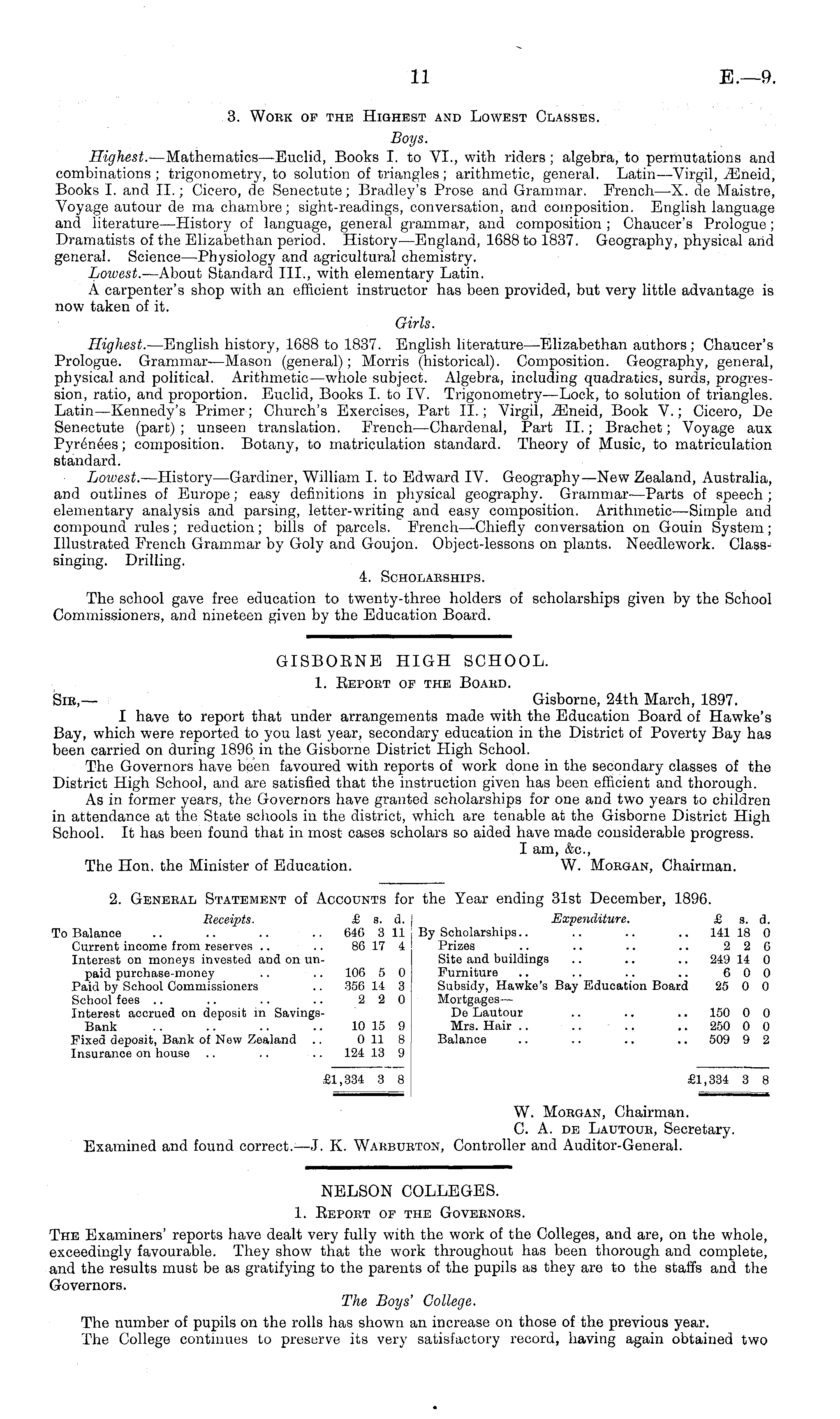 2. General Statement of Accounts for the Year ending 31st December, 1896. Receipts. £ s. d..| Expenditure. £ s. d. To Balance .. .. .. ..646 311j By Scholarships.. .. .. .. 141 18 0 Current income from reserves .. .. 86 17 4 j Prizes . ■ .. .. .. 22 6 Interest on moneys invested and on un- Site and buildings .. .. .. 249 14 0 paid purchase-money .. .. 106 5 0 Furniture .. .. .. .. 6 0 0 Paid by School Commissioners .. 356 14 3 Subsidy, Hawke's Bay Education Board 25 0 0 School fees .. .. .. .. 2 2 0 Mortgages— Interest accrued on deposit in Savings- De Lautour .. .. .. 150 0 0 Bank .. .. .. .. 10 15 9 Mrs. Hair .. .. .. 250 0 0 Fixed deposit, Bank of New Zealand .. 011 8 Balance .. .. .. .. 509 9 2 Insurance on house .. .. .. 124 13 9 £1,334 8 8 £1,334 3 8 W. Moegan, Chairman. C. A. de Lautour, Secretary. Examined and found correct.- —J. K. Wakburton, Controller and Auditor-General.