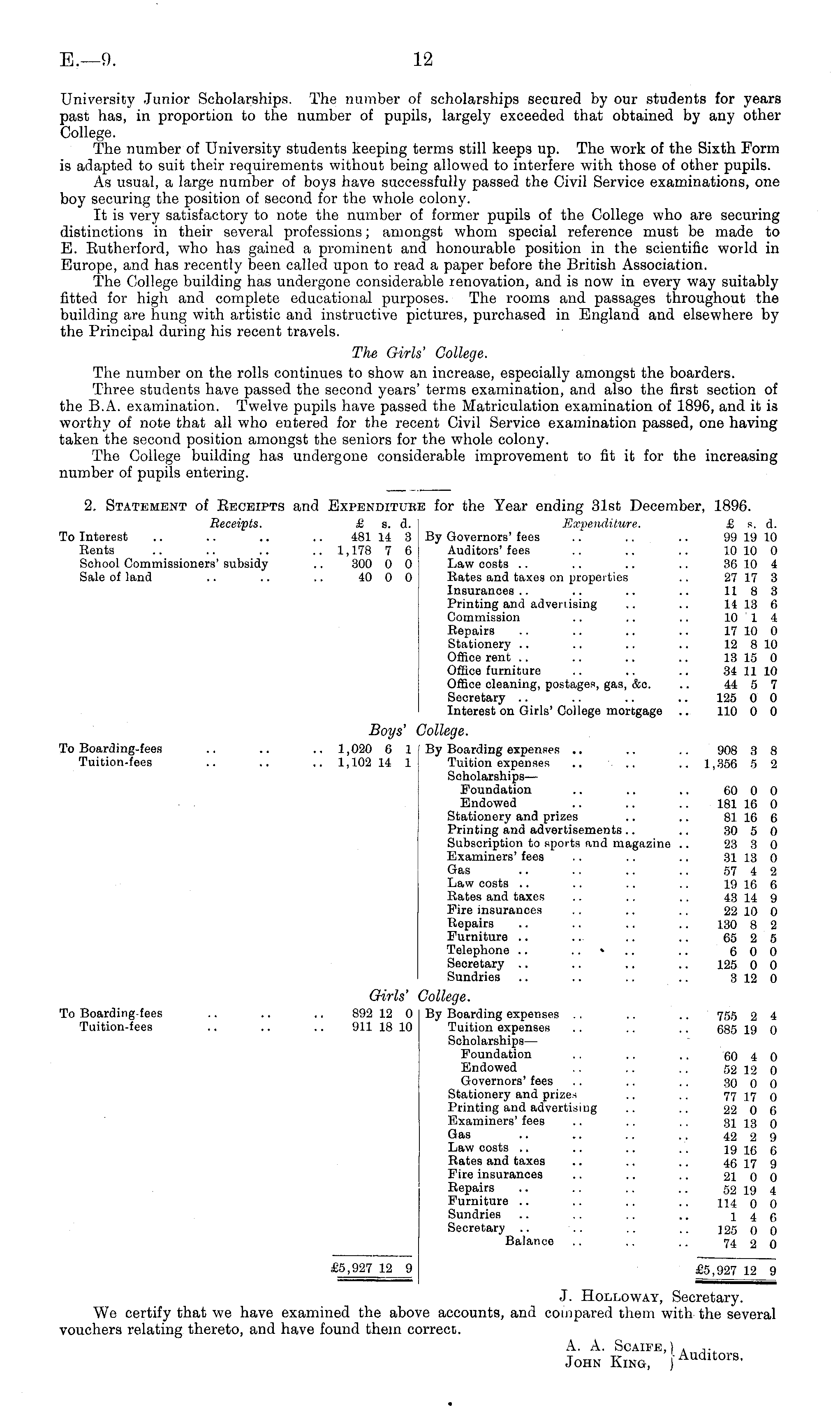 2. Statement of Eecbipts and Bxpendituee for the Year ending 31st December, 1896. Receipts. £ s. d. Expenditure.. £ s. d. To Interest .. .. .. .. 481 14 3 By Governors' fees .. .. .. 99 19 10 Eents .. .. .. .. 1,178 7 6 Auditors'fees .. .. .. 10 10 0 School Commissioners' subsidy .. 300 0 0 Law costs .. .. .. .. 36 10 4 Sale of land .. .. .. 40 0 0 Kates and taxes on properties .. 27 17 3 Insurances.. .. .. .. 11 8 3 Printing and advertising .. .. 14 13 6 Commission .. .. .. 10 1 4 Repairs .. .. .. .. 17 10 0 Stationery .. .. .. .. 12 8 10 Office rent .. .. .. .. 13 15 0 Office furniture .. .. .. 34 11 10 Office cleaning, postages, gas, &c. .. 44 5 7 Secretary .. .. .. .. 125 0 0 Interest on Girls' College mortgage .. 110 0 0 Boys' College. To Boarding-fees .. .. .. 1,020 6 1■ By Boarding expenses .. .. .. 908 3 8 Tuition-fees .. .. .. 1,102 14 1 Tuition expenses .. .. .. 1,350 5 2 Scholarships— Foundation .. .. .. 60 0 0 Endowed .. .. .. 181 16 0 Stationery and prizes .. .. 81 16 6 Printing and advertisements .. .. 30 5 0 Subscription to sports and magazine .. 23 3 0 Examiners' fees .. .. .. 31 13 0 Gas .. .. .. .. 57 4 2 Law costs .. .. .. .. 19 16 6 Rates and taxes .. .. .. 43 14 9 Fire insurances .. .. .. 22 10 0 Repairs .. .. .. .. 130 8 2 Furniture .. ... .. .. 65 2 5 Telephone .. ..».. .. 600 Secretary .. .. .. .. 125 0 0 Sundries .. .. .. .. 312 0 Girls' College. To Boarding-fees .. .. .. 892 12 0 By Boarding expenses .. .. .. 755 2 4 Tuition-fees .. .. .. 911 18 10 Tuition expenses .. .. .. (535 19 q Scholarships— Foundation .. .. .. 60 4 0 Endowed .. .. .. 52 12 0 Governors' fees .. .. .. 30 0 0 Stationery and prizes .. .. 77 17 0 Printing and advertising .. .. 22 0 6 Examiners' fees .. .. .. 31 13 0 Gas .. .. .. .. 42 2 9 Law costs .. .. .. ~ 19 16 6 Rates and taxes .. .. .. 46 17 9 Fire insurances .. .. .. 21 0 0 Repairs .. .. .. .. 52 19 4 Furniture .. .. .. .. 114 q q Sundries .. .. .. .. 14 6 Secretary .. .. .. .. 125 0 0 Balance .. .. .. 74 2 0 £5,927 12 9 £5,927 12 9 J. Holloway, Secretary. We certify that we have examined the above accounts, and compared them with the several vouchers relating thereto, and have found them correct. A. A. Scaife,) . ~. John King, } Aaditor *-
