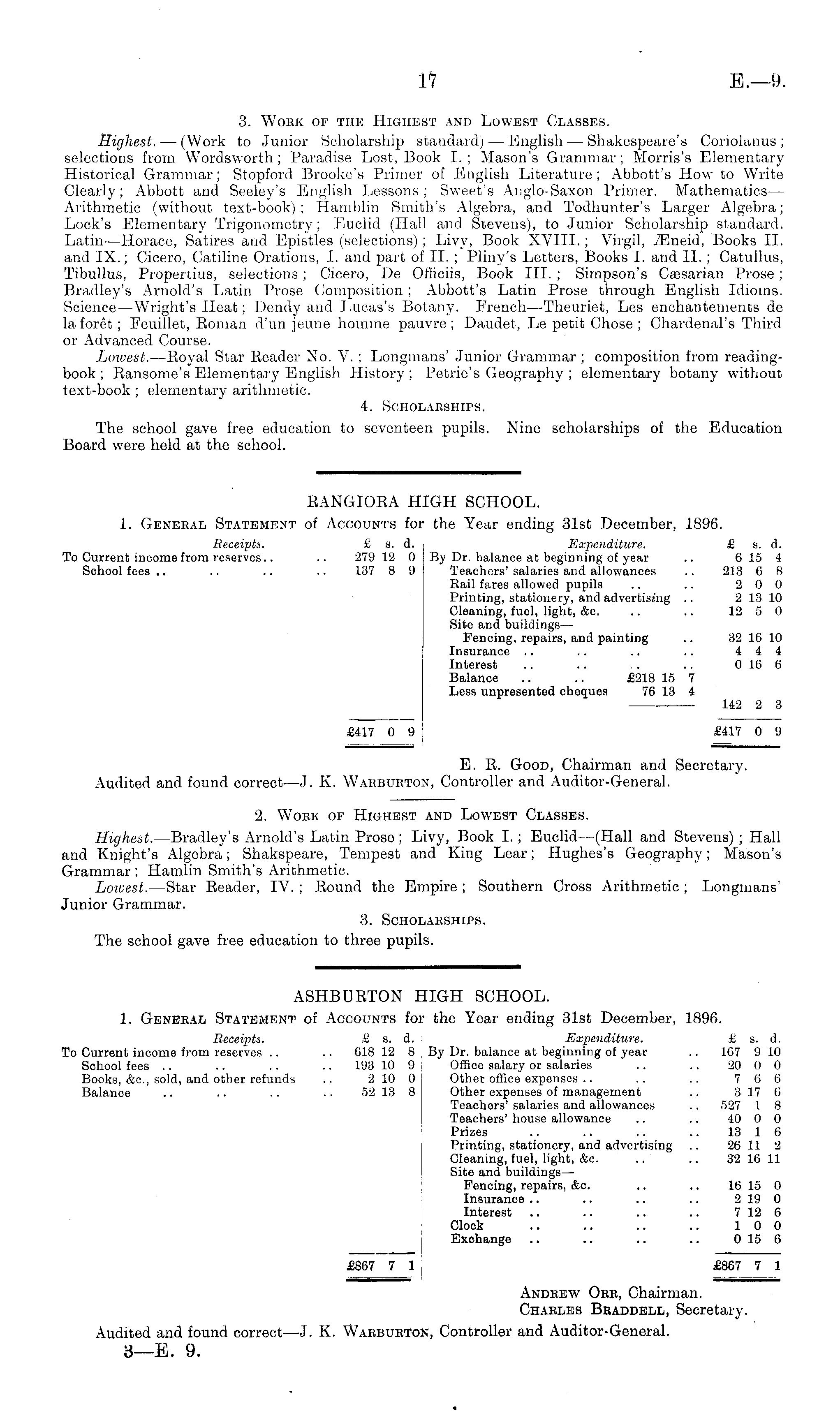 BANGIOEA HIGH SCHOOL. 1. General Statement of Accounts for the Year ending 31st December, 1896. Receipts. £ s. d. Expenditure. £ s. d. To Current income from reserves.. .. 279 12 0 By Dr. balance at beginning of year .. 6 15 4 School fees.. .. .. .. 137 8 9 Teachers'salaries and allowances .. 213 6 8 Rail fares allowed pupils .. .. 2 0 0 Printing, stationery, and advertising .. 2 13 10 Cleaning, fuel, light, &c. .. .. 12 5 0 Site and buildings— Fencing, repairs, and painting .. 32 16 10 Insurance .. .. .. .. 4 4 4 Interest .. .. . . .. 016 6 Balance .. .. £218 15 7 Less unpresented cheques 76 13 4 142 2 3 £417 0 9 £417 0 9 E. E. Good, Chairman and Secretary. Audited and found correct— J. K. Warbueton, Controller and Auditor-General.