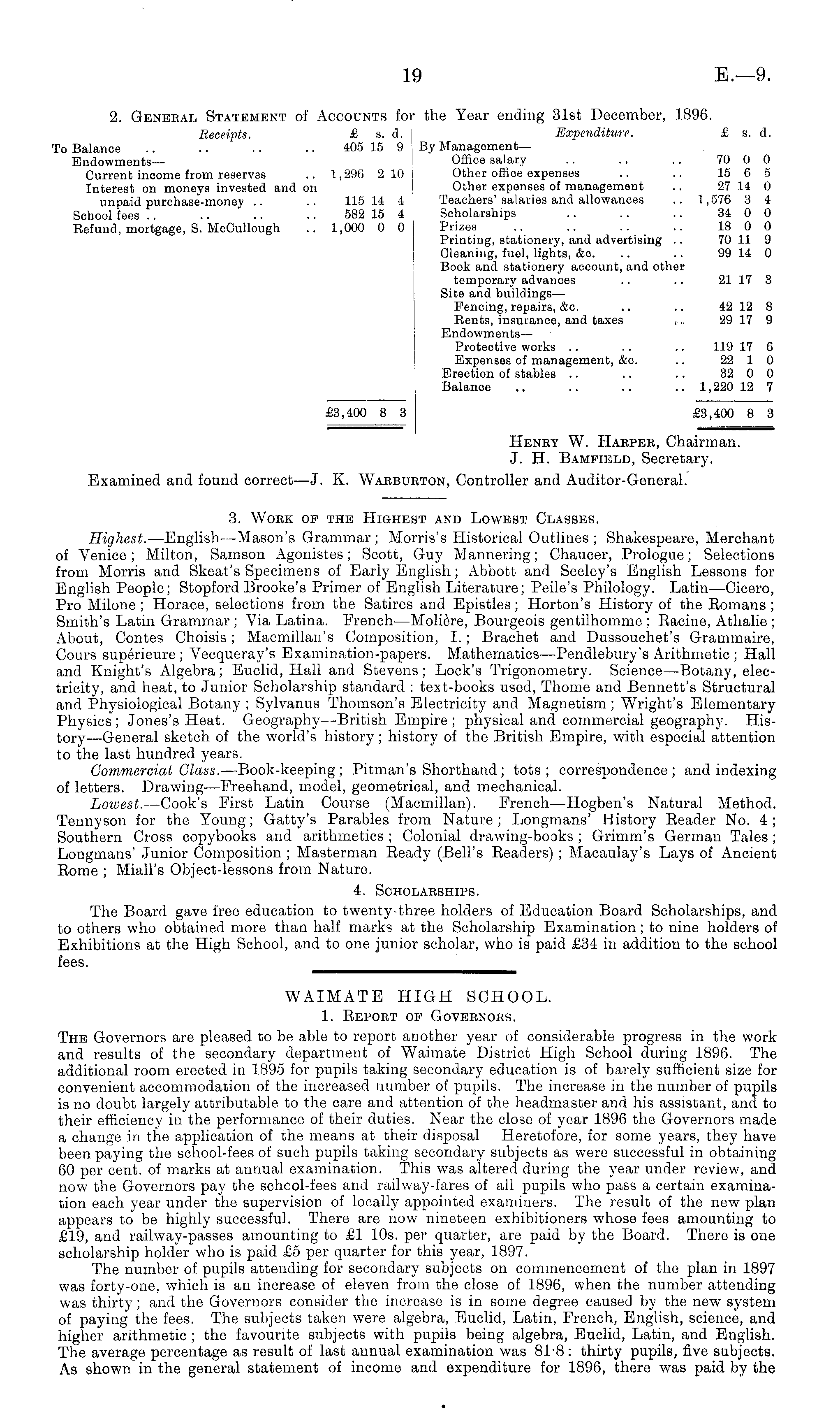 2. General Statement of Accounts for the Year ending 31st December, 1896. Receipts. £ s. d. j Expenditure. £ s. d. To Balance .. .. .. .. 405 15 9, By Management— Endowments— Office salary .. .. .. 70 0 0 Current income from reserves .. 1,296 210 Other office expenses .. .. 15 6 5 Interest on moneys invested and on Other expenses of management .. 27 14 0 unpaid purchase-money .. .. 115 14 4 Teachers'salaries and allowances .. 1,576 3 4 School fees .. .. .. .. 582 15 4 Scholarships .. .. .. 34 0 0 Refund, mortgage, S. McCullough .. 1,000 0 0 Prizes .. .. .. .. 18 0 0 Printing, stationery, and advertising .. 70 11 9 Cleaning, fuel, lights, &c. .. .. 99 14 0 Book and stationery account, and other temporary advances .. .. 21 17 3 Site and buildings— Fencing, repairs, &c. .. .. 42 12 8 Rents, insurance, and taxes ~, 29 17 9 Endowments— Protective works .. .. .. 119 17 6 Expenses of management, &c. .. 22 1 0 Erection of stables .. .. .. 32 0 0 Balance .. .. .. .. 1,220 12 7 £3,400 8 3 £3,400 8 3 Heney W. Haepee, Chairman. J. H. Bampield, Secretary. Examined and found correct— J. K. Wabbukton, Controller and Auditor-General.