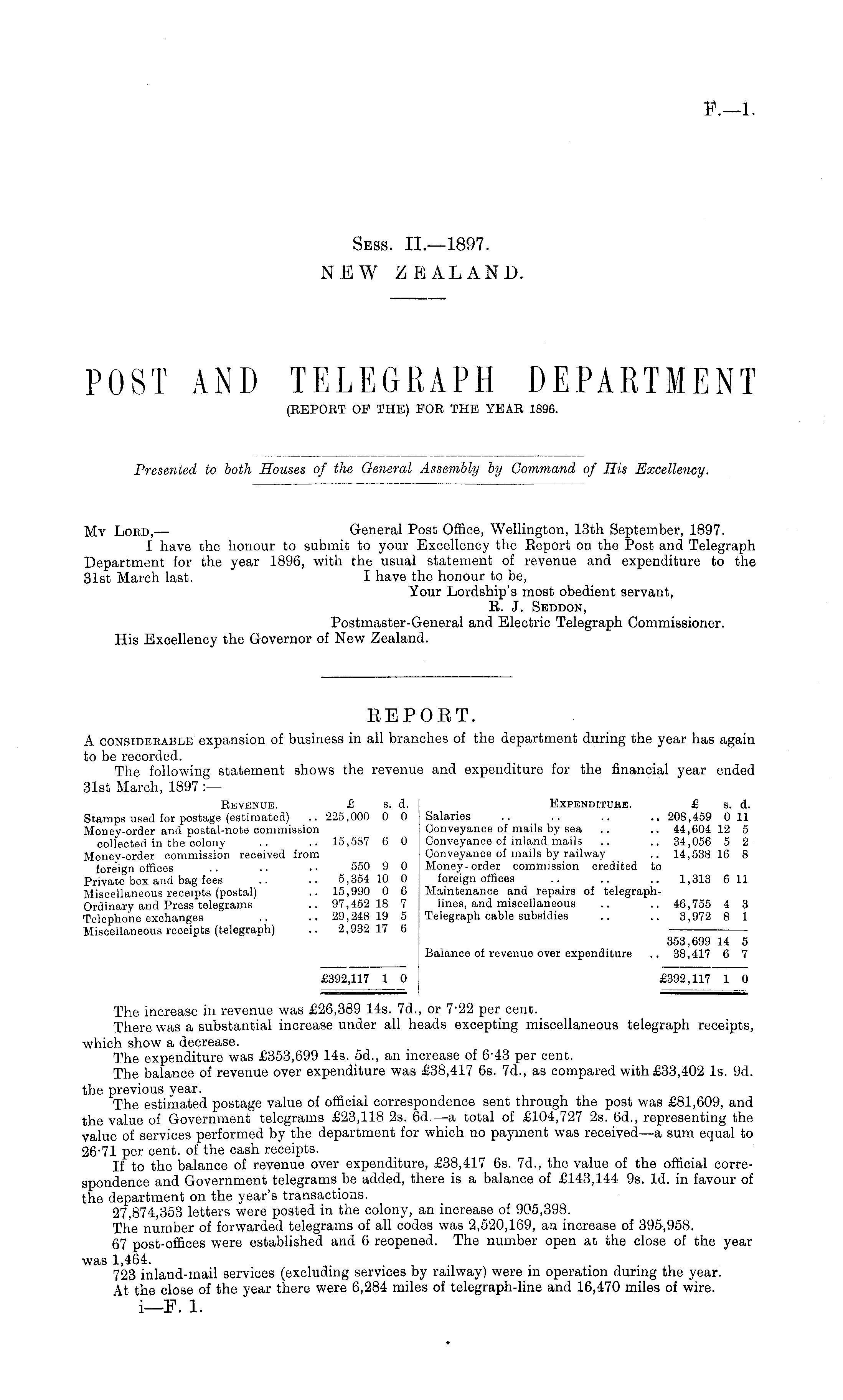 My Lokd, — General Post Office, Wellington, 13th September, 1897. I have the honour to submit to your Excellency the Report on the Post and Telegraph Department for the year 1896, with the usual statement of revenue and expenditure to the 31st March last. I have the honour to be, Your Lordship's most obedient servant, E. J. Seddon, Postmaster-General and Electric Telegraph Commissioner. His Excellency the Governor of New Zealand.