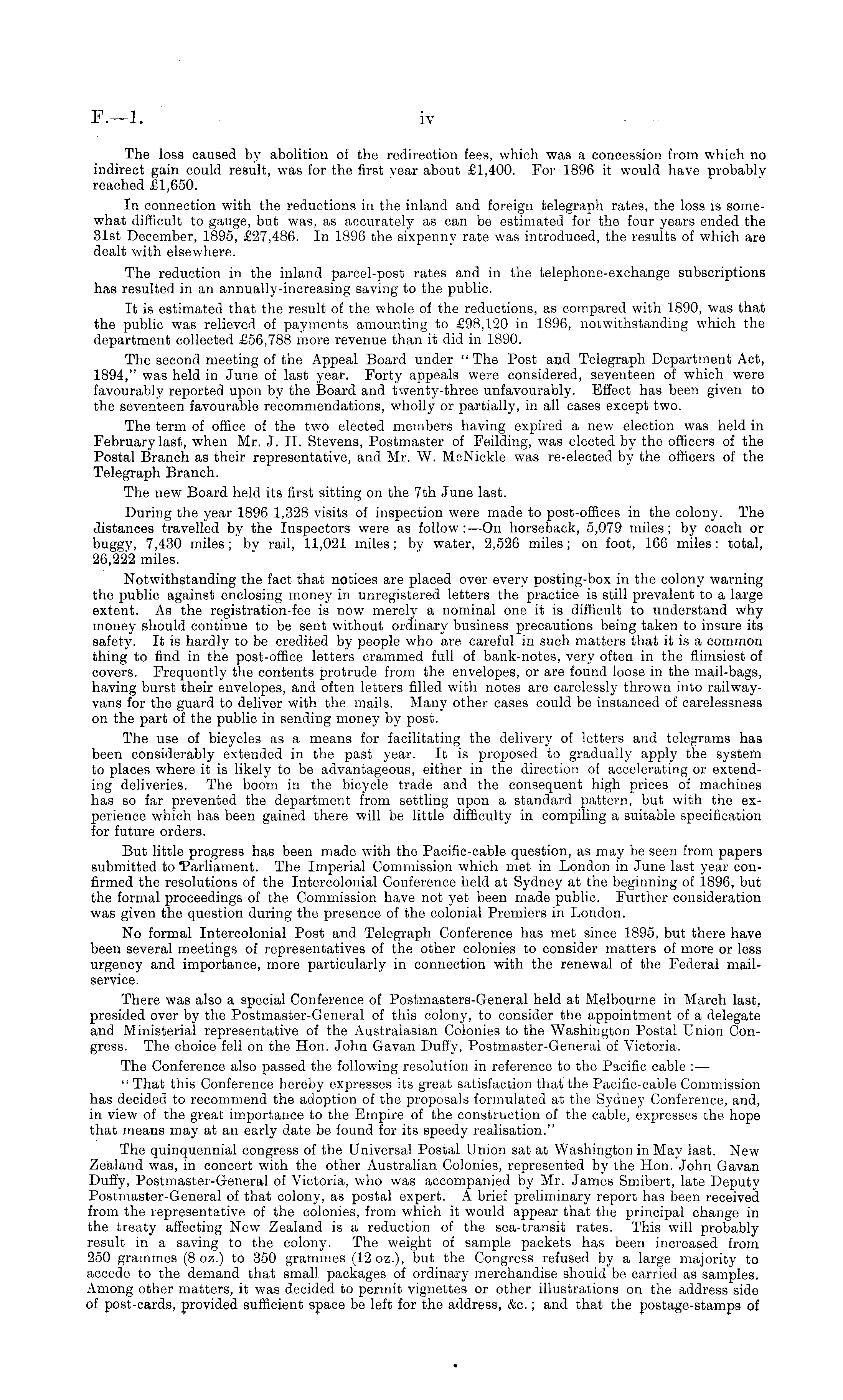 The loss caused by abolition of the redirection fees, which was a concession from which no indirect gain could result, was for the first year about £1,400. For 1896 it would have probably reached £1,650. In connection with the reductions in the inland and foreign telegraph rates, the loss is somewhat difficult to gauge, but was, as accurately as can be estimated for the four years ended the 31st December, 1895, £27,486. In 1896 the sixpenny rate was introduced, the results of which are dealt with elsewhere. The reduction in the inland parcel-post rates and in the telephone-exchange subscriptions has resulted in an annually-increasing saving to the public. It is estimated that the result of the whole of the reductions, as compared with 1890, was that the public was relieved of payments amounting to £98,120 in 1896, notwithstanding which the department collected £56,788 more revenue than it did in 1890. The second meeting of the Appeal Board under "The Post and Telegraph Department Act, 1894," was held in June of last year. Forty appeals were considered, seventeen of which were favourably reported upon by the Board and twenty-three unfavourably. Effect has been given to the seventeen favourable recommendations, wholly or partially, in all cases except two. The term of office of the two elected members having expired a new election was held in February last, when Mr. J. H. Stevens, Postmaster of Feilding, was elected by the officers of the Postal Branch as their representative, and Mr. W. McNickle was re-elected by the officers of the Telegraph Branch. The new Board held its first sitting on the 7th June last. During the year 1896 1,328 visits of inspection were made to post-offices in the colony. The distances travelled by the Inspectors were as follow: —On horseback, 5,079 miles; by coach or buggy, 7,430 miles; by rail, 11,021 miles; by water, 2,526 miles; on foot, 166 miles: total, 26,222 miles. Notwithstanding the fact that notices are placed over every posting-box in the colony warning the public against enclosing money in unregistered letters the practice is still prevalent to a large extent. As the registration-fee is now merely a nominal one it is difficult to understand why money should continue to be sent without ordinary business precautions being taken to insure its safety. It is hardly to be credited by people who are careful in such matters that it is a common thing to find in the post-office letters crammed full of bank-notes, very often in the flimsiest of covers. Frequently the contents protrude from the envelopes, or are found loose in the mail-bags, having burst their envelopes, and often letters filled with notes are carelessly thrown into railwayvans for the guard to deliver with the mails. Many other cases could be instanced of carelessness on the part of the public in sending money by post. The use of bicycles as a means for facilitating the delivery of letters and telegrams has been considerably extended in the past year. It is proposed to gradually apply the system to places where it is likely to be advantageous, either in the direction of accelerating or extending deliveries. The boom in the bicycle trade and the consequent high prices of machines has so far prevented the department from settling upon a standard pattern, but with the experience which has been gained there will be little difficulty in compiling a suitable specification for future orders. But little progress has been made with the Pacific-cable question, as may be seen from papers submitted to 'Parliament. The Imperial Commission which met in London in June last year confirmed the resolutions of the Intercolonial Conference held at Sydney at the beginning of 1896, but the formal proceedings of the Commission have not yet been made public. Further consideration was given the question during the presence of the colonial Premiers in London. No formal Intercolonial Post and Telegraph Conference has met since 1895, but there have been several meetings of representatives of the other colonies to consider matters of more or less urgency and importance, more particularly in connection with the renewal of the Federal mailservice. There was also a special Conference of Postmasters-General held at Melbourne in March last, presided over by the Postmaster-General of this colony, to consider the appointment of a delegate and Ministerial representative of the Australasian Colonies to the Washington Postal Union Congress. The choice fell on the Hon. John Gavan Duffy, Postmaster-General of Victoria. The Conference also passed the following resolution in reference to the Pacific cable : — " That this Conference hereby expresses its great satisfaction that the Pacific-cable Commission has decided to recommend the adoption of the proposals formulated at the Sydney Conference, and, in view of the great importance to the Empire of the construction of the cable, expresses the hope that means may at an early date be found for its speedy realisation." The quinquennial congress of the Universal Postal Union sat at Washington in May last. New Zealand was, in concert with the other Australian Colonies, represented by the Hon. John Gavan Duffy, Postmaster-General of Victoria, who was accompanied by Mr. James Smibert, late Deputy Postmaster-General of that colony, as postal expert. A brief preliminary report has been received from the representative of the colonies, from which it would appear that the principal change in the treaty affecting New Zealand is a reduction of the sea-transit rates. This will probably result in a saving to the colony. The weight of sample packets has been increased from 250 grammes (8 oz.) to 350 grammes (12 oz.), but the Congress refused by a large majority to accede to the demand that small packages of ordinary merchandise should be carried as samples. Among other matters, it was decided to permit vignettes or other illustrations on the address side of post-cards, provided sufficient space b