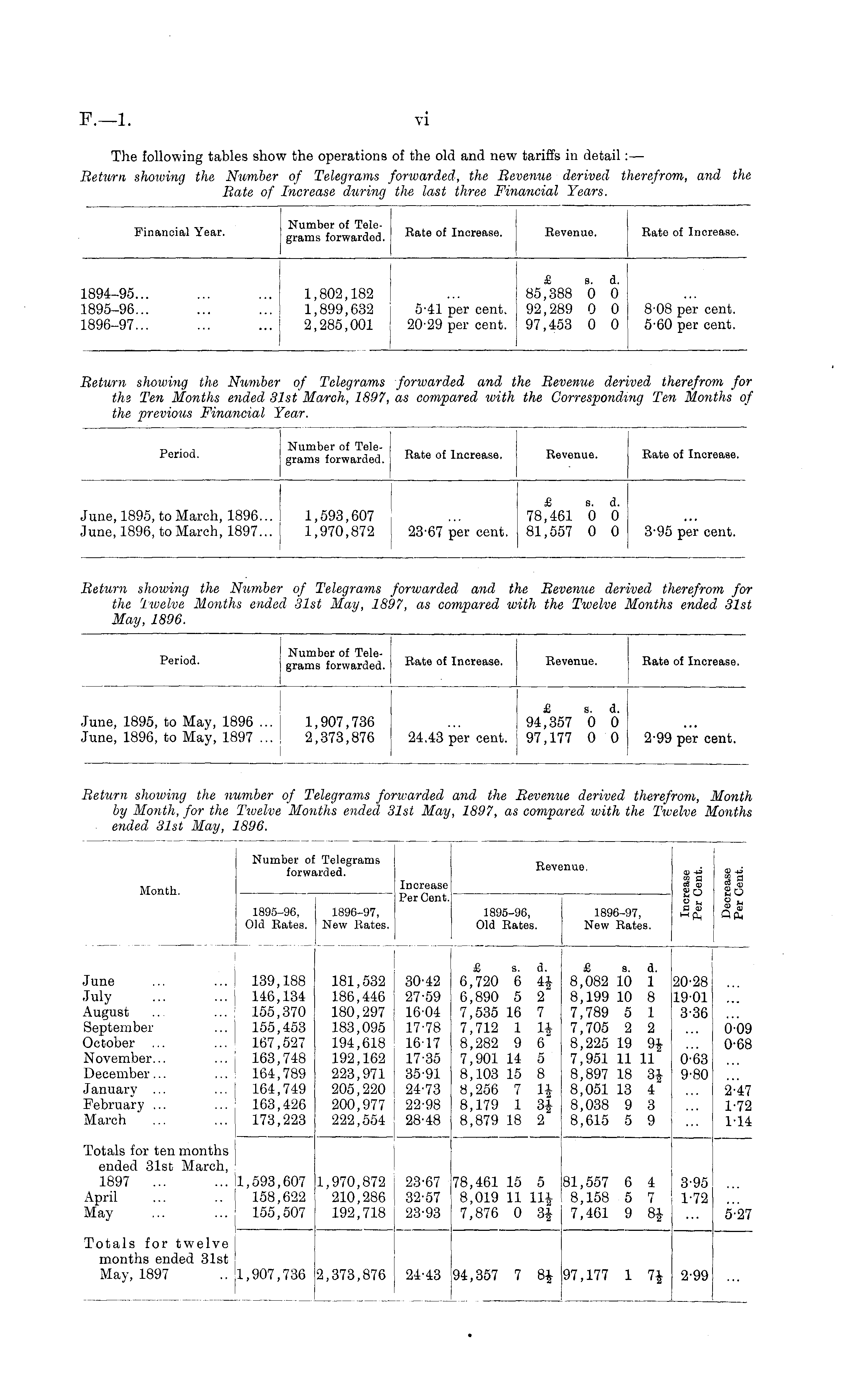 Period. Number of Telegrams forwarded. Rate of Increase. Revenue. Rate of Increase. une, 1895, to May, 1896 ... une, 1896, to May, 1897 ... 1,907,736 2,373,876 £ s. 94,357 0 97,177 0 d. 0 0 24.43 per cent. 2-99 per cent.