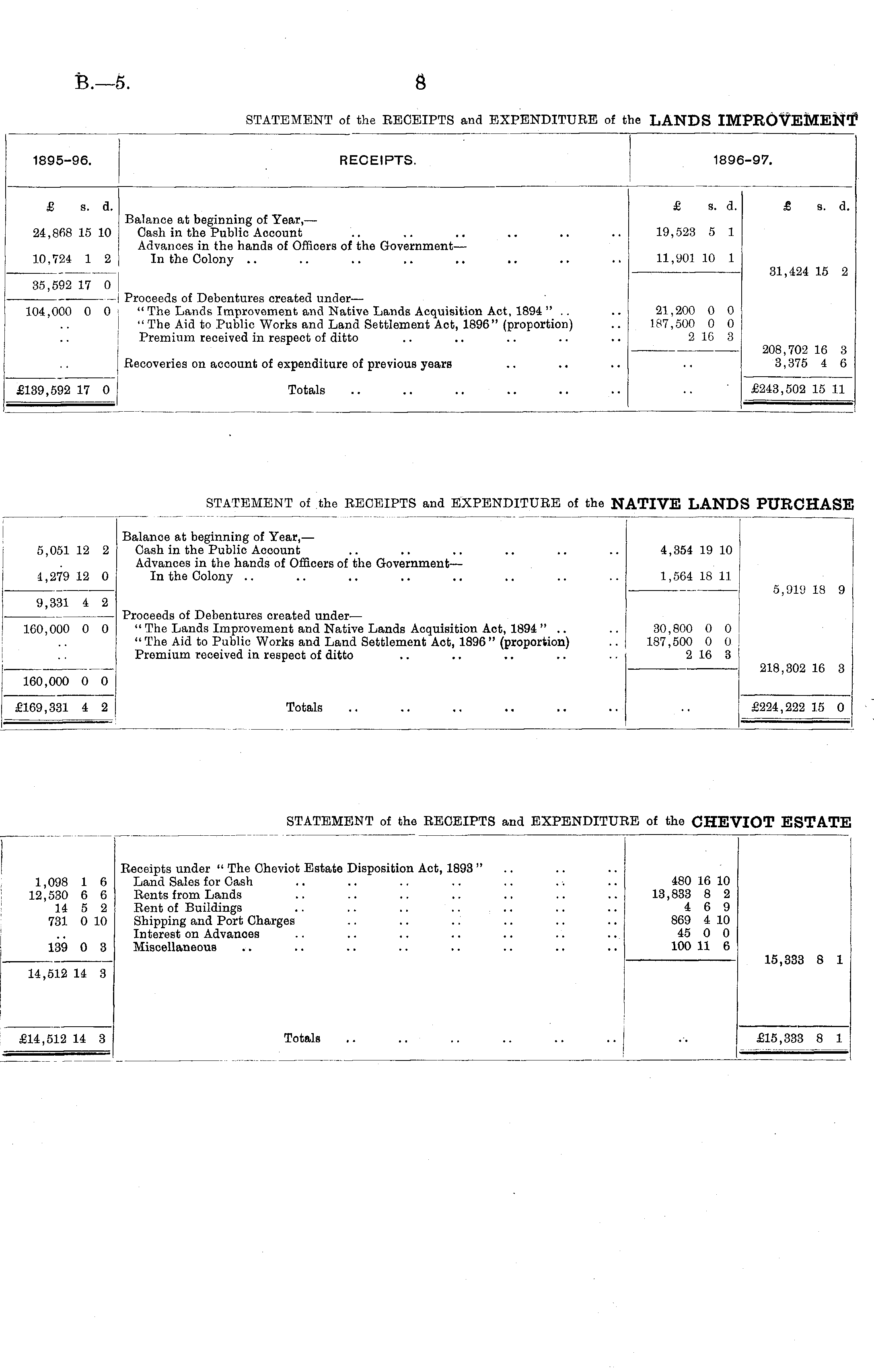 1895-96. RECEIPTS. 189 i-97. £ s. d. £ s. d. £ s. d. 24,868 15 10 10,724 1 2 Balance at beginning of Year, — Cash in the Public Account Advances in the hands of Officers of the Government — In the Colony 19,523 5 1 11,901 10 1 31,424 15 2 104,000 0 0 35,592 17 0 Proceeds of Debentures created under— "The Lands Improvement and Native Lands Acquisition Act, 1894 " .. " The Aid to Public Works and Land Settlement Act, 1896" (proportion) Premium received in respect of ditto 21,200 0 0 187,500 0 0 2 16 3 208,702 16 3 3,375 4 6 Recoveries on account of expenditure of previous years £139,592 17 0 Totals £243,502 15 11 •• STATEMENT of the BECEIPTS and EXPENDITURE of the NATIVE LANDS PURCHASE 5,051 12 2 Balance at beginning of Year, — Cash in the Public Account Advances in the hands of Officers of the Government — In the Colony 4,354 19 10 1,279 12 0 1,564 18 11 9,331 4 2 Proceeds of Debentures created under— " The Lands Improvement and Native Lands Acquisition Act, 1894 " .. " The Aid to Public Works and Land Settlement Act, 1896 " (proportion) Premium received in respect of ditto 5,919 18 9 160,000 0 0 30,800 0 0 187,500 0 0 2 16 3 218,302 16 3 160,000 0 0 Totals £169,331 4 2 £224,222 15 0 STATEMENT of the RECEIPTS and EXPENDITURE of the CHEVIOT ESTATE 1,098 1 6 12,530 6 6 14 5 2 731 0 10 Receipts under " The Cheviot Estate Disposition Act, 1893 " Land Sales for Cash Rents from Lands Rent of Buildings Shipping and Port Charges Interest on Advances Miscellaneous 480 16 10 13,833 8 2 4 6 9 869 4 10 45 0 0 100 11 6 139 0 3 15,333 8 1 14,512 14 3 Totals £14,512 14 3 £15,333 8 1