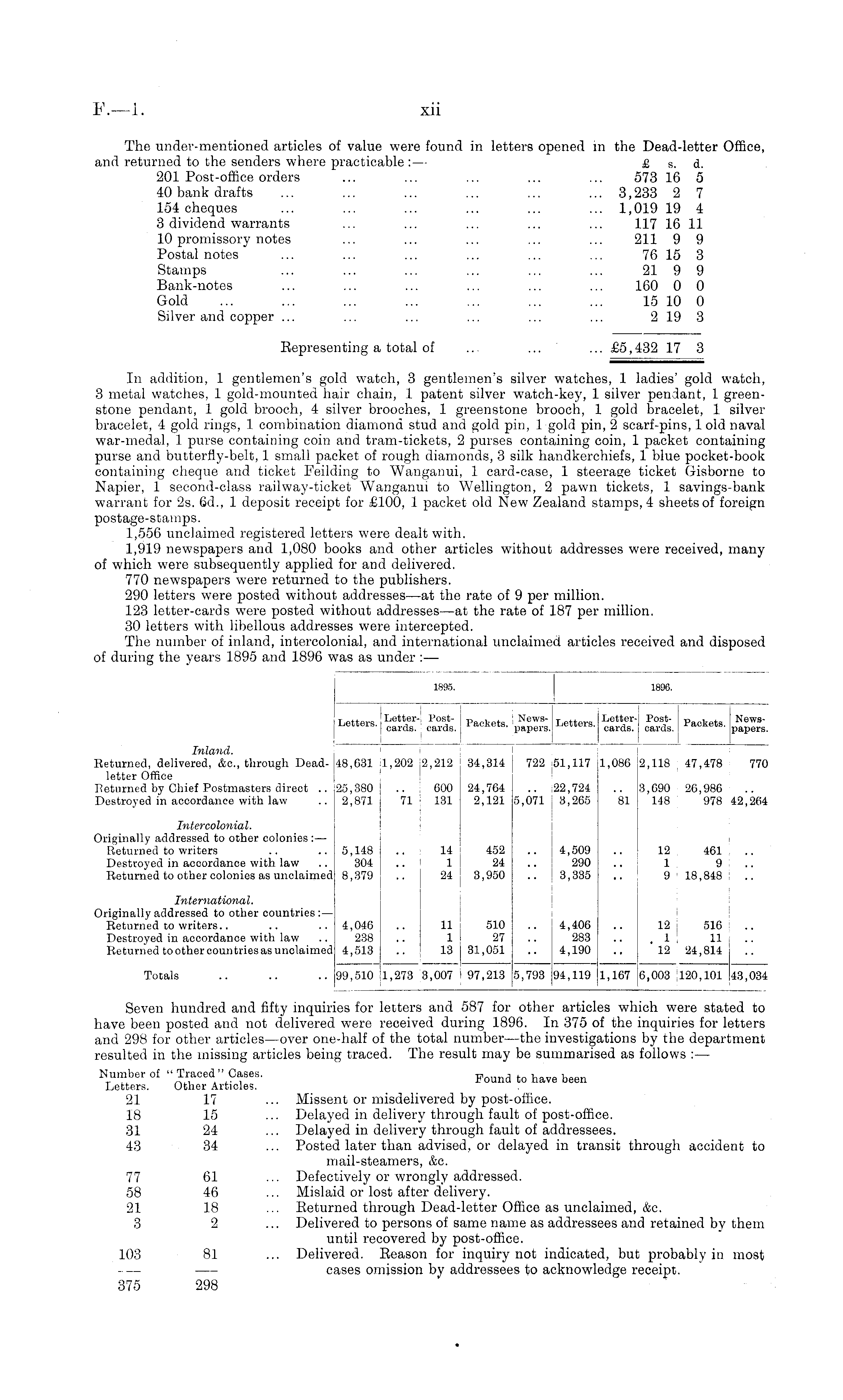 The under-mentioned articles of value were found in letters opened in the Dead-letter Office, and returned to the senders where practicable : — £ s . d. 201 Post-office orders ... ... ... ... ... 573 16 5 40 bank drafts ... ... ... ... ... ... 3,233 2 7 154 cheques ... ... ... ... ... ... 1,019 19 4 3 dividend warrants ... ... ... ... ... 117 16 11 10 promissory notes ... ... ... ... ... 211 9 9 Postal notes ... ... ... ... ... ... 76 15 3 Stamps ... ... ... ... ... ... 21 9 9 Bank-notes ... ... ... ... ... ... 160 0 0 Gold ... ... ... ... ... ... ... 15 10 0 Silver and copper ... ... ... ... ... ... 2 19 3 Eepresenting a total of ... ... ... £5,432 17 3 In addition, 1 gentlemen's gold watch, 3 gentlemen's silver watches, 1 ladies' gold watch, 3 metal watches, 1 gold-mounted hair chain, 1 patent silver watch-key, 1 silver pendant, 1 greenstone pendant, 1 gold brooch, 4 silver brooches, 1 greenstone brooch, 1 gold bracelet, 1 silver bracelet, 4 gold rings, 1 combination diamond stud and gold pin, 1 gold pin, 2 scarf-pins, 1 old naval war-medal, 1 purse containing coin and tram-tickets, 2 purses containing coin, 1 packet containing purse and butterfly-belt, 1 small packet of rough diamonds, 3 silk handkerchiefs, 1 blue pocket-book containing cheque and ticket Feilding to Wanganui, 1 card-case, 1 steerage ticket Gisborne to Napier, 1 second-class railway-ticket Wanganui to Wellington, 2 pawn tickets, 1 savings-bank warrant for 2s. 6d., 1 deposit receipt for £100, 1 packet old New Zealand stamps, 4 sheets of foreign postage-stamps. 1,556 unclaimed registered letters were dealt with. 1,919 newspapers and 1,080 books and other articles without addresses were received, many of which w r ere subsequently applied for and delivered. 770 newspapers were returned to the publishers. 290 letters were posted without addresses—at the rate of 9 per million. 123 letter-cards were posted without addresses—at the rate of 187 per million. 30 letters with libellous addresses were intercepted. The number of inland, intercolonial, and international unclaimed articles received and disposed of during the years 1895 and 1896 was as under : —