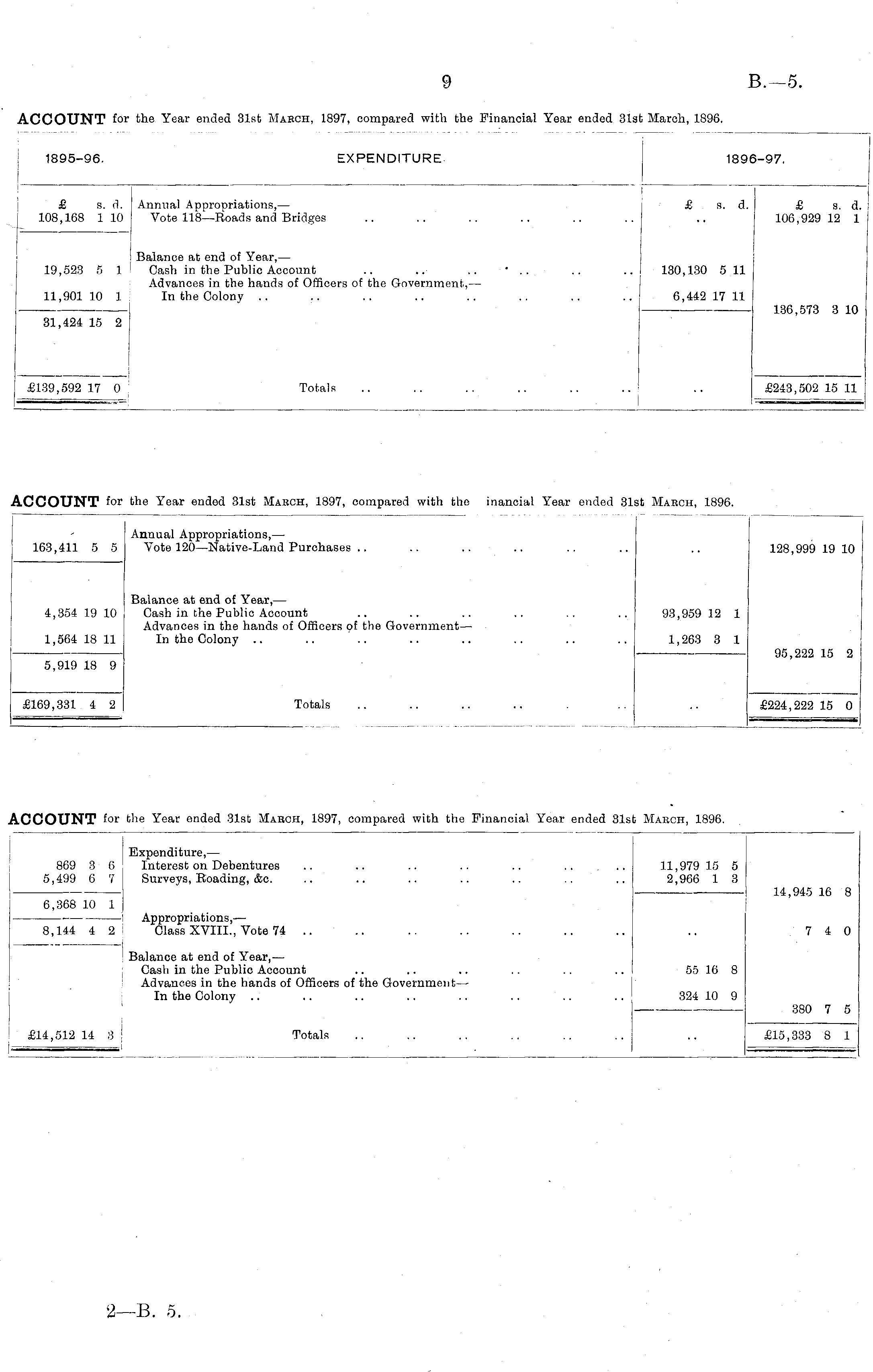 1895-96. EXPENDITURE 189' i-97, £ s. d. 108,168 1 10 Annual Appropriations,— Vote 118—Boads and Bridges £ s. d. £ s. d. 106,929 12 1 19,523 5 1 11,901 10 1 Balance at end of Year, — Cash in the Public Account Advances in the hands of Officers of the Government, — In the Colony 130,130 5 11 6,442 17 11 136,573 3 10 31,424 15 2 £139,592 17 0 Totals £243,502 15 11 ACCOUNT fo: the Year ended 31st March, 1897, compared with the inancial Year ended 31: ,t March, 1896. Annual Appropriations,— 163,411 5 5 Vote 120—Native-Land Purchases .. 163,411 5 5 128,999 19 10 Balance at end of Year, — 4,354 19 10 Cash in the Public Account Advances in the hands of Officers of the Government— 1,564 18 11 In the Colony .. 5,919 18 9 4,354 19 10 93,959 12 1 95,222 15 2 1,564 18 11 1,263 3 1 5,919 18 9 £169,331 4 2 £169,331 4 2 Totals £224,222 15 0 .CCOUNT for the Year ended 31st March, 1897, compared with the Financial Year ended 31s Mabch, 1896. 869 3 6 5,499 6 7 869 3 6 5,499 6 7 Expenditure,— Interest on Debentures Surveys, Boading, &c. 11,979 15 5 2,966 1 3 6,368 10 1 | 8,144 4 2 Appropriations,— Class XVIII., Vote 74 .. 14,945 16 8 6,368 10 1 8,144 4 2 7 4 0 . Balance at end of Year, — Cash in the Public Account Advances in the hands of Officers of the Government — In the Colony 55 16 8 380 7 5 324 10 9 £14,512 14 3 J — . Totals £15,333 8 1