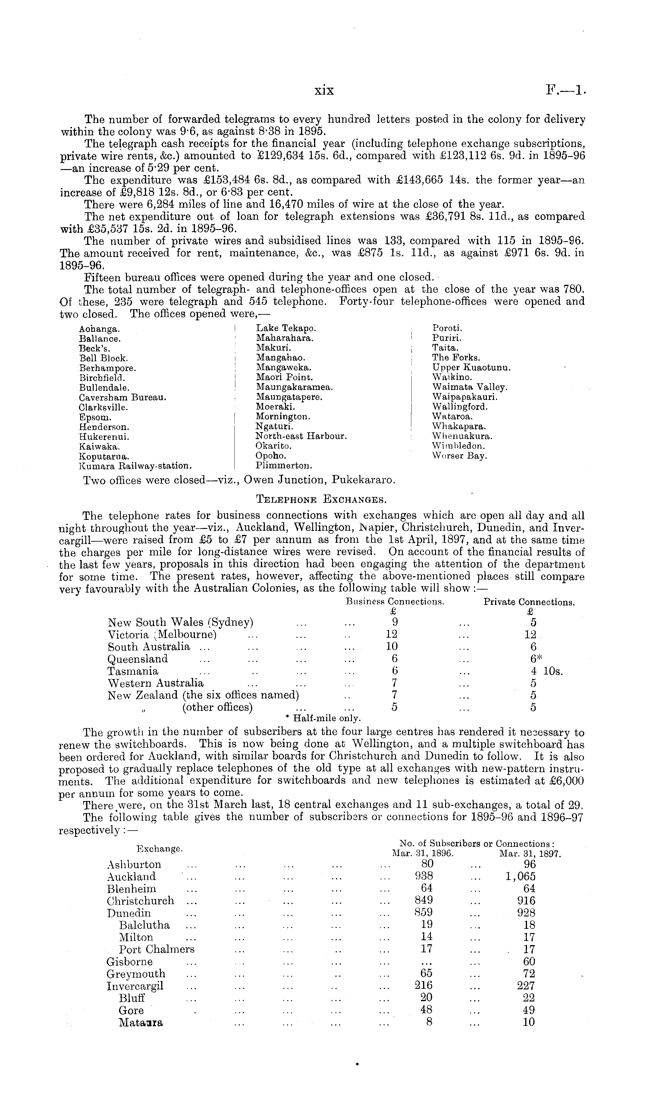 The number of forwarded telegrams to every hundred letters posted in the colony for delivery within the colony was 9-6, as against 8-38 in 1895. The telegraph cash receipts for the financial year (including telephone exchange subscriptions, private wire rents, &c.) amounted to £129,634 15s. 6d., compared with £123,112 6s. 9d. in 1895-96 —an increase of 5 - 29 per cent. The expenditure was £153,484 6s. Bd., as compared with £143,665 14s. the former year—an increase of £9,818 12s. Bd., or 6-83 per cent. There were 6,284 miles of line and 16,470 miles of wire at the close of the year. The net expenditure out of loan for telegraph extensions was £36,791 Bs. lid., as compared with £35,537 15s. 2d. in 1895-96. The number of private wires and subsidised lines was 133, compared with 115 in 1895-96. The amount received for rent, maintenance, &c, was £875 Is. lid., as against £971 6s. 9d. in 1895-96. Fifteen bureau offices were opened during the year and one closed. The total number of telegraph- and telephone-offices open at the close of the year was 780. Of these, 235 were telegraph and 545 telephone. Forty-four telephone-offices were opened and two closed. The offices opened were, — Aohanga. Lake Tekapo. Poroti. Ballanoe. Maharahara. Puriri. Beck's. Makuri. Taita. Bell Block. Mangahao. The Porks. Berhampore. Mangaweka. Upper Kuaotunu. Birchfield. Maori Point. Waikino. Bullendale. Maungakaramea. Waimata Valley. Caversham Bureau. - Maungatapere. Waipapakauri. Clarksville. Moeraki. Wallingford. Epsom. Mornington. Wataroa. Henderson. Ngaturi. Whakapara. Hukerenui. North-east Harbour. ! Whenuakura. Kaiwaka. Okarito. Wimbledon. Koputarna. Opoho. Worser Bay. Kumara Railway-station. Plimmerton. Two offices were closed—viz., Owen Junction, Pukekararo. Telephone Exchanges. The telephone rates for business connections with exchanges which are open all day and all night throughout the year—viz., Auckland, Wellington, INapier, Ghristchurch, Dunedin, and Invercargill—were raised from £5 to £7 per annum as from the Ist April, 1897, and at the same time the charges per mile for long-distance wires were revised. On account of the financial results of the last few years, proposals in this direction had been engaging the attention of the department for some time. The present rates, however, affecting the above-mentioned places still compare very favourably with the Australian Colonies, as the following table will show:— Business Connections. Private Connections. £ £ New South Wales (Sydney) ... ... 9 ... 5 Victoria 'Melbourne) ... ... .. 12 ... 12 South Australia ... ... ... ... 10 ... 6 Queensland ... ... ... ... 6 ... 6* Tasmania ... .. ... ... 6 ... 4 10s. Western Australia ... ... ... 7 ... 5 New Zealand (the six offices named) .. 7 ..." 5 (other offices) ... ... 5 ... 5 * Half-mile only. The growth in the number of subscribers at the four large centres has rendered it necessary to renew the switchboards. This is now being done at Wellington, and a multiple switchboard has been ordered for Auckland, with similar boards for Christchurch and Dunedin to follow. It is also proposed to gradually replace telephones of the old type at all exchanges with new-pattern instruments. The additional expenditure for switchboards and new telephones is estimated at £6,000 per annum for some years to come. There were, on the 31st March last, 18 central exchanges and 11 sub-exchanges, a total of 29. The following table gives the number of subscribers or connections for 1895-96 and 1896-97 respectively : — „ , No. of Subscribers or Connections : Exchange. Mar lgg6 Mar lgg^ Ashburton ... ... ... ... ... 80 ... 96 Auckland '... ... ... ... ... 938 ... 1,065 Blenheim ... ... ... ... ... 64 ... 64 Christchurch ... ... ... ... ... 849 ... 916 Dunedin ... ... ... ... ... 859 ... 928 Balclutha ... ... ... ... ... 19 ... 18 Milton ... ... ... ... ... 14 ... 17 Port Chalmers ... ... .. ... 17 ... . 17 Gisborne ... . ... ... ... ... ... 60 Greymouth ... ... ... .. ... 65 ... 72 Invercargil ... ... ... .. ... 216 ... 227 Bluff ... ... ... ... ... 20 ... 22 Gore . ... ... ... ... 48 ... 49 Mataara ... ... ... ... 8 ... 10