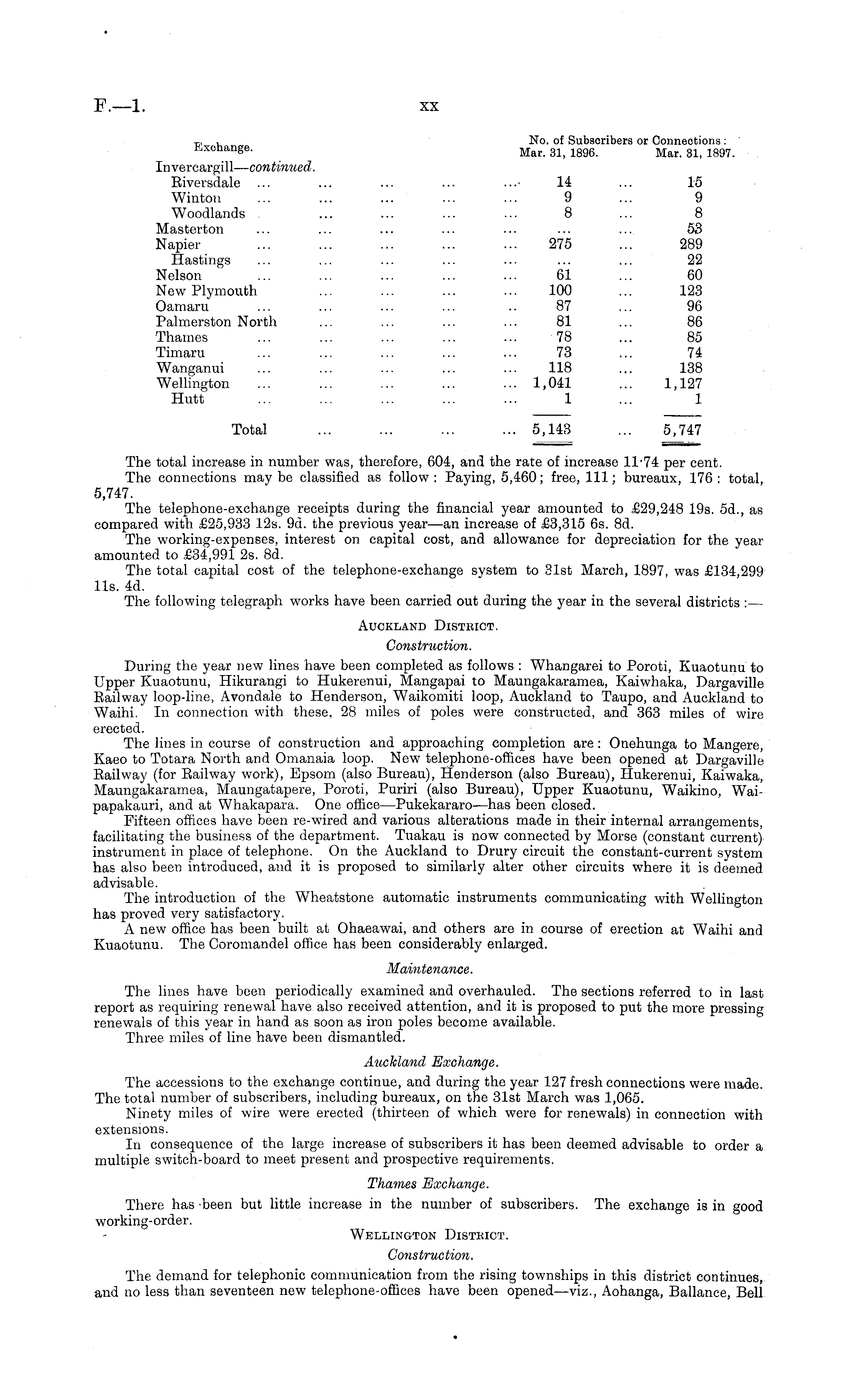 „ , No. of Subscribers or Connections : Exchange. Mar> gi> lgg6 Man gi> 18g7 _ Invercargill— continued. Eivevsdale ... ... ... ... ...• 14 ... 15 Winton ... ... ... ... ... 9 ... 9 Woodlands ... ... ... ... 8 ... 8 Masterton ... ... ... ... ... ... ... 53 Napier ... ... ... ... ... 275 ... 289 Hastings ... ... ... ... ... ... ... 22 Nelson ... ... ... ... ... 61 ... 60 New Plymouth ... ... ... ... 100 ... 123 Oaraaru ... ... ... ... .. 87 ... 96 Palmerston North ... ... ... ... 81 ... 86 Thames ... ... ... ... ... 78 ... 85 Timaru ... ... ... ... ... 73 ... 74 Wanganui ... ... ... ... ... 118 ... 138 Wellington ... ... ... ... ... 1,041 ... 1,127 Hutt ... ... ... ... ... 1 ... 1 Total ... ... ... ... 5,143 ... 5,747 The total increase in number was, therefore, 604, and the rate of increase 1174 per cent. The connections maybe classified as follow: Paying, 5,460; free, 111; bureaux, 176: total, 5,747. The telephone-exchange receipts during the financial year amounted to £29,248 19s. 5d., as compared with £25,933 12s. 9d. the previous year—an increase of £3,315 6s. Bd. The working-expenses, interest on capital cost, and allowance for depreciation for the year amounted to £34,991 2s. Bd. The total capital cost of the telephone-exchange system to Slst March, 1897, was £134,299 11s. 4d. The following telegraph works have been carried out during the year in the several districts :— Auckland Disteict. Construction. During the year new lines have been completed as follows : Whangarei to Poroti, Kuaotunu to Upper Kuaotunu, Hikurangi to Hukerenui, Mangapai to Maungakaramea, Kaiwhaka, Dargaville Eailway loop-line, Avondale to Henderson, Waikomiti loop, Auckland to Taupo, and Auckland to Waihi. In connection with these, 28 miles of poles were constructed, and 363 miles of wire erected. The lines in course of construction and approaching completion are: Onehunga to Mangere, Kaeo to Totara North and Omanaia loop. New telephone-offices have been opened at Dargaville Eailway (for Eailway work), Epsom (also Bureau), Henderson (also Bureau), Hukerenui, Kaiwaka, Maungakaramea, Maungatapere, Poroti, Puriri (also Bureau), Upper Kuaotunu, Waikino, Waipapakauri, and at Whakapara. One office—Pukekararo—has been closed. Fifteen offices have been re-wired and various alterations made in their internal arrangements, facilitating the business of the department. Tuakau is now connected by Morse (constant current) instrument in place of telephone. On the Auckland to Drury circuit the constant-current system has also been introduced, and it is proposed to similarly alter other circuits where it is deemed advisable. The introduction of the Wheatstone automatic instruments communicating with Wellington has proved very satisfactory. A new office has been built at Ohaeawai, and others are in course of erection at Waihi and Kuaotunu. The Coromandel office has been considerably enlarged. Maintenance. The lines have been periodically examined and overhauled. The sections referred to in last report as requiring renewal have also received attention, and it is proposed to put the more pressing renewals of this year in hand as soon as iron poles become available. Three miles of line have been dismantled. Auckland Exchange. The accessions to the exchange continue, and during the year 127 fresh connections were made. The total number of subscribers, including bureaux, on the 31st March was 1,065. Ninety miles of wire were erected (thirteen of which were for renewals) in connection with extensions. In consequence of the large increase of subscribers it has been deemed advisable to order a multiple switch-board to meet present and prospective requirements. Thames Exchange. There has been but little increase in the number of subscribers. The exchange is in good working-order. Wellington Distiuct. Construction. The demand for telephonic communication from the rising townships in this district continues, and no less than seventeen new telephone-offices have been opened—viz., Aohanga, Ballance, Bell
