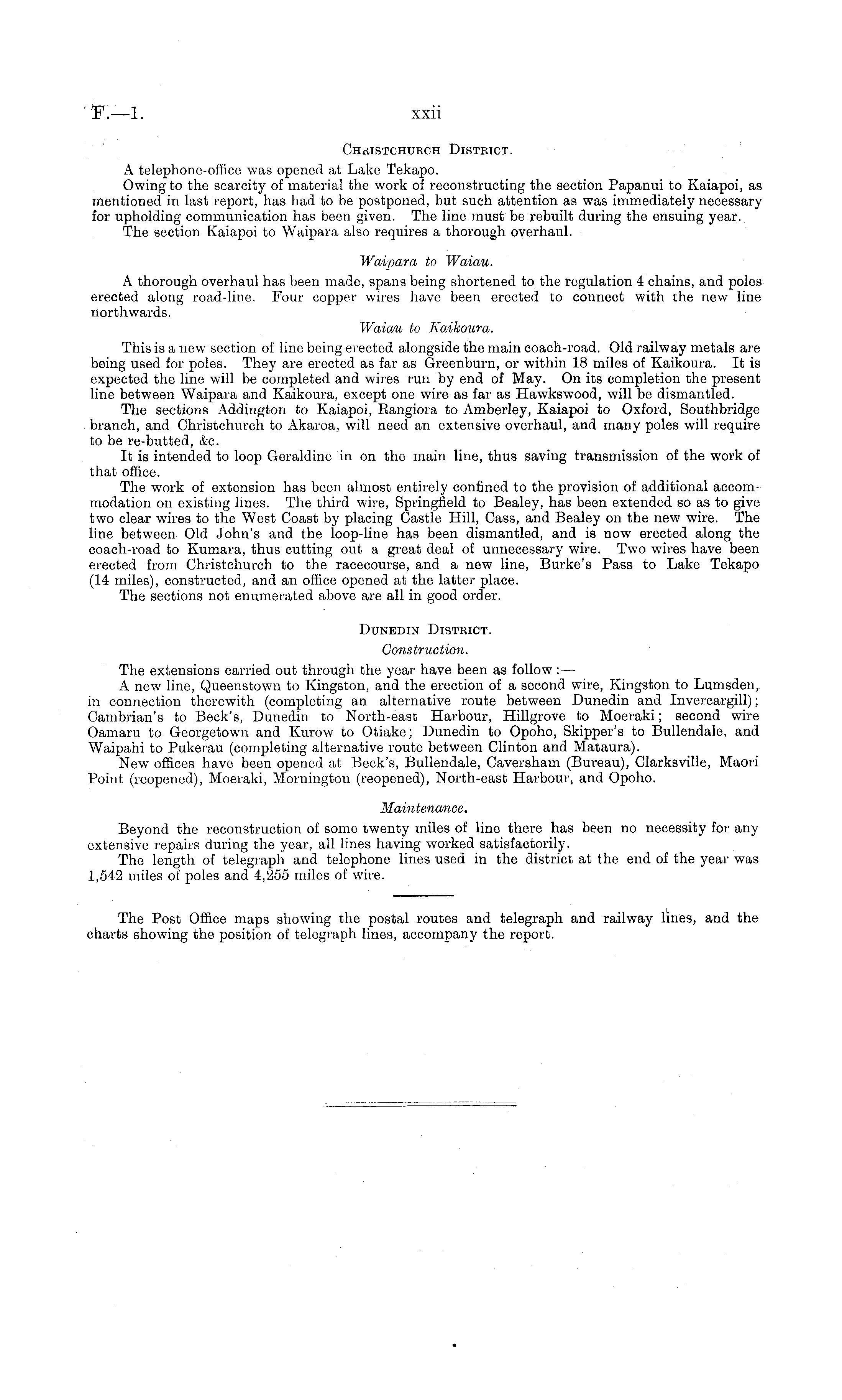 ChiUStchukch District. A telephone-office was opened at Lake Tekapo. Owing to the scarcity of material the work of reconstructing the section Papanui to Kaiapoi, as mentioned in last report, has had to be postponed, but such attention as was immediately necessary for upholding communication has been given. The line must be rebuilt during the ensuing year. The section Kaiapoi to Waipara also requires a thorough overhaul. Waipara to Waiau. A thorough overhaul has been made, spans being shortened to the regulation 4 chains, and poles erected along road-line. Four copper wires have been erected to connect with the new line northwards. Waiau to Kaikoura. This is a new section of line being erected alongside the main coach-road. Old railway metals are being used for poles. They are erected as far as Greenburn, or within 18 miles of Kaikoura. It is expected the line will be completed and wires run by end of May. On its completion the present line between Waipara and Kaikoura, except one wire as far as Hawkswood, will be dismantled. The sections Addington to Kaiapoi, Eangiora to Amberley, Kaiapoi to Oxford, Southbridge branch, and Christchurch to Akaroa, will need an extensive overhaul, and many poles will require to be re-butted, &c. It is intended to loop Geraldine in on the main line, thus saving transmission of the work of that office. The work of extension has been almost entirely confined to the provision of additional accommodation on existing lines. The third wire, Springfield to Bealey, has been extended so as to give two clear wires to the West Coast by placing Castle Hill, Cass, and Bealey on the new wire. The line between Old John's and the loop-line has been dismantled, and is now erected along the coach-road to Kumara, thus cutting out a great deal of unnecessary wire. Two wires have been erected from Christchurch to the racecourse, and a new line, Burkes Pass to Lake Tekapo (14 miles), constructed, and an office opened at the latter place. The sections not enumerated above are all in good order. DUNEDIN DISTBICT. Construction. The extensions carried out through the year have been as follow : — A new line, Queenstown to Kingston, and the erection of a second wire, Kingston to Lumsden, in connection therewith (completing an alternative route between Dunedin and Invercargill); Cambrian's to Beck's, Dunedin to North-east Harbour, Hillgrove to Moeraki; second wire Oamaru to Georgetown and Kurow to Otiake; Dunedin to Opoho, Skipper's to Bullendale, and Waipahi to Pukerau (completing alternative route between Clinton and Mataura). New offices have been opened at Beck's, Bullendale, Caversham (Bureau), Clarksville, Maori Point (reopened), Moeraki, Mornington (reopened), North-east Harbour, and Opoho. Maintenance. Beyond the reconstruction of some twenty miles of line there has been no necessity for any extensive repairs during the year, all lines having worked satisfactorily. The length of telegraph and telephone lines used in the district at the end of the year was 1,542 miles of poles and 4,255 miles of wire.