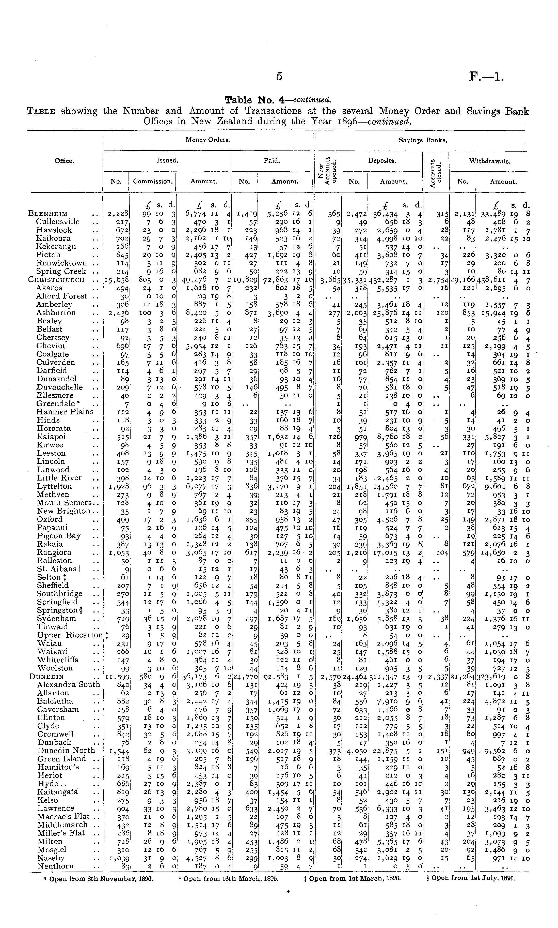 Table No. 4 — continued. Table showing the Number and Amount of Transactions at the several Money Order and Savings Bank Offices in New Zealand during the Year 1896 — continued.