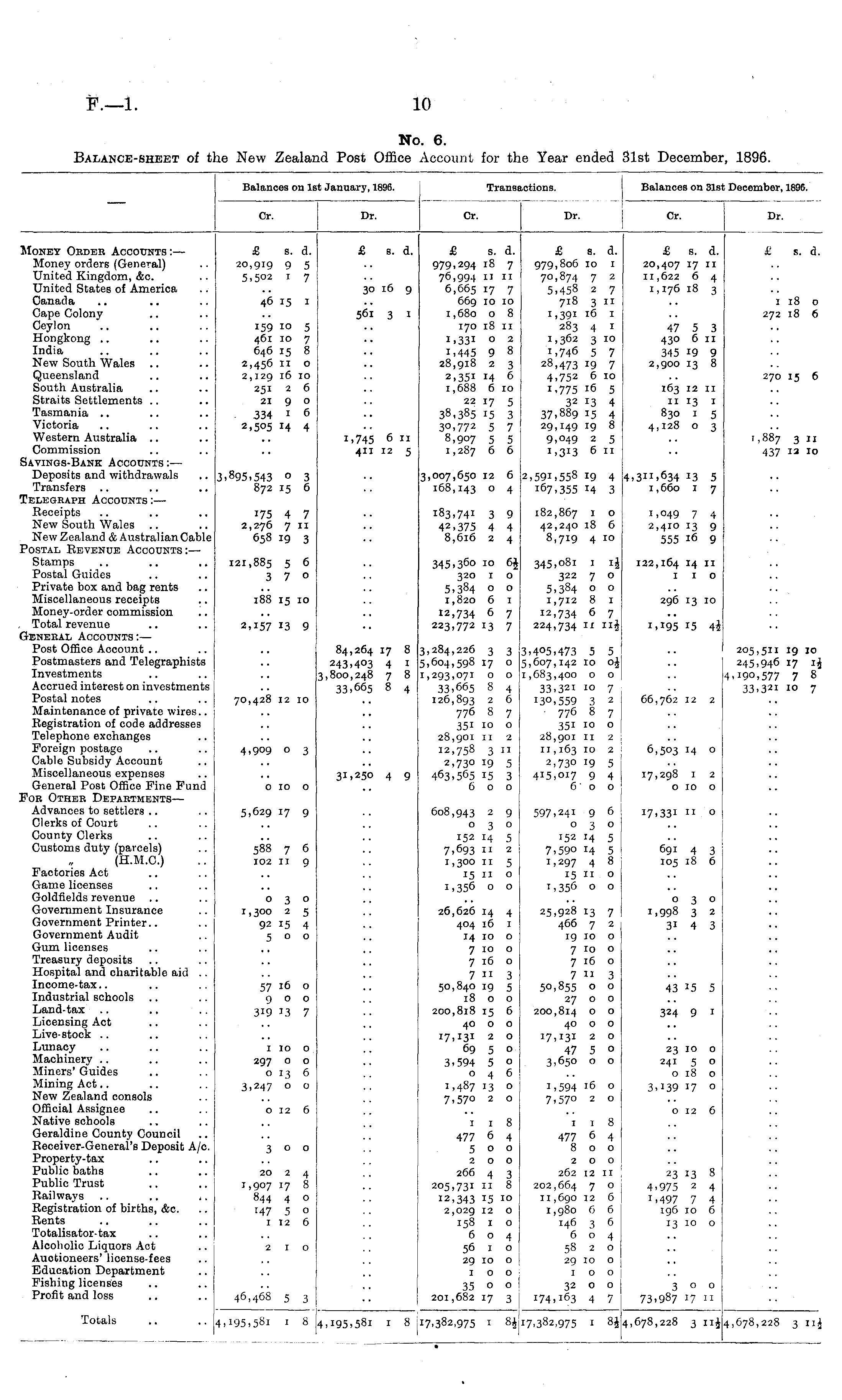 Balances on 1st January, 1896. Transactions. Balances on 31st December, 1896. Cr. Dr. Cr. Dr. Gr. Dr. Money Obdeb Accounts :— Money orders (General) United Kingdom, &o. United States of America Canada Cape Colony Ceylon Hongkong India New South Wales Queensland South Australia Straits Settlements Tasmania .. Victoria Western Australia Commission Savings-Bank Accounts :— Deposits and withdrawals Transfers Telegraph Accounts :— Receipts New South Wales New Zealand & Australian Cable Postal Revenue Accounts:— Stamps Postal Guides Private box and bag rents Miscellaneous receipts Money-order commission Total revenue Geneeal Accounts:— Post Office Account Postmasters and Telegraphists Investments Accrued interest on investments Postal notes Maintenance of private wires.. Registration of code addresses Telephone exchanges Foreign postage Cable Subsidy Account Miscellaneous expenses General Post Office Fine Fund Fob Otheb Depabtments— Advances to settlers Clerks of Court County Clerks Customs duty (parcels) (H.M.O.) Factories Act Game licenses Goldfields revenue Government Insurance Government Printer.. Government Audit Gum licenses Treasury deposits Hospital and charitable aid .. Income-tax.. Industrial schools Land-tax Licensing Act Live-Btock Lunacy Machinery Miners' Guides Mining Act New Zealand consols Official Assignee Native schools Geraldine County Council Receiver-General's Depoeit A/c. Property-tax Public baths Public Trust Railways Registration of births, &c. Rents Totalisator-tax Alcoholic Liquors Act Auctioneers' license-fees Education Department Fishing licenses Profit and loss £ s. d. 20,919 9 5 5,502 1 7 46 15 1 159 10 5 461 10 7 646 15 8 2,456 11 o 2,129 16 10 251 2 6 21 9 o - 334 1 6 2,505 14 4 £ s. d. 30 16 9 561 3 1 £ s. d. 979,294 18 7 76,994 " " 6,665 X 7 7 669 10 10 1,680 o 8 170 18 11 1,331 o 2 1,445 9 8 28,918 2 3 2,351 14 6 1,688 6 10 22 17 5 38,385 15 3 30,772 5 7 8,907 5 5 1,287 6 6 £ s. d. 979,806 10 1 70,874 7 2 5,458 2 7 718 3 11 1,391 16 1 283 4 1 1,362 3 10 1-746 5 7 28,473 19 7 4,752 6 10 1.775 16 5 32 13 4 37,889 15 4 29,149 19 8 9,049 2 5 i.3 r 3 6 11 £ s. d. 20,407 17 11 11,622 6 4 1,176 18 3 47 5 3 430 6 11 345 19 9 2,900 13 8 £ s. d. 1 18 o 272 18 6 270 13 6 163 12 11 11 13 1 830 1 5 4,128 o 3 1,745 6 11 411 12 5 1,887 3 IJ 437 12 10 3,895,543 o 3 872 15 6 3,007,650 12 6 168,143 o 4 2,59I»558 19 4 167-355 M 3 [4,311,634 13 5 1,660 1 7 175 4 7 2,276 7 11 658 19 3 183,741 3 9 4 2 ,375 4 4 8,616 2 4 182,867 I ° 42,240 18 6 8,719 4 10 1,049 7 4 2,410 13 9 555 16 9 121,885 5 6 3 7 0 188 15 10 345,360 10 6J 320 1 o 5,384 o o 1,820 6 1 12,734 6 7 223,772 13 7 345,081 1 1 J 322 7 o 5,384 o o 1,712 8 1 12,734 6 7 224,734 11 iij 122,164 14 11 1 1 o 296 13 10 2,157 13 9 1,195 15 4i 70,428 12 10 84,264 17 8 243,403 4 1 3,800,248 7 8 33,665 8 4 3,284,226 3 3 1 5,604,598 17 o j I,293,O7I O O ! 33,665 8 4 : 126,893 2 6 776 8 7 351 10 o 28,901 11 2 12,758 3 11 2,730 19 5 463.565 15 3 600 ,3,405,473 5 5 (5,607,142 10 oi| 11,683,400 o o 33,321 10 7 130,559 3 2 • 776 8 7 351 10 o 28,901 11 2 11,163 Io 2 2,730 19 5 I 415,017 9 4 ; 6' o o ! I •• 66,762 12 2 i 205,511 19 10 245,946 17 H 4,I9O,577 7 8 33,321 10 7 4,909 o 3 6,503 14 o 3I.25O 4 9 17,298 1 2 o 10 o 0 10 o 5,629 17 9 588 7 6 102 11 9 608,943 2 9 030 152 14 5 I 7,693 11 2 1,300 11 5 15 11 o 1,356 o o 597,241 9 6 ! 030' 152 H 5 7,59O 14 5 1,297 4 8 ; 15 11 o 1,356 o o 17.33 1 II o 691 4 3 105 18 6 030 1.300 2 5 92 15 4 500 26,626 14 4 J 404 16 1 14 10 o ! 7 10 o 7 16 o 7 11 3 50,840 19 5 1800 200,818 15 6 40 o 0 17,131 2 o 69 5 o 3,594 5 o 046 1,487 13 o 7.57° 2 o I 25,928 13 7 466 7 2 19 10 o 7 io o 7 16 o 7 " 3 50,855 o o 27 o 0 200,814 o ° 40 o o 17,131 2 o 47 5 o 3,650 o o 030 1,998 3 2 3i 4 3 57 16 o 900 319 13 7 43 15 5 324 9 1 1 10 o 297 o o o 13 6 3,247 o o 23 10 o 241 5 o o 18 o 1,594 l6 o 7,570 2 o 3.139 17 o o 12 6 o 12 6 300 20 2 4 1,907 17 8 844 4 0 '47 5 o 1 12 6 1 1 8 477 6 4 500 200 266 4 3 205,731 11 8 12,343 15 10 2,029 12 o 158 1 o 604 56 i o 29 10 o 100 35 o 0 201,682 17 3 1 I 8 477 6 4 800 200 262 12 11 202,664 7 ° 11,690 12 6 : 1,980 6 6 146 3 6 604 58 2 o 29 10 o 100 32 o o j 174, ie 3 4 7 ' ' 23 13 8 4,975 2 4 i>497 7 4 196 10 6 13 10 o 2 1 o 46,468 5 3 300 73,987 17 11 Totals 4.I95i58i 1 8 4>i95,58i 1 8 17.382,975 1 81 17,382,975 I s i\ [4,678,228 3 114 4,678,228 3 11J