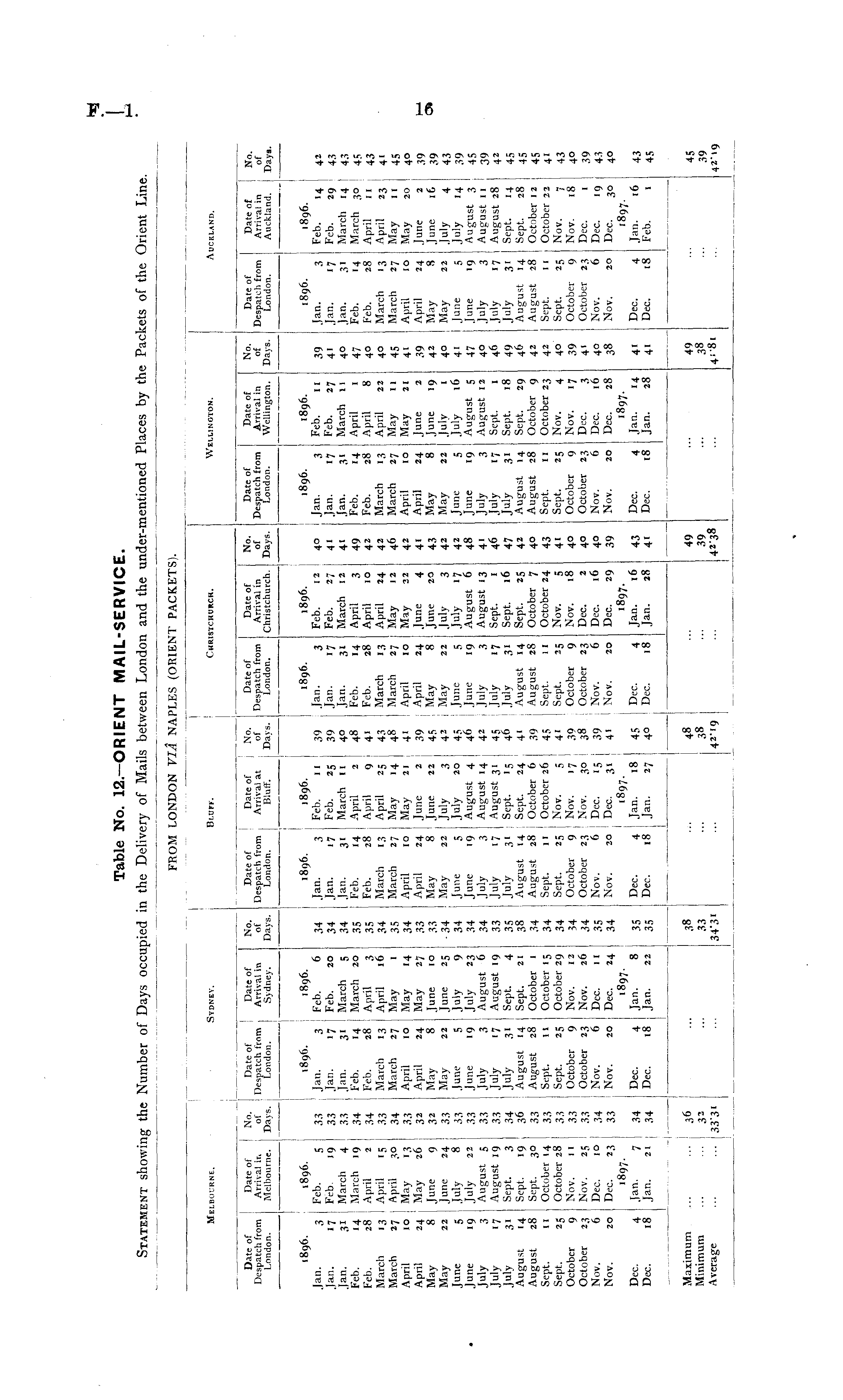 Table No. 12.-ORIENT MAIL-SERVICE. Statement showing the Number of Days occupied in the Delivery of Mails between London and the under-mentioned Places by the Packets of the Orient Line.