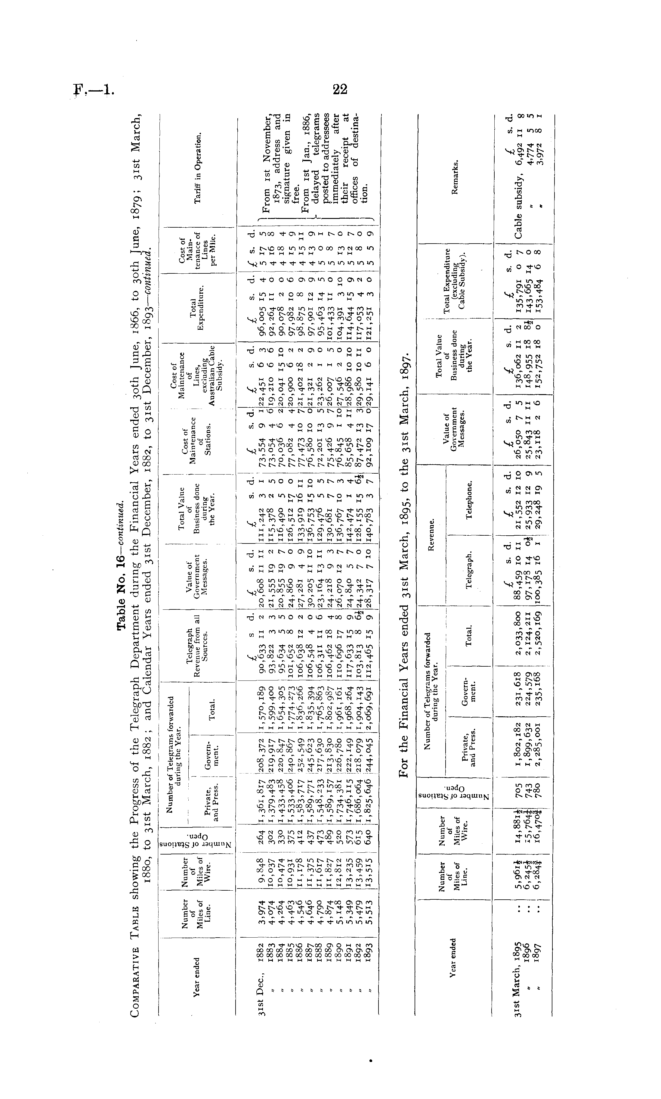 Table No. 16— continued. Comparative Table showing the Progress of the Telegraph Department during the Financial Years ended 30th June, 1866, to 30th June, 1879; 31st: March, 1880, to 31st March, 1882; and Calendar Years ended 31st December, 1882, to 31st December, 1893— continued.