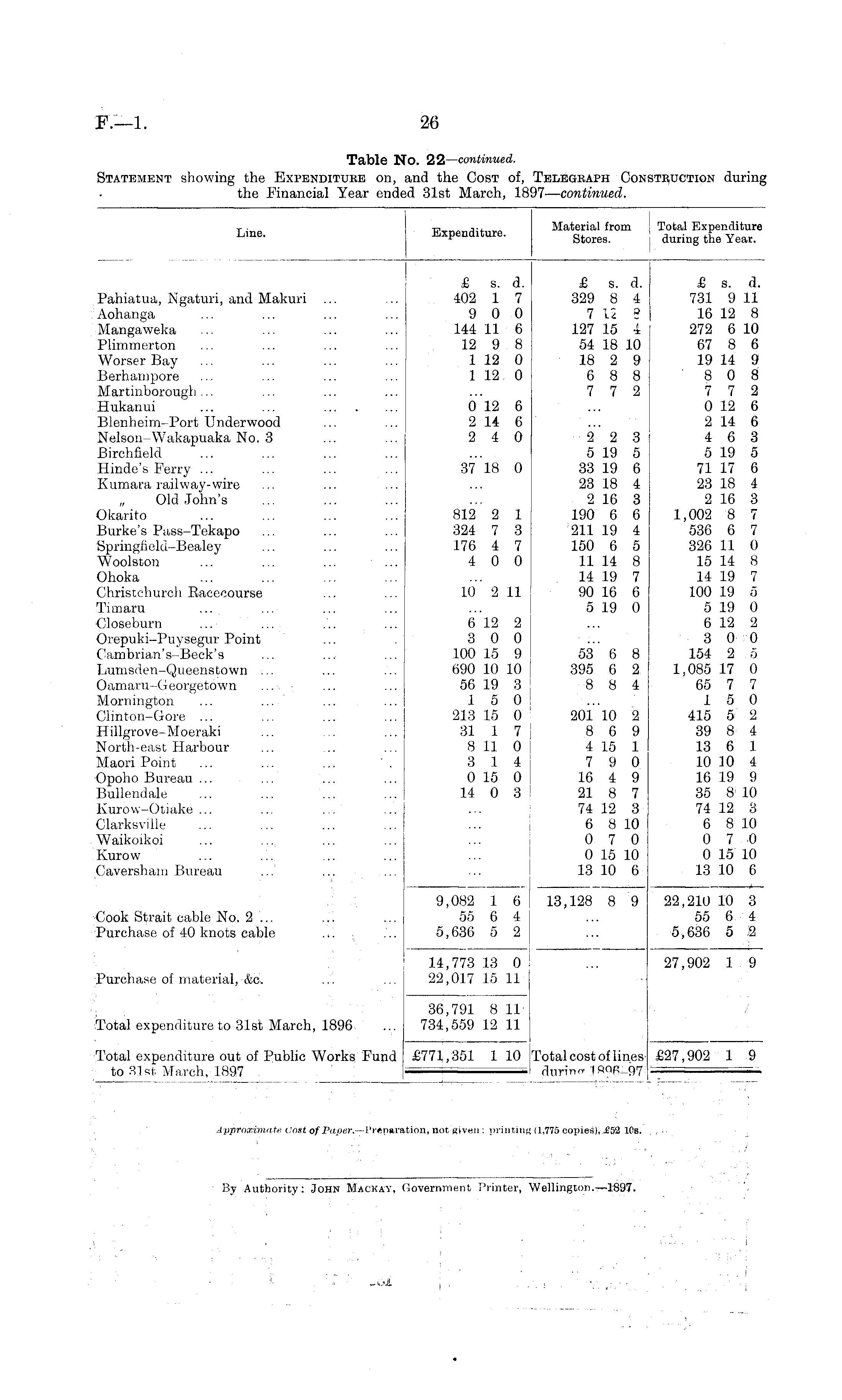 Line. Expenditure. aterial from Stores. fotal Expendituri during the Year. Pahiatua, Ngaturi, and Makuri Aohanga ... ... ... Mangaweka Plimmerton Worser Bay Berhampore Martinborough ... Hukanui ... ... Blenheim-Port Underwood Nelson-Wakapuaka No. 3 Birchfield Hinde's Ferry ... Kumara railway-wire Old John's Okarito Burke's Pass-Tekapo Springfieki-Bealey Woolston ... ... ... • ... Ohoka Christchurch Baceeourse Timaru ... Closeburn ... .... Orepuki-Puysegur Point Cambrian's-Beck's Lumsden-Queenstown ... '.. Oamaru—Georgetown ...-n - Mornington ... ... ' Clinton-Gore ... Hillgrove-Moeraki North-east Harbour Maori Point Opoho Bureau ... Bullendale Kurow-Otiake ... ... ... Clarksville Waikoikoi Kurow ... ... Caversham Bureau ... ... .... £ s. d. 402 1 7 9 0 0 144 11 6 12 9 8 1 12 0 1 12 0 £ s. d. 329 8 4 7 U ? 127 15 4 54 18 10 18 2 9 6 8 8 7 7 2 £ s. d. 731 9 11 16 12 8 272 6 10 67 8 6 19 14 9 8 0 8 7 7 2 0 12 6 2 14 6 4 6 3 5 19 5 71 17 6 23 18 4 2 16 3 1,002 8 7 536 6 7 326 11 0 15 14 8 14 19 7 100 19 5 5 19 0 6 12 2 3 0 0 154 2 5 1,085 17 0 65 7 7 15 0 415 5 2 39 8 4 13 6 1 10 10 4 16 19 9 35 8 10 74 12 3 6 8 10 0 7 0 0 15 10 13 10 6 0 12 6 2 14 6 2 4 0 2 2 3 5 19 5 33 19 6 23 18 4 2 16 3 190 6 6 211 19 4 150 6 5 11 14 8 14 19 7 90 16 6 5 19 0 37 18 0 812 2 1 324 7 3 176 4 7 4 0 0 10 2 11 6 12 2 3 0 0 100 15 9 690 10 10 56 19 8 15 0 213 15 0 81 1 7 8 11 0 3 14 0 15 0 14 0 3 53 6 8 395 6 2 8 8 4 201 10 2 8 6 9 4 15 1 7 9 0 16 4 9 21 8 7 74 12 3 6 8 10 0 7 0 0 15 10 13 10 6 9,082 55 5,636 1 6 5 6 4 2 13,128 8 9 22,210 10 55 6 5,636 5 3 4 .2 Cook Strait cable No. 2 ... Purchase of 40 knots cable .,, , Purchase of material, &c 14,773 13 0 22,017 15 11 27,902 1 9 Total expenditure to 31st March, 1896 36,791 8 11 734,559 12 11 /Total cost of lines I Auriv JftPfl 97 Total expenditure out of Public Works Fund to 31 st March, 1897 £771,351 1 10 £27,902 1 9