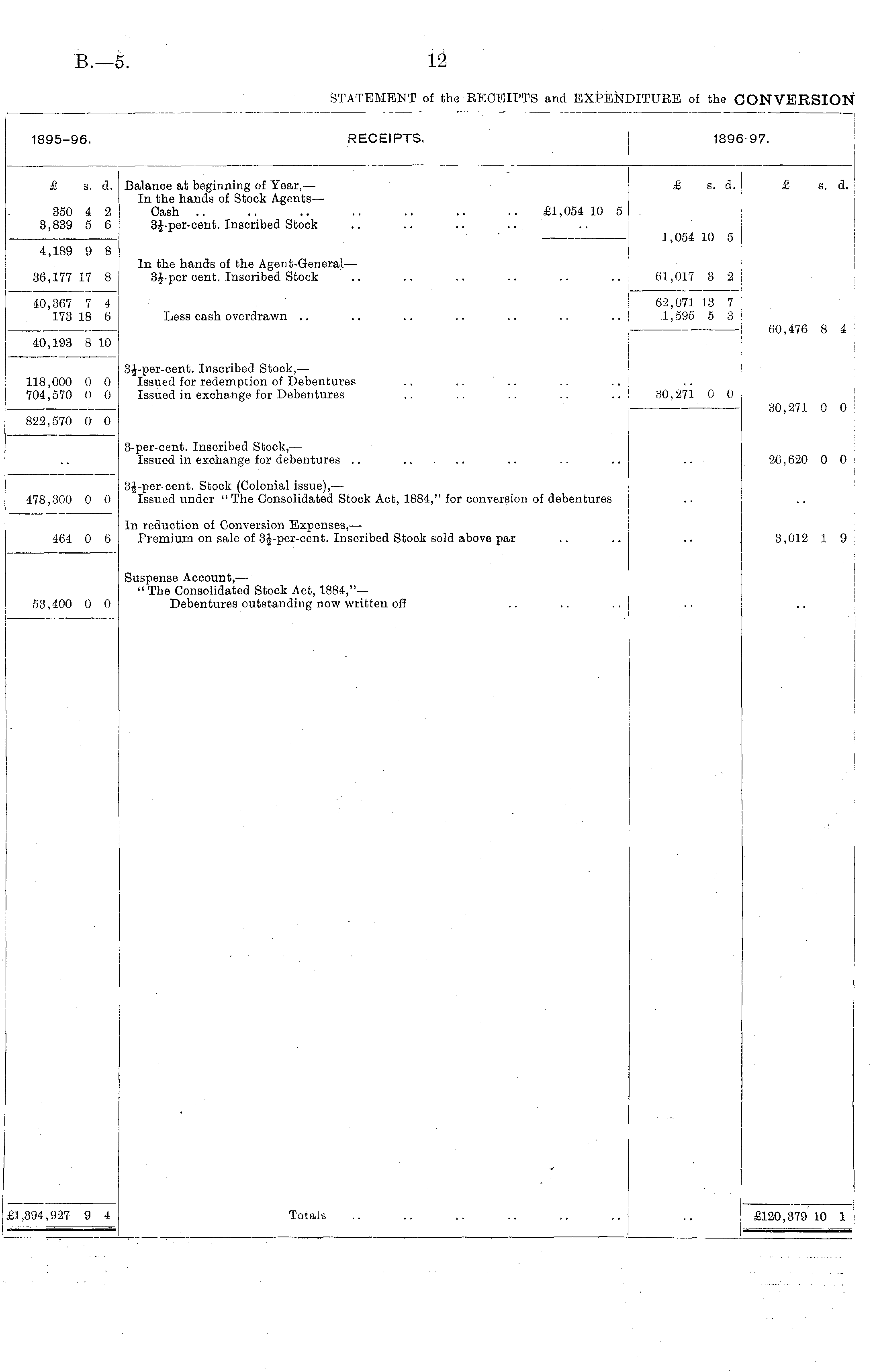 1895-96. RECEIPTS. 1896-97, £ s. a. £ s. d. £• s. d. 350 4 2 3,839 5 6 Balance at beginning of Year, — In the hands of Stock Agents— Cash .. .. .. .. .. .. .. £1,054 10 5 3J-per-cent. Inscribed Stock 1,054 10 5 4,189 9 8 36,177 17 8 In the hands of the Agent-General— 3J-per cent, Inscribed Stock 61,017 3 2 40,367 7 4 173 18 6 Less cash overdrawn .. 62,071 IS 7 1,595 5 3 60,476 8 4 40,193 8 10 3J-per-cent. Inscribed Stock, — Issued for redemption of Debentures .. .. Issued in exchange for Debentures 118,000 0 0 704,570 0 0 30,271 0 0 ■<n 97i n n 822,570 0 0 OU , ii ( -L U U 3-per-cent. Inscribed Stock, — Issued in exchange for debentures .. 26,620 0 0 Stock (Colonial issue), — Issued under "The Consolidated Stock Act, 1884," for conversion of debentures 478,300 0 0 464 0 6 In reduction of Conversion Expenses,— Premium on sale of Inscribed Stock sold above par 3,012 1 9 Suspense Account, — " The Consolidated Stock Act, 1884,"— Debentures outstanding now written off 53,400 0 0 Totals £1,394,927 9 4 £120,379 10 1