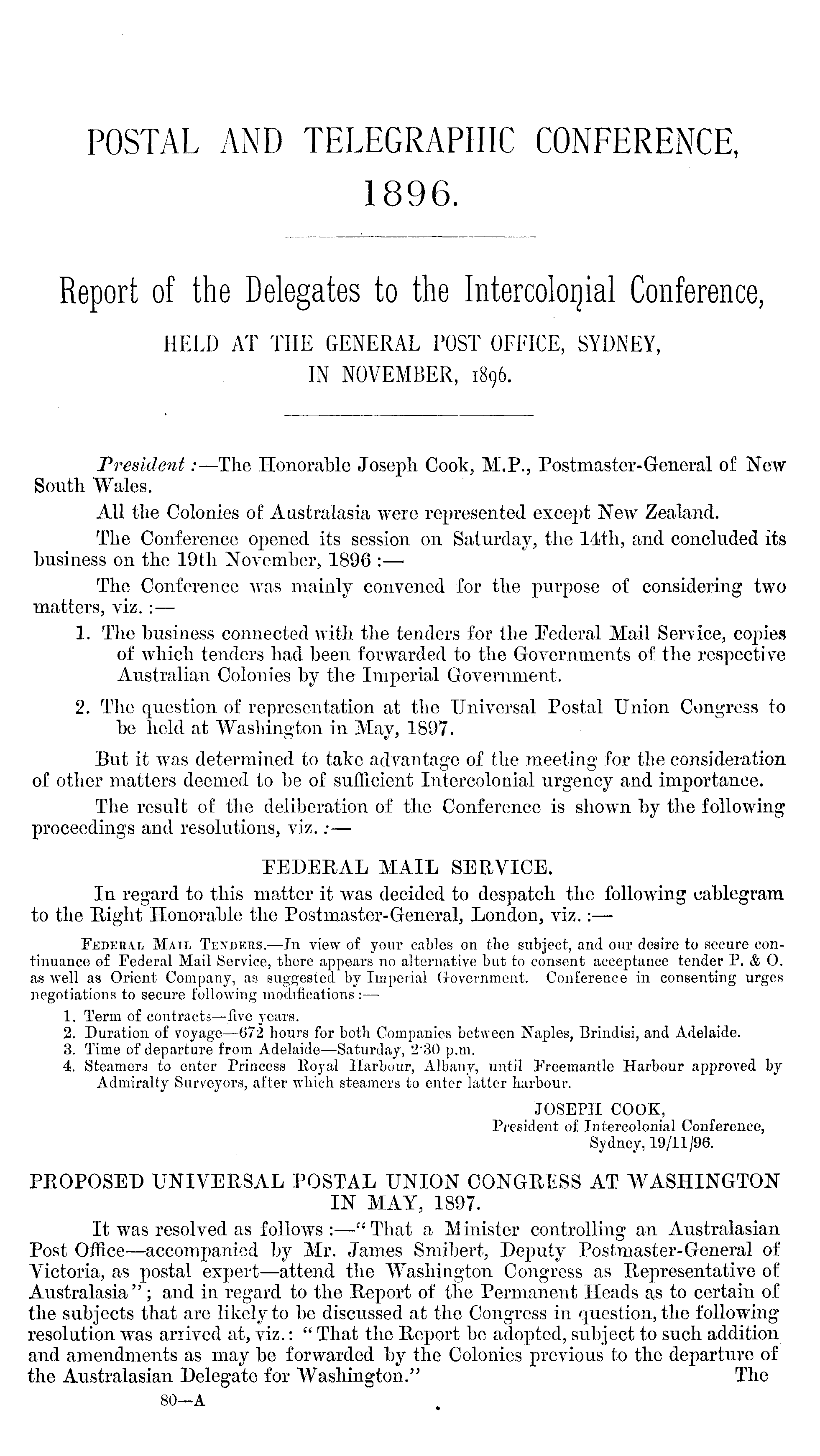 Report of the Delegates to the Intercolonial Conference, HELD AT THE GENERAL POST OFFICE, SYDNEY, IN NOVEMBER, 1896.