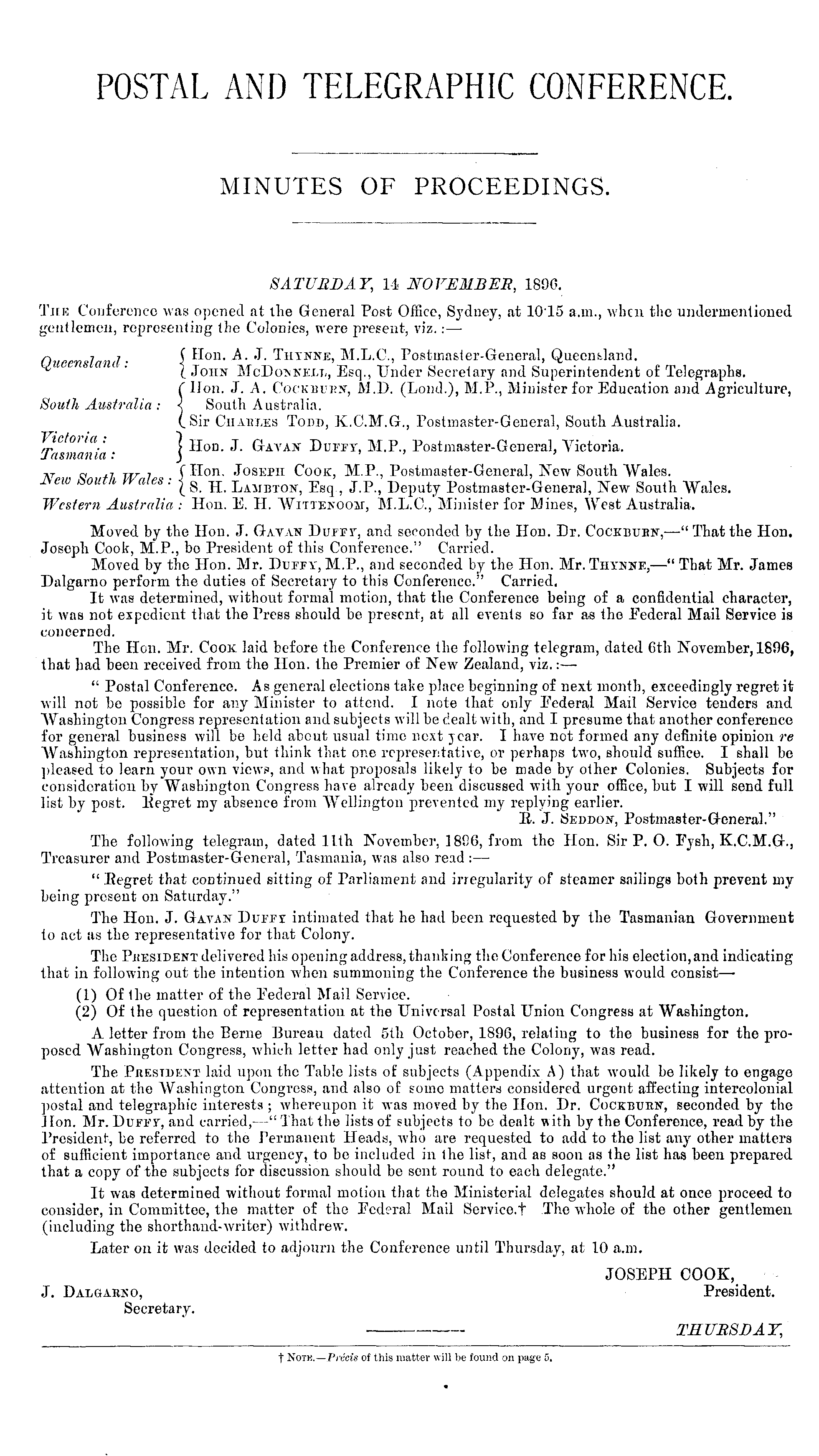 SATURDAY, 11 NOVEMBER, 1890. Tub Conference was oj)ened at the General Post Office, Sydney, at 1015 a.m., wbei) the undermentioned gentlemen, representing (lie Colonies, were present, viz.; — q 7t J , ( Hon. A. J. Thynnk, M.L.C., Postmaster-General, Queensland. I John McDoMfILT/, Esq., Under Secretary and Superintendent of Telegraphs. ( Hon. J. A. CoCKBVBK, M.D. (Loud.), M.P., Minister for Education and Agriculture, South Australia ; < Soutli Australia. (.Sir Chables Tod j>, K.C.M.G., Postmaster-General, South Australia. Tasmania i } IIoU - J ' Gavax Dum-y, M - p -> Postmaster-General, Victoria. « // fHon. Josia'ii COOK, M.P., Postmaster-General, New South Wales. JScw south Wales: £ g J, AMWOJfi Esq , J.P., Deputy Postmaster-General, New South Wales. Western Australia : Hon. E. 11. WITTBKOOM, M.L.C., Minister for Mines, West Australia. Moved by the Hon. J. Gat AW Dufft, and seconded by the Hon. Dr. Cockbueit, —" That the Hon. Joseph Cook, M.P., bo President of this Conference." Carried. Moved by the Hon. Mr. Duffy, M.P., and seconded by the Hon. Mr. Tiiynne,—" That Mr. James Dalgarao perform the duties of Secretary to this Conference." Carried. It was determined, without formal motion, that the Conference being of a confidential character, it was not expedient that the Press should be present, at all events so far as tho Federal Mail Service is concerned. The lion. Mr. Cook laid before the Conference the following telegram, dated Gth November, 1896, that had been received from the Hon. the Premier of New Zealand, viz.: — " Postal Conference. As general elections take place beginning of next month, exceedingly regret it will not be possible for any Minister to attend. I note that only Federal Mail Service tenders and Washington Congress representation and subjects will be dealt with, and 1 presume that another conference for general business will bo held about usual time next jear. I have not formed any definite opinion re "Washington representation, but think that one representative, or perhaps two, should suflice. I shall bo pleased to learn your own views, and what proposals likely to be made by other Colonies. Subjects for consideration by Washington Congress have already been discussed with your office, but I will send full list by post. Kegret my absence from Wellington prevented my replying earlier. It. J. Seddox, Postmaster-General." Tho following telegram, dated 11th November, 18fiG, from tho Hon. Sir P. O. Fysh, K.C.M.G., Treasurer and Postmaster-General, Tasmania, was also read : — " Eegret that continued sitting of Parliament and irregularity of steamer sailings both prevent my being present on Saturday." The Hon. J. Gavan Duffy intimated that he had been requested by the Tasmanian Government to act as the representative for that Colon3 r . The President delivered his opening address, thank ing the Conference for his election, and indicating that in following out the intention when summoning the Conference the business would consist— (1) Of tlie matter of the Federal Mail Service. (2) Of the question of representation at the Universal Postal Union Congress at Washington. A letter from the Berne Bureau dated sth October, 1896, relating to the business for the proposed Washington Congress, which letter had only just reached the Colony, was read. The PitESTDKXT laid upon the Table lists of subjects (Appendix A) that would be likely to engage attention at the Washington Congress, and also of some matters considered urgent affecting intercolonial postal and telegraphic interests ; whereupon it was moved by the Hon. Dr. Cockisuiw, seconded by the j [on. Mr. Duffs', and carried, —" That the lists of subjects to be dealt with by the Conference, read by the President, bo referred to the Permanent Heads, who are requested to add to the list any other matters of sufficient importance and urgency, to be included in Ihe list, and as soon as the list has been prepared that a copy of the subjects for discussion should be sent round to each delegate." It was determined without formal motion that the Ministerial delegates should at once proceed to consider, in Committee, the matter of the Federal Mail Service.t The whole of the other gentlemen (including the shorthand-writer) withdrew. Later on it was decided to adjourn the Conference until Thursday, at 10 a.m. JOSEPH COOK, J. Dalcsarko, President. Secretary. — THURSDAY,