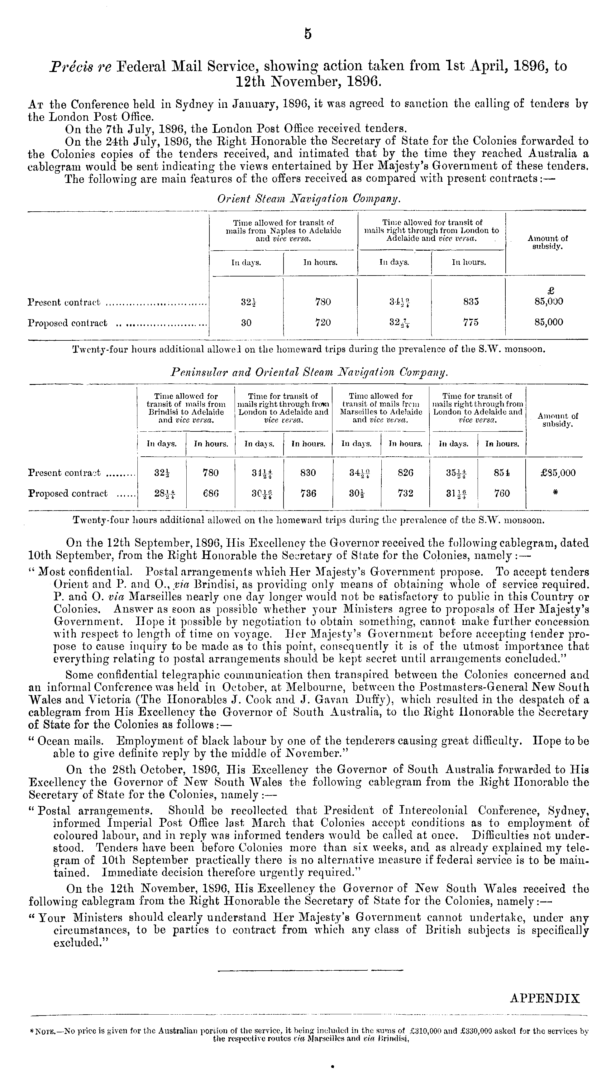 Precis re Federal Mail Service, showing action taken from Ist April, 1896, to 12th November, 1896. At the Conference held in Sydney in January, 189G, it was agreed to sanction the calling of tenders by the London Post Office. On the 7th July, 1896, the London Post Office received tenders. On the 24th July, 189b", the Eight Honorable the Secretary of State for the Colonies forwarded to the Colonies copies of the tenders received, and intimated that by the time they reached Australia a cablegram would be sent indicating the views entertained by Her Majesty's Government of these tenders. The following are main features of the offers received as compared with present contracts: —