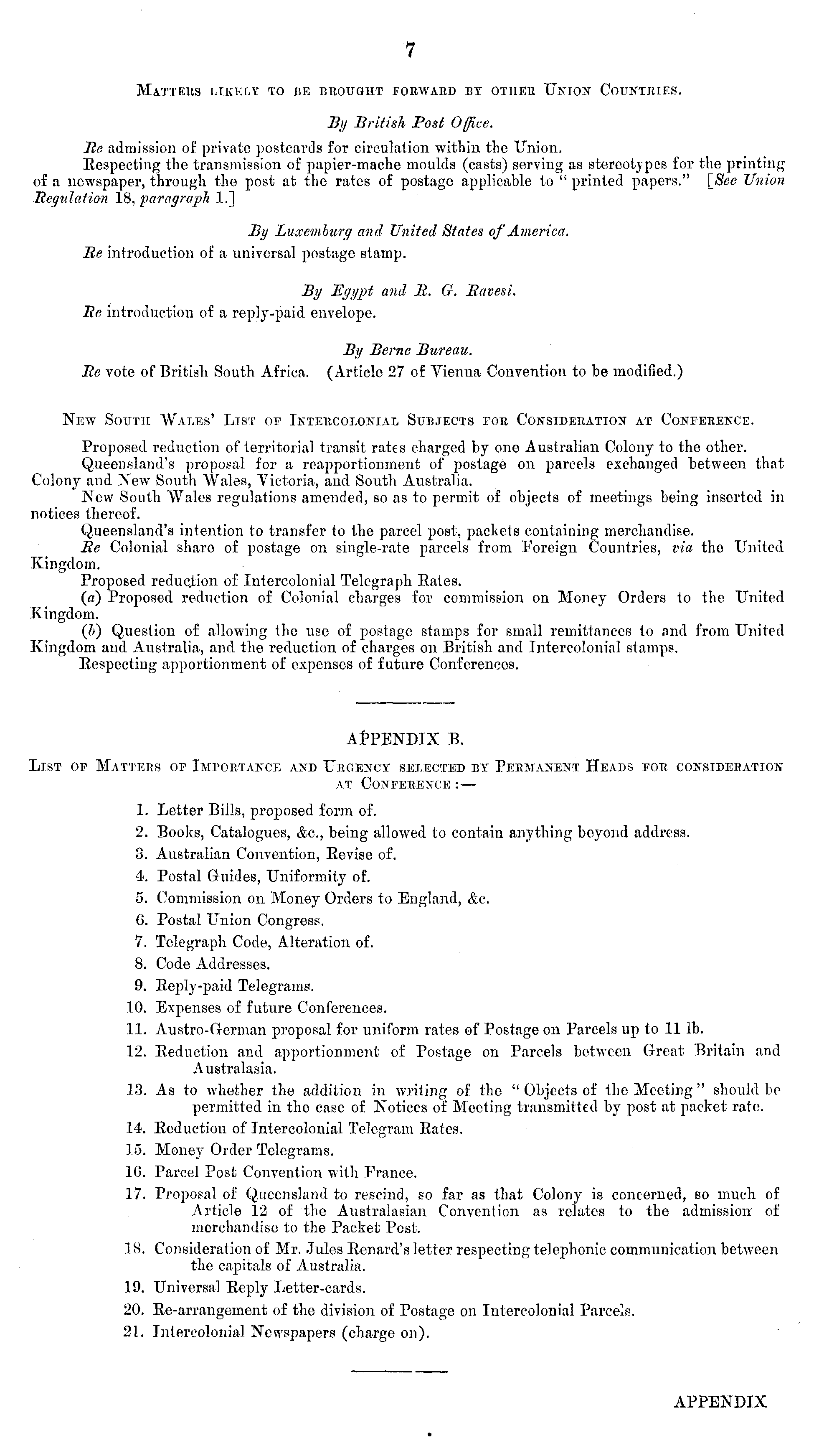 Matters likely to be brought forward by other Union Countries. By British Post Office. Be admission of private postcards for circulation within the Union. Eespecting the transmission of papier-macho moulds (easts) serving as stereotypes for the printing of a newspaper, through tho post at the rates of postage applicable to " printed papers." [See Union Begulation 18, paragraph I.] By Luxemburg and United States of America. lie introduction of a universal postage stamp. By Egypt and B. G. Bavesi. Be introduction of a reply-paid envelope. By Berne Bureau. Be vote of British South Africa, (Article 27 of Vienna Convention to be modified.) New South Wales' Ltst of Intercolonial Subjects for Consideration at Conference. Proposed reduction of territorial transit rates charged by one Australian Colony to the other. Queensland's proposal for a reapportionment of postage on parcels exchanged between that Colony and New South Wales, "Victoria, and South Australia. New South Wales regulations amended, so as to permit of objects of meetings being inserted in notices thereof. Queensland's intention to transfer to the parcel post, packets containing merchandise. Be Colonial share of postage on single-rate parcels from Foreign Countries, via the United Kingdom. Proposed reduction of Intercolonial Telegraph Eates. («) Proposed reduction of Colonial charges for commission on Money Orders to the United Kingdom. (J) Question of allowing tho use of postage stamps for small remittances to and from United Kingdom and Australia, and the reduction of charges on British and Intercolonial stamps. Eespocting apportionment of expenses of future Conferences.