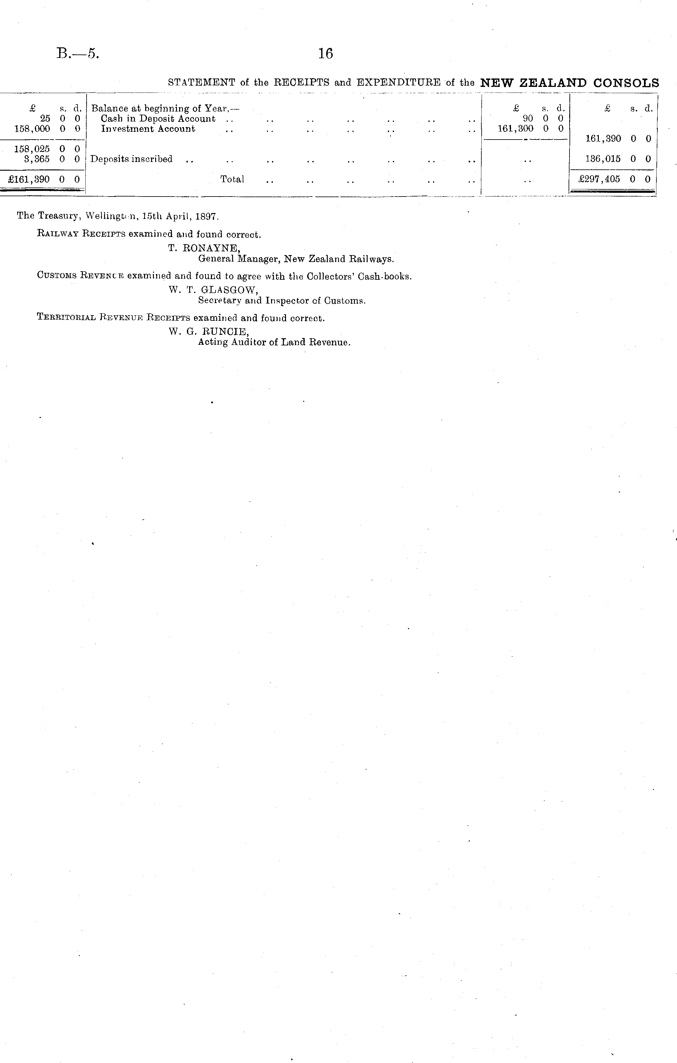 The Treasury, Wellington, 15tli April, 1897. Railway Receipts examined and found correct. T. RONAYNE, General Manager, New Zealand Railways. Customs Revbnce examined and found to agree with the Collectors' Cash-books. W. T. GLASGOW, Secretary and Inspector of Customs. Tebbitoeial Revenue Receipts examined and found correct. W. G. RUNCIE, Acting Auditor of Land Revenue.