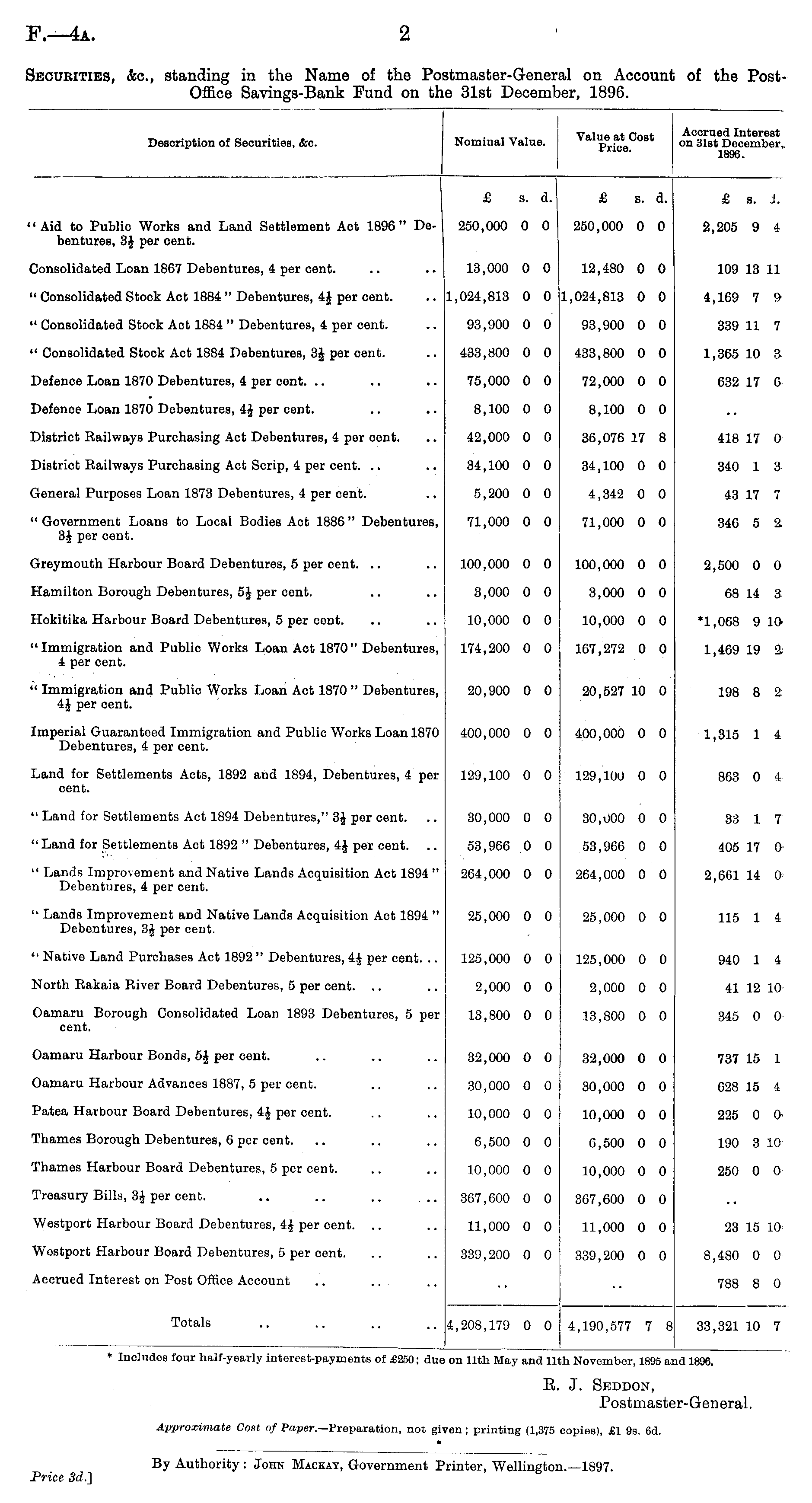 Securities, &c., standing in the Name of the Postmaster-General on Account of the PostOffice Savings-Bank Fund on the 31st December, 1896.