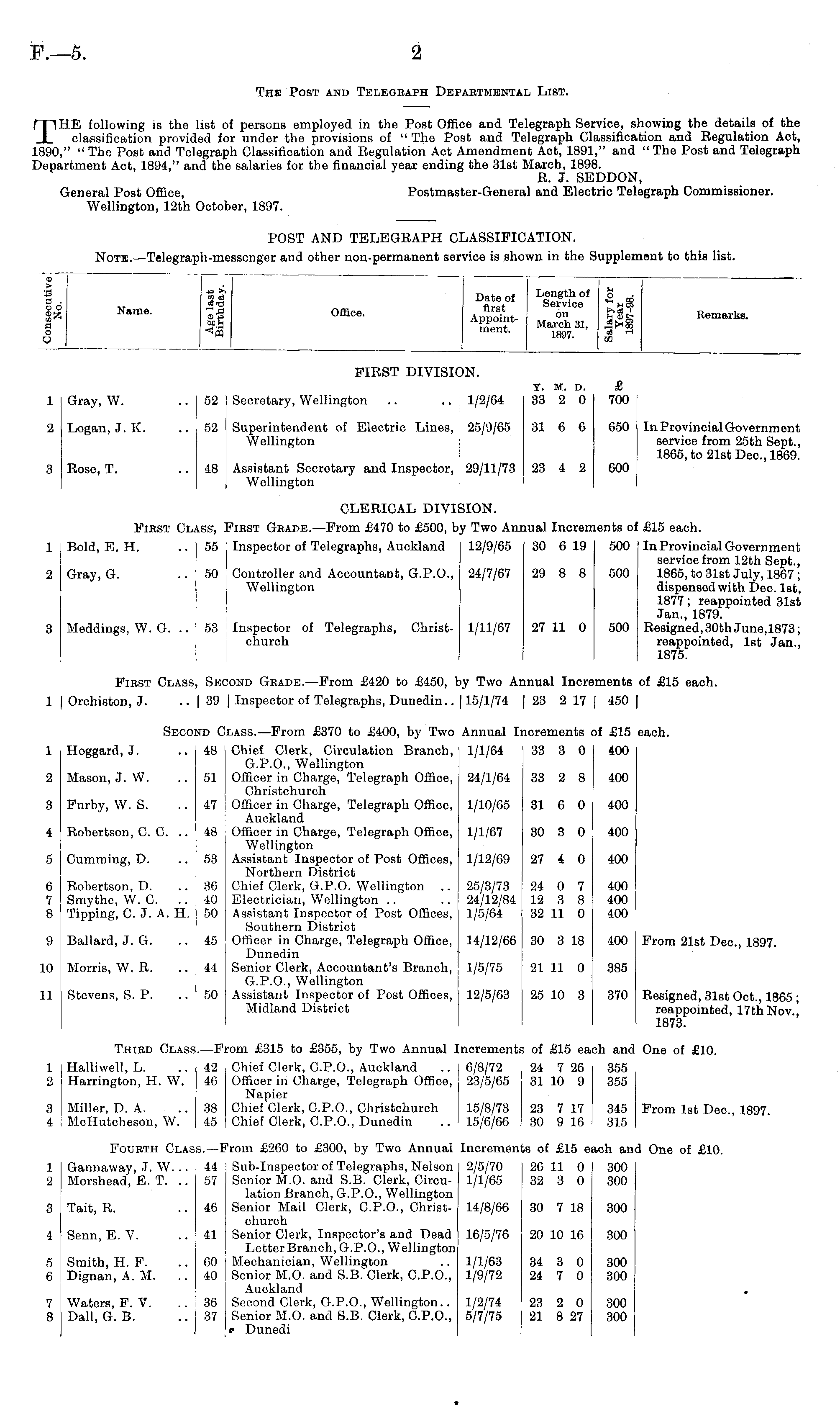 The Post and Telegbaph Departmental List. THE following is the list of persons employed in the Post Office and Telegraph Service, showing the details of the classification provided for under the provisions of " The Post and Telegraph Classification and Regulation Act, 1890," "The Post and Telegraph Classification and Regulation Act Amendment Act, 1891," and "The Post and Telegraph Department Act, 1894," and the salaries for the financial year ending the 31st March, 1898. R. J. SEDDON, General Post Office, Postmaster-General and Electric Telegraph Commissioner. Wellington, 12th October, 1897.