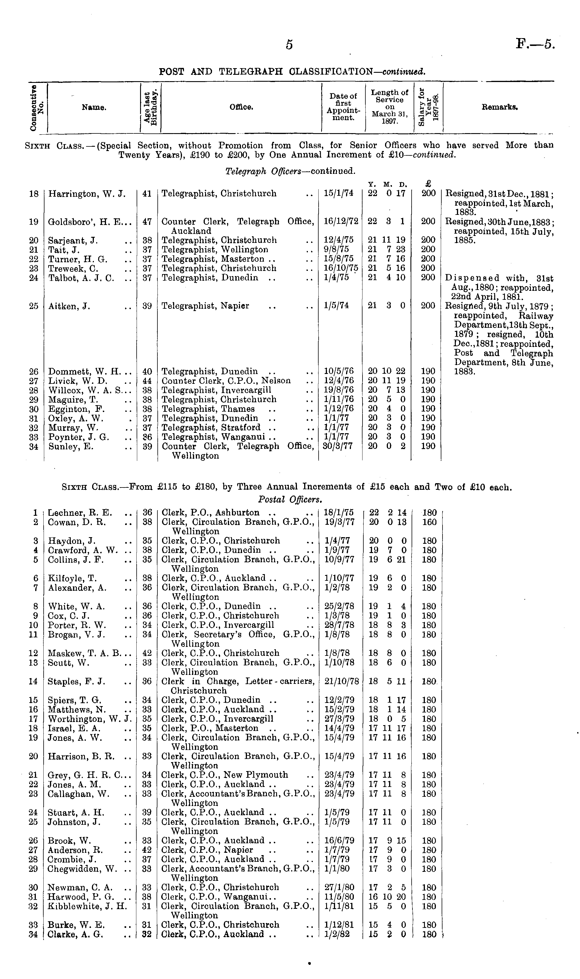 _ Si *__ 3 o o Name. ■»* t_ <X>4_ tscS *3 Office. Date of Length of J . D flrst Se ™ _,|. Remarks, Iixth Class. — (Special Section, without Promotion from Class, for Senior Officers who have served More than Twenty Years), £190 to £200, by One Annual Increment of £10 — continued. Telegraph Officers —continued. 18 19 20 21 22 23 24 25 Y. m. d. £ 18 Harrington, W. J. 41 Telegraphist, Christchurch .. 15/1/74 122 0 17 200 I Resigned, 31stDec, 1881; reappointed, 1st March, 1883. 19 Goldsboro', H. E... 47 Counter Clerk, Telegraph Office, 16/12/72 22 3 1 200 Resigned,30thJune,1883; Auckland reappointed, 15th July, 20 Sarjeant, J. .. 38 Telegraphist, Christchurch .. 12/4/75 21 11 19 200 1885. 21 Tait, J. .. 37 Telegraphist, Wellington .. 9/8/75 21 7 23 200 22 Turner, H. G. .. 37 Telegraphist, Masterton .. .. 15/8/75 21 7 16 200 23 Treweek, C. .. 37 Telegraphist, Christchurch .. 16/10/75 21 5 16 200 24 Talbot, A. J. C. ..87 Telegraphist, Dunedin .. .. 1/4/75 21 4 10 200 Dispensed with, 31st Aug., 1880; reappointed, 22nd April, 1881. 25 Aitken, J. .. 39 Telegraphist, Napier .. .. 1/5/74 21 3 0 200 Resigned, 9th July, 1879; reappointed, Railway Department,13th Sept., 1879 ; resigned, 10th Dec.,1881; reappointed, Post and Telegraph Department, 8th June, 26 Dommett, W. H. .. 40 Telegraphist, Dunedin .. .. 10/5/76 20 10 22 190 1883. 27 Livick, W. D. .. 44 Counter Clerk, C.P.O., Nelson .. 12/4/76 20 1119 190 28 Willcox, W. A. S... 38 Telegraphist, Invercargill ..19/8/76 20 7 13 190 29 Maguire, T. .. 38 Telegraphist, Christchurch .. 1/11/76 20 5 0 190 30 Egginton, F. .. 38 Telegraphist, Thames .. .. 1/12/76 20 4 0 190 31 Oxley, A. W. . 37 Telegraphist, Dunedin .. .. 1/1/77 20 3 0 190 32 Murray, W. .. 37 Telegraphist, Stratford .. .. 1/1/77 20 3 0 190 33 Poynter, J. G. .. 36 Telegraphist, Wanganui .. .. 1/1/77 20 3 0 190 34 Sunley, E. .. 39 Counter Clerk, Telegraph Office, 30/3/77 20 0 2 190 Wellington 47 38 37 37 37 37 39 26 27 28 29 30 31 32 88 34 10 44 38 38 38 37 37 86 39 10/5/76 12/4/76 19/8/76 1/11/76 1/12/76 1/1/77 1/1/77 1/1/77 30/3/77 20 10 22 190 20 11 19 190 20 7 13 190 20 5 0 190 20 4 0 190 20 3 0 190 20 3 0 190 20 3 0 190 20 0 2 190 190 190 190 190 190 190 190 190 190 Sixth Class. —From £115 to £180, by Three Annual Increments of £15 each and Two of £10 each. cements o £15 each and 1 Postal Officers. 1 2 1 Lechner, R. E. .. 36 Clerk, P.O., Ashburton .. .. 18/1/75 22 2 14 180 2 Cowan, D. R. .. 38 Clerk, Circulation Branch, G.P.O., 19/3/77 20 0 13 160 Wellington 3 Hay don, J. .. 35 Clerk, C.P.O., Christchurch .. 1/4/77 20 0 0 180 4 Crawford, A. W. .. 38 Clerk, C.P.O., Dunedin .. .. 1/9/77 19 7 0 180 5 Collins, J. F. .. 35 Clerk, Circulation Branch, G.P.O., 10/9/77 19 6 21 180 Wellington 6 Kilfoyle, T. .. 38 Clerk, C.P.O., Auckland .. .. 1/10/77 19 6 0 180 7 Alexander, A. .. 36 Clerk, Circulation Branch, G.P.O., 1/2/78 19 2 0 180 Wellington 8 White, W. A. .. 36 Clerk, C.P.O., Dunedin .. .. 25/2/78 19 1 4 180 9 Cox, C. J. .. 36 Clerk, C.P.O., Christchurch .. 1/3/78 19 1 0 180 10 Porter, R. W. .. 34 Clerk, C.P.O., Invercargill .. 28/7/78 18 8 3 180 11 Brogan, V. J. .. 34 Clerk, Secretary's Office, G.P.O., 1/8/78 18 8 0 180 Wellington 12 Maskew, T. A. B. .. 42 Clerk, C.P.O., Christchurch .. 1/8/78 18 8 0 180 13 Scutt, W. .. 33 Clerk, Circulation Branch, G.P.O., 1/10/78 18 6 0 180 Wellington 14 Staples, F. J. .. 36 Clerk in Charge, Letter - carriers, 21/10/78 18 5 11 180 Christchurch 15 Spiers, T. G. .. 34 Clerk, C.P.O., Dunedin .. .. 12/2/79 18 117 180 16 Matthews, N. .. 33 Clerk, C.P.O., Auckland .. .. 15/2/79 18 1 14 180 17 Worthington, W. J. 35 Clerk, C.P.O., Invercargill .. 27/3/79 18 0 5 180 18 Israel, E. A. .. 35 Clerk, P.O., Masterton .. .. 14/4/79 17 11 17 180 19 Jones, A. W. .. 34 Clerk, Circulation Branch, G.P.O., 15/4/79 17 11 16 180 Wellington 20 Harrison, B. R. .. 33 Clerk, Circulation Branch, G.P.O., 15/4/79 17 1116 180 Wellington 21 Grey, G. H. R. C... 34 Clerk, C.P.O., New Plymouth .. 23/4/79 17 11 8 180 22 Jones, A.M. .. 33 Clerk, C.P.O., Auckland .. .. 23/4/79 17 11 8 180 23 Callaghan, W. .. 33 Clerk, Accountant's Branch, G.P.O., 23/4/79 17 11 8 180 Wellington 24 Stuart, A. H. .. 39 Clerk, C.P.O., Auckland .. .. 1/5/79 17 11 0 180 25 Johnston, J. .. 35 Clerk, Circulation Branch, G.P.O., 1/5/79 17 11 0 180 Wellington 26 Brook, W. .. 33 Clerk, C.P.O., Auckland .. .. 16/6/79 17 9 15 180 27 Anderson, R. .. 42 Clerk, C.P.O., Napier .. .. 1/7/79 17 9 0 180 28 Crombie, J. .. 37 Clerk, C.P.O., Auckland .. .. 1/7/79 17 9 0 180 29 Chegwidden, W. .. 33 Clerk, Accountant's Branch, G.P.O., 1/1/80 17 3 0 180 Wellington 30 Newman, C. A. .. 33 Clerk, C.P.O., Christchurch .. 27/1/80 17 2 5 180 31 Harwood, P. G. .. 38 Clerk, C.P.O., Wanganui.. .. 11/5/80 16 10 20 180 32 Kibblewhite, J. H. 31 Clerk, Circulation Branch, G.P.O., 1/11/81 15 5 0 180 Wellington 33 Burke, W. E. .. 31 Clerk, C.P.O., Christchurch .. 1/12/81 15 4 0 180 34 Clarke, A. G. .. 32 Clerk, C.P.O., Auckland .. .. 1/2/82 15 2 0 180 i 18/1/75 19/3/77 22 2 14 180 20 0 13 160 3 4 5 1/4/77 1/9/77 10/9/77 20 0 0 180 19 7 0 180 19 6 21 180 6 7 1/10/77 1/2/78 19 6 0 180 19 2 0 180 8 9 10 11 25/2/78 1/3/78 28/7/78 1/8/78 19 1 4 180 19 1 0 180 18 8 3 180 18 8 0 180 12 13 1/8/78 1/10/78 18 8 0 180 18 6 0 180 14 21/10/78 18 5 11 180 15 16 17 18 19 12/2/79 15/2/79 27/3/79 14/4/79 15/4/79 18 1 17 180 18 1 14 180 18 0 5 180 17 11 17 180 17 11 16 180 20 15/4/79 17 11 16 180 21 22 23 23/4/79 23/4/79 23/4/79 17 11 8 180 17 11 8 180 17 11 8 180 24 25 1/5/79 1/5/79 17 11 0 180 17 11 0 180 26 27 28 29 16/6/79 1/7/79 1/7/79 1/1/80 17 9 15 180 17 9 0 180 17 9 0 180 17 3 0 180 30 :)1 32 27/1/80 11/5/80 1/11/81 17 2 5 180 16 10 20 180 15 5 0 180 33 34 1/12/81 1/2/82 15 4 0 180 15 2 0 180