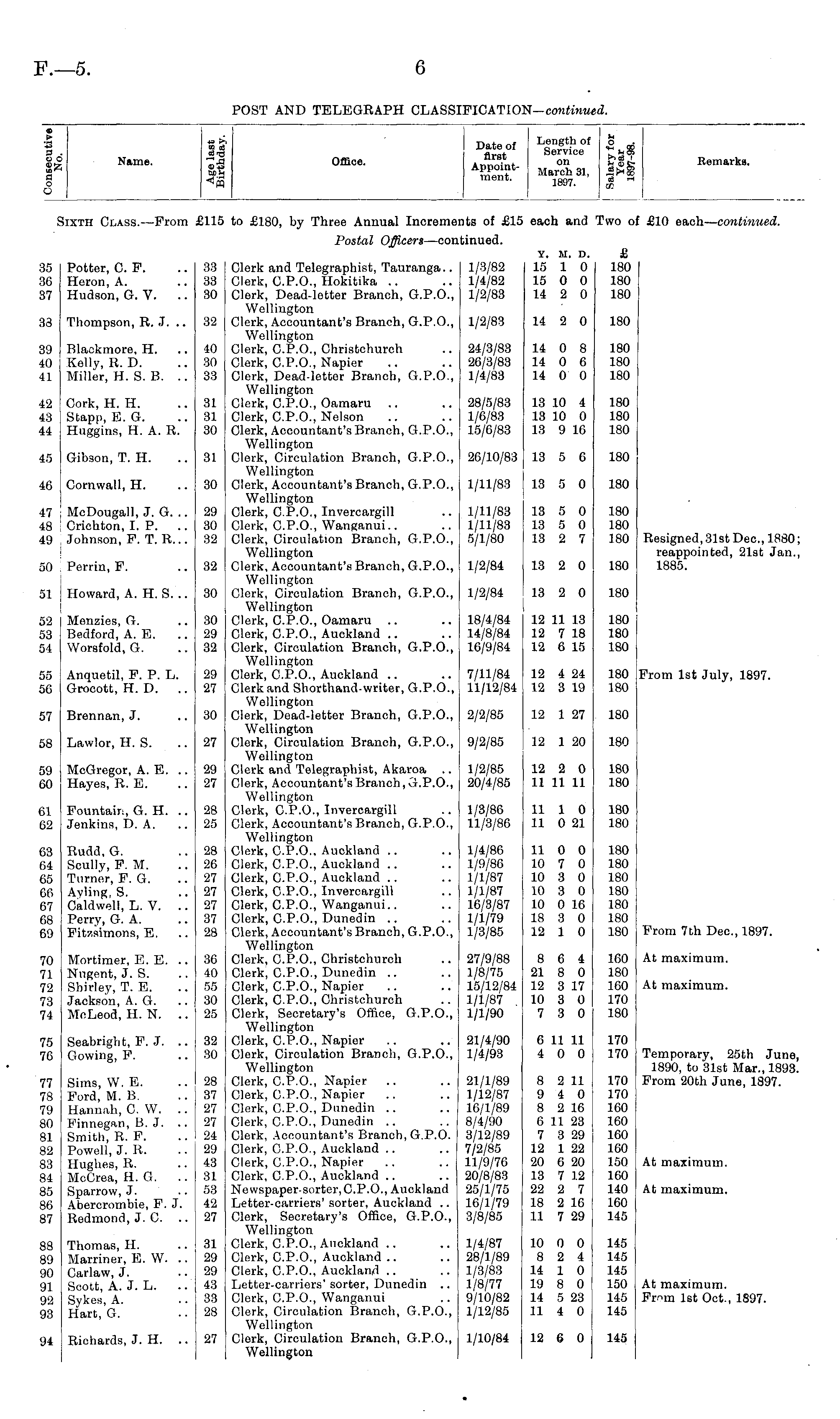 9 > 3 . o o _£ a o o Name. co cd. Cdrf-j CD 44, Mr. Office. Date of Lens* of | first Service ment - 1897. $ rt Remarks. 15 16 17 ,ixth Class. —From £115 Potter, C. F. .. 33 Heron, A. 33 Hudson, G. V. .. 30 to £180, by Three Annual Increme: Postal Officers —con Clerk and Telegraphist, Tauranga.. Clerk, C.P.O., Hokitika .. Clerk, Dead-letter Branch, G.P.O., Wellington Clerk, Accountant's Branch, G.P.O., Wellington Clerk, C.P.O., Christchurch Clerk, C.P.O., Napier Clerk, Dead-letter Branch, G.P.O., Wellington Clerk, C.P.O., Oamaru .. Clerk, C.P.O., Nelson Clerk, Accountant'sBranch, G.P.O., Wellington Clerk, Circulation Branch, G.P.O., Wellington Clerk, Accountant's Branch, G.P.O., Wellington Clerk, C.P.O., Invercargill Clerk, C.P.O., Wanganui.. Clerk, Circulation Branch, G.P.O., Wellington Clerk, Accountant'sBranch, G.P.O., Wellington Clerk, Circulation Branch, G.P.O., Wellington Clerk, C.P.O., Oamaru .. Clerk, C.P.O., Auckland Clerk, Circulation Branch, G.P.O., Wellington Clerk, C.P.O., Auckland .. Clerk and Shorthand-writer, G.P.O., Wellington Clerk, Dead-letter Branch, G.P.O., Wellington Clerk, Circulation Branch, G.P.O., Wellington Clerk and Telegraphist, Akaroa .. Clerk, Accountant's Branch, G.P.O., Wellington Clerk, C.P.O., Invercargill Clerk, Accountant's Branch, G.P.O., Wellington Clerk, C.P.O., Auckland .. Clerk, C.P.O., Auckland Clerk, C.P.O., Auckland .. Clerk, C.P.O., Invercargill Clerk, C.P.O., Wanganui Clerk, C.P.O., Dunedin .. Clerk, Accountant's Branch, G.P.O., Wellington Clerk, C.P.O., Christchurch Clerk, C.P.O., Dunedin .. Clerk, C.P.O., Napier Clerk, C.P.O., Christchurch Clerk, Secretary's Office, G.P.O., Wellington Clerk, C.P.O., Napier Clerk, Circulation Branch, G.P.O., Wellington Clerk, C.P.O., Napier .. Clerk, G.P.O., Napier Clerk, C.P.O., Dunedin .. Clerk, C.P.O., Dunedin .. Clerk, Accountant's Branch, G.P.O. Clerk, C.P.O., Auckland Clerk, C.P.O., Napier Clerk, C.P.O., Auckland .. Newspaper-sorter, C.P.O., Auckland Letter-carriers' sorter, Auckland .. Clerk, Secretary's Office, G.P.O., Wellington Clerk, C.P.O., Auckland .. Clerk, C.P.O., Auckland Clerk, C.P.O., Auckland Letter-carriers' sorter, Dunedin .. Clerk, C.P.O., Wanganui Clerk, Circulation Branch, G.P.O., I Wellington Clerk, Circulation Branch, G.P.O., J Wellington its of £15 ;inued. 1/3/82 1/4/82 1/2/83 each and Y. M. D. 15 1 0 15 0 0 14 2 0 Two ol £ 180 180 180 £ £10 each— continued. 13 Thompson, R. J. .. 32 1/2/83 14 2 0 180 19 10 11 Blaekmore, H. 40 Kelly, R. D. .. 30 Miller, H. S. B. .. 33 24/3/83 26/3/83 1/4/83 14 0 8 14 0 6 14 0 0 180 180 180 42 43 44 Cork, H. H. .. 31 Stapp, E. G. .. 31 Huggius, H. A. R. 30 28/5/83 1/6/83 15/6/83 13 10 4 13 10 0 13 9 16 180 180 180 45 Gibson, T. H. .. 31 ! 26/10/83 13 5 6 180 46 Cornwall, H. .. 30 1/11/83 13 5 0 180 47 IS 49 McDougall, J. G. .. 29 Crichton, LP. .. 30 Johnson, F. T. R... 32 1/11/83 1/11/83 5/1/80 13 5 0 13 5 0 13 2 7 180 180 180 Resigned, 31st Dec, 1880; reappointed, 21st Jan., 1885. 50 Perrin, F. .. 32 1/2/84 13 2 0 180 51 Howard, A. H. S. .. 30 1/2/84 13 2 0 180 52 53 54 Menzies, G. .. 30 Bedford, A. E. .. 29 Worsfold, G. .. 32 18/4/84 14/8/84 16/9/84 12 11 13 12 7 18 12 6 15 180 180 180 From 1st July, 1897. 55 50 Anquetil, F. P. L. 29 Grocott, H. D. .. 27 7/11/84 11/12/84 12 4 24 12 3 19 180 180 57 Brennan, J. .. 30 2/2/85 12 1 27 180 58 Lawlor, H. S. .. 27 9/2/85 12 1 20 180 59 00 McGregor, A. E. .. 29 Hayes, R. E. .. 27 1/2/85 20/4/85 12 2 0 11 11 11 180 180 61 62 Fountain, G. H. .. 28 Jenkins, D. A. .. 25 1/3/86 11/3/80 11 1 0 11 0 21 180 180 From 7th Dec, 1897. 63 64 65 66 67 63 69 Rudd, G. .. 28 Scully, F. M. .. 26 Turner, P. G. .. 27 Avling, S. .. 27 Caldwell, L. V. .. 27 Perry, G. A. .. 37 Fitzsimons, E. .. 28 1/4/86 1/9/86 1/1/87 1/1/87 16/3/87 1/1/79 1/3/85 11 0 0 10 7 0 10 3 0 10 3 0 10 0 16 18 3 0 12 1 0 180 180 180 180 180 180 180 70 71 72 73 74 Mortimer, E. E. .. 36 Nugent, J. S. .. 40 Shirley, T. E. .. 55 Jackson, A. G. .. 30 MoLeod, H. N. .. 25 27/9/88 1/8/75 15/12/84 1/1/87 1/1/90 8 6 4 21 8 0 12 3 17 10 3 0 7 3 0 100 180 100 170 180 At maximum. At maximum. 75 76 77 78 79 80 81 82 83 84 85 86 87 Seabright, P. J. .. 32 Gowing, P. .. 30 Sims, W. E. .. 28 Ford, M. B. .. I 37 Hannah, C. W. .. 27 Pinnegan, B. J. .. ! 27 Smith, R. F. ..24 Powell, J. R. .. i 29 Hughes, R. .. | 43 McCrea, H. G. .. 31 Sparrow, J. 53 Abercrombie, F. J. 42 Redmond, J. C. .. 27 21/4/90 1/4/93 21/1/89 1/12/87 10/1/89 8/4/90 3/12/89 7/2/85 11/9/70 20/8/83 25/1/75 16/1/79 3/8/85 6 11 11 4 0 0 8 2 11 9 4 0 8 2 16 6 11 23 7 3 29 12 1 22 20 6 20 13 7 12 22 2 7 18 2 16 11 7 29 170 170 170 170 160 160 160 160 150 160 140 160 145 Temporary, 25th June, 1890, to 31st Mar., 1893. From 20th June, 1897. At maximum. At maximum. 88 89 90 91 92 93 Thomas, H. .. 31 Marriner, E. W. .. 29 Carlaw, J. .. 29 Scott, A. J. L. .. 43 Sykes, A. .. 33 Hart, G. .. 28 1/4/87 28/1/89 1/3/83 1/8/77 9/10/82 1/12/85 10 0 0 8 2 4 14 1 0 19 8 0 14 5 23 11 4 0 145 145 145 150 145 145 At maximum. From 1st Oct., 1897. 94 Richards, J. H. .. 27 1/10/84 12 6 0 145