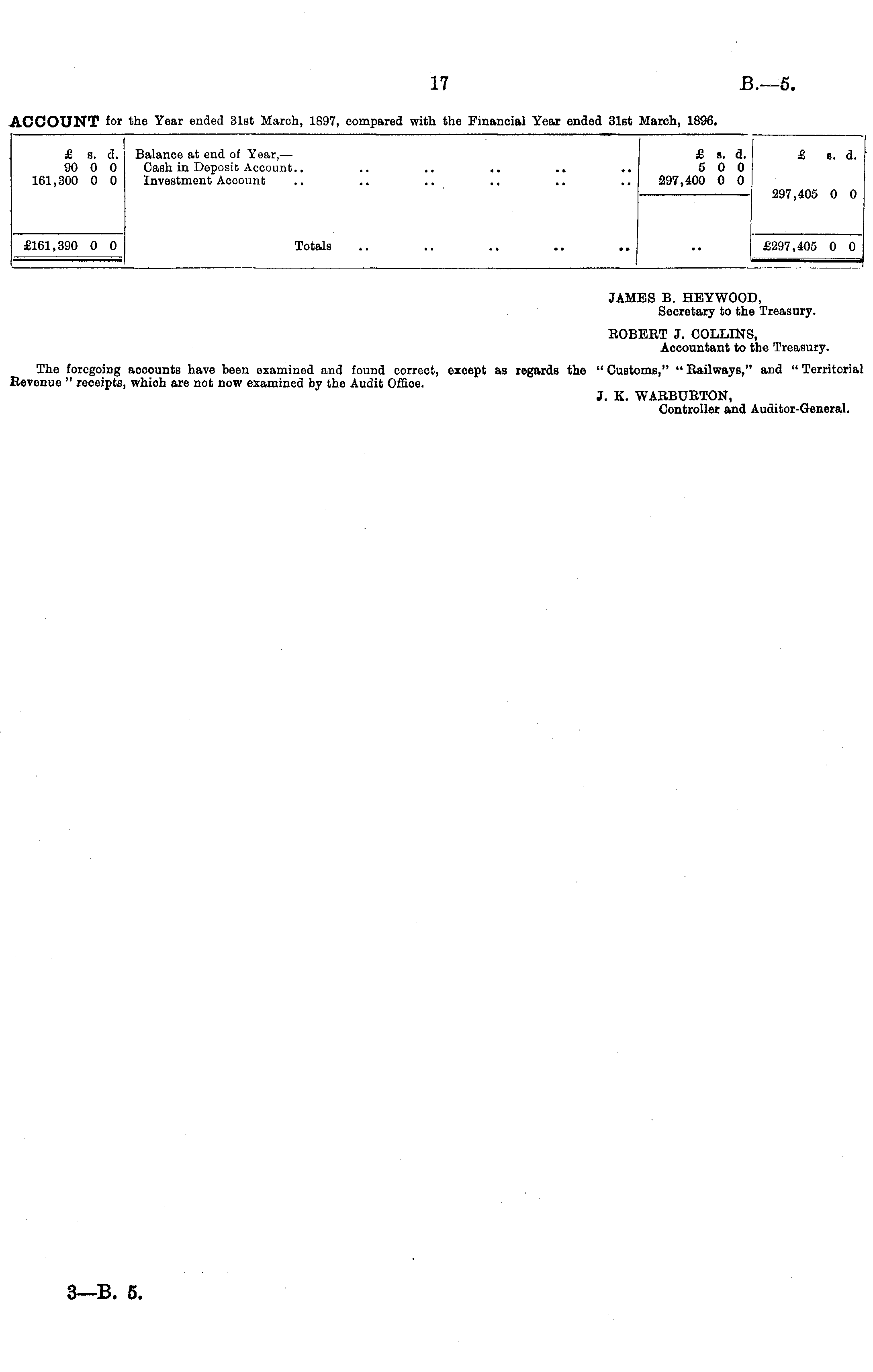 JAMBS B. HEYWOOD, Secretary to the Treasury. EOBERT J. COLLINS, Accountant to the Treasury. The foregoing accounts have been examined and found correct, except as regards the " Customs," " Eailways," and " Territorial Revenue " receipts, which are not now examined by the Audit Office. 3. K. WARBURTON, Controller and Auditor-General.