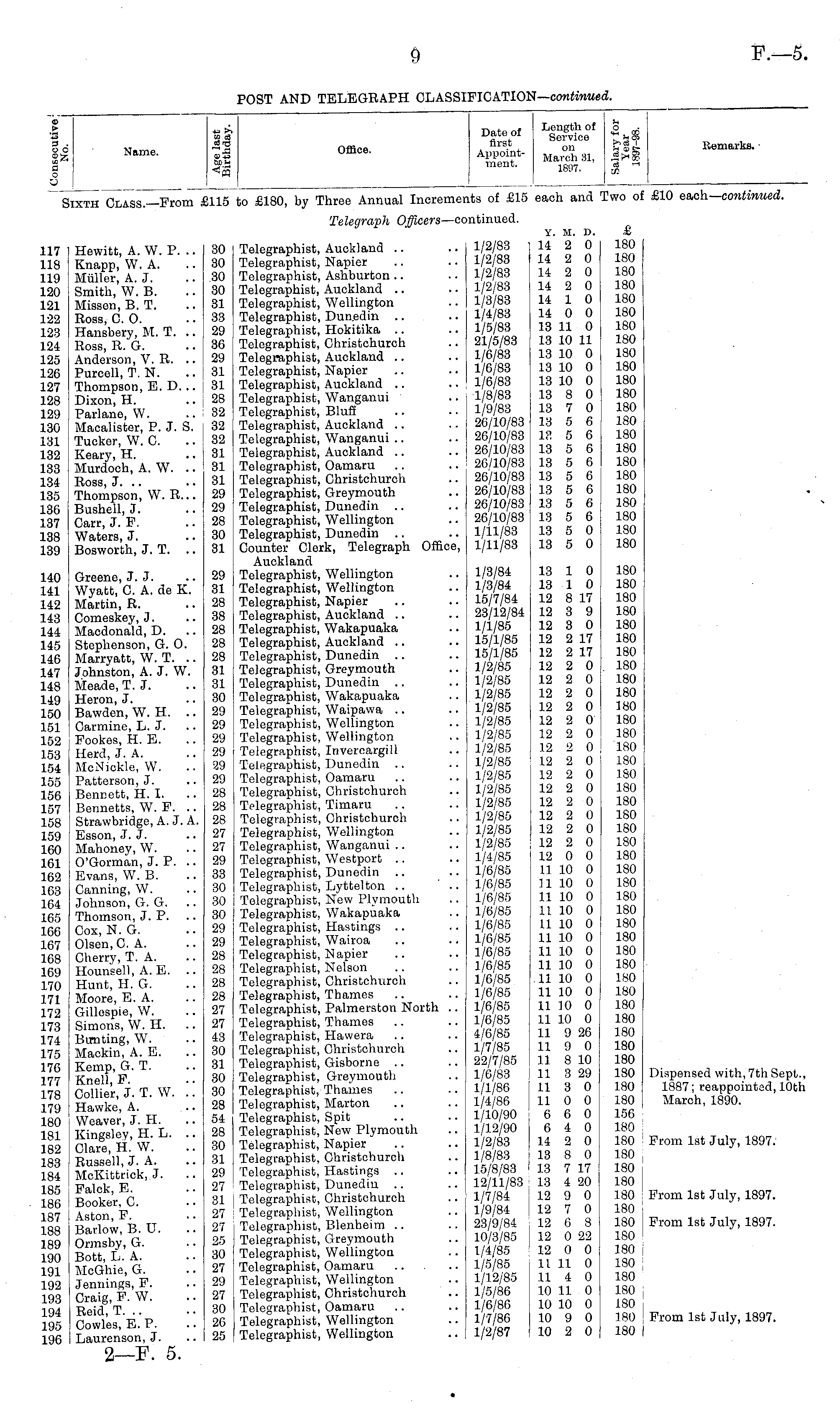 > to S* a o O Name. _ cd _-3 <jq Office. Date of first Appointment. Length of Service on March 31, 1897. hi _ __" 02 ltomarks. - Sixth Class. —From .115 to £180, by Three Annual Incrome its of £15 each and Two o: £10 each — continued. Telegraph Officers— or mtinued. Y. II. D. 14 2 0 14 2 0 14 2 0 14 2 0 14 1 0 14 0 0 13 11 0 18 10 11 13 10 0 13 10 0 13 10 0 13 8 0 13 7 0 13 5 6 18 5 6 13 5 6 13 5 6 13 5 6 13 5 6 13 5 6 13 5 6 13 5 0 13 5 0 £ 180 180 180 180 180 180 180 j 180 j 180 180 180 180 180 180 180 180 180 180 180 180 180 180 180 117 118 119 120 121 122 123 124 125 126 127 128 129 130 131 132 133 134 135 136 137 138 139 Hewitt, A. W. P. .. Knapp, W. A. Miiller, A. J. Smith, W. B. Missen, B. T. Ross, CO. Hansbery, M. T. .. Ross, R. G. Anderson, V. R. Purcell, T.N. Thompson, E. D. .. Dixon, H. Parlane, W. Macalister, P. J. S. Tucker, W. C Keary, H. Murdoch, A. W. .. Ross, J. .. Thompson, W. R... Bushel], J. Carr, J. F. Waters, J. Bosworth, J. T. .. 30 30 80 30 81 33 20 36 29 31 31 28 32 82 32 81 31 31 20 29 28 80 31 Telegraphist, Auckland Telegraphist, Napier Telegraphist, Ashburton Telegraphist, Auckland Telegraphist, Wellington Telegraphist, Dunedin Telegraphist, Hokitika Telegraphist, Christchurch Telegraphist, Auckland Telegraphist, Napier Telegraphist, Auckland Telegraphist, Wanganui Telegraphist, Bluff Telegraphist, Auckland Telegraphist, Wanganui Telegraphist, Auckland Telegraphist, Oamaru Telegraphist, Christchurch Telegraphist, Greymouth Telegraphist, Dunedin Telegraphist, Wellington Telegraphist, Dunedin Counter Clerk, Telegraph Office, Auckland Telegraphist, Wellington Telegraphist, Wellington Telegraphist, Napier Telegraphist, Auckland Telegraphist, Wakapuaka Telegraphist, Auckland .. Telegraphist, Dunedin Telegraphist, Greymouth Telegraphist, Dunedin Telegraphist, Wakapuaka Telegraphist, Waipawa Telegraphist, Wellington Telegraphist, Wellington Telegraphist, Invercargill Telegraphist, Dunedin Telegraphist, Oamaru Telegraphist, Christchurch Telegraphist, Timaru Telegraphist, Christchurch Telegraphist, Wellington Telegraphist, Wanganui Telegraphist, Westport Telegraphist, Dunedin ! Telegraphist, Lyttelton .. .. Telegraphist, New Plymouth Telegraphist, Wakapuaka Telegraphist, Hastings Telegraphist, Wairoa Telegraphist, Napier Telegraphist, Nelson Telegraphist, Christchurch Telegraphist, Thames Telegraphist, Palmerston North .. Telegraphist, Thames Telegraphist, Hawera Telegraphist, Christchurch Telegraphist, Gisborne Telegraphist, Greymouth Telegraphist, Thames Telegraphist, Marton Telegraphist, Spit Telegraphist, New Plymouth Telegraphist, Napier Telegraphist, Christchurch Telegraphist, Hastings Telegraphist, Dunedin Telegraphist, Christchurch Telegraphist, Wellington Telegraphist, Blenheim Telegraphist, Greymouth Telegraphist, Wellington Telegraphist, Oamaru Telegraphist, Wellington Telegraphist, Christchurch Telegraphist, Oamaru Telegraphist, Wellington Telegraphist, Wellington 1/2/83 1 1/2/83 1/2/83 1/2/83 1/3/83 1/4/83 1/5/83 21/5/83 1/6/83 1/6/83 1/6/83 1/8/83 1/9/83 26/10/83 26/10/83 26/10/83 26/10/83 26/10/83 26/10/83 26/10/83 26/10/83 1/11/83 1/11/83 140 141 142 143 144 145 146 147 148 149 150 151 152 153 154 155 156 157 158 159 160 161 162 163 164 165 166 167 168 169 170 171 172 173 174 175 176 177 178 179 180 181 182 183 184 185 186 187 188 189 190 191 192 193 194 195 196 Greene, J. J. Wyatt, C. A. de K. Martin, R. Comeskey, J. Macdonald, D. Stephenson, G. 0. Marryatt, W. T. .. Johnston, A. J. W. Meade, T.J. Heron, J. Bawden, W. H. .. Carmine, L. J. Fookes, H. E. Herd, J. A. McNickle, W. Patterson, J. Bennett, H. I. Bennetts, W. F. .. Strawbridge, A. J. A. Esson, J. J. Mahoney, W. O'Gorman, J. P. Evans, W. B. Canning, W. Johnson, G. G. Thomson, J. P. Cox, N. G. Olsen.CA. Cherry, T. A. Hounsell, A. E. .. Hunt, H. G. Moore, E. A. Gillespie, W. Simons, W. H. Bunting, W. Mackin, A. E. Kemp, G. T. Knell, F. Collier, J. T. W. .. Hawke, A. Weaver, J. H. Kingslcy, H. L. Clare, H. W. Russell, J. A. ' McKitti'ick, J. Falck, E. Booker, C. Aston, F. Barlow, B. U. I Ormsby, G. I Bott, L. A. McGhie, G. Jennings, F. Craig, F. W. Reid, T. .. Cowles, E. P. Laurenson, J. 20 31 28 88 28 28 28 31 31 80 20 29 29 29 29 29 28 28 28 27 27 29 33 30 30 30 29 20 28 28 28 28 27 27 43 80 81 30 30 28 54 28 30 31 29 27 31 27 27 25 30 27 29 27 30 26 25 1/3/84 1/3/84 15/7/84 23/12/84 1/1/85 15/1/85 15/1/85 1/2/85 1/2/85 1/2/85 1/2/85 1/2/85 1/2/85 1/2/85 1/2/85 1/2/85 1/2/85 1/2/85 1/2/85 1/2/85 1/2/85 1/4/85 1/6/85 1/6/85 1/6/85 1/6/85 1/6/85 1/6/85 1/6/85 1/6/85 1/6/85 1/6/85 1/6/85 1/6/85 4/6/85 1/7/85 22/7/85 1/6/83 1/1/86 1/4/86 1/10/90 1/12/90 | 1/2/83 1/8/83 15/8/83 12/11/83 1/7/84 1/9/84 23/9/84 10/3/85 1/4/85 1/5/85 1/12/85 1/5/86 1/6/86 1/7/86 1/2/87 13 1 0 13 1 0 12 8 17 12 3 9 12 3 0 12 2 17 12 2 17 12 2 0 12 2 0 12 2 0 12 2 0 12 2 0 12 2 0 12 2 0 12 2 0 12 2 0 12 2 0 12 2 0 12 2 0 12 2 0 12 2 0 12 0 0 11 10 0 11 10 0 11 10 0 11 10 0 11 10 0 11 10 0 11 10 0 11 10 0 11 10 0 11 10 0 11 10 0 11 10 0 11 9 26 11 9 0 11 8 10 11 3 29 11 3 0 11 0 0 6 6 0 6 4 0 14 2 0 13 8 0 13 7 17 13 4 20 12 9 0 12 7 0 12 0 8 12 0 22 12 0 0 11 11 0 11 4 0 10 11 0 10 10 0 10 9 0 10 2 0 180 180 180 ! 180 180 180 180 180 ! 180 180 180 180 180 180 180 180 180 180 180 180 180 180 180 180 180 180 180 180 180 180 180 180 180 180 180 180 180 180 180 180 156 180 180 180 180 180 180 180 180 180 180 180 180 180 180 180 180 Dispensed with, 7th Sept., 1887; reappointed, 10th March, 1890. From 1st July, 1897. From 1st July, 1897. From 1st July, 1897. From 1st July, 1897.