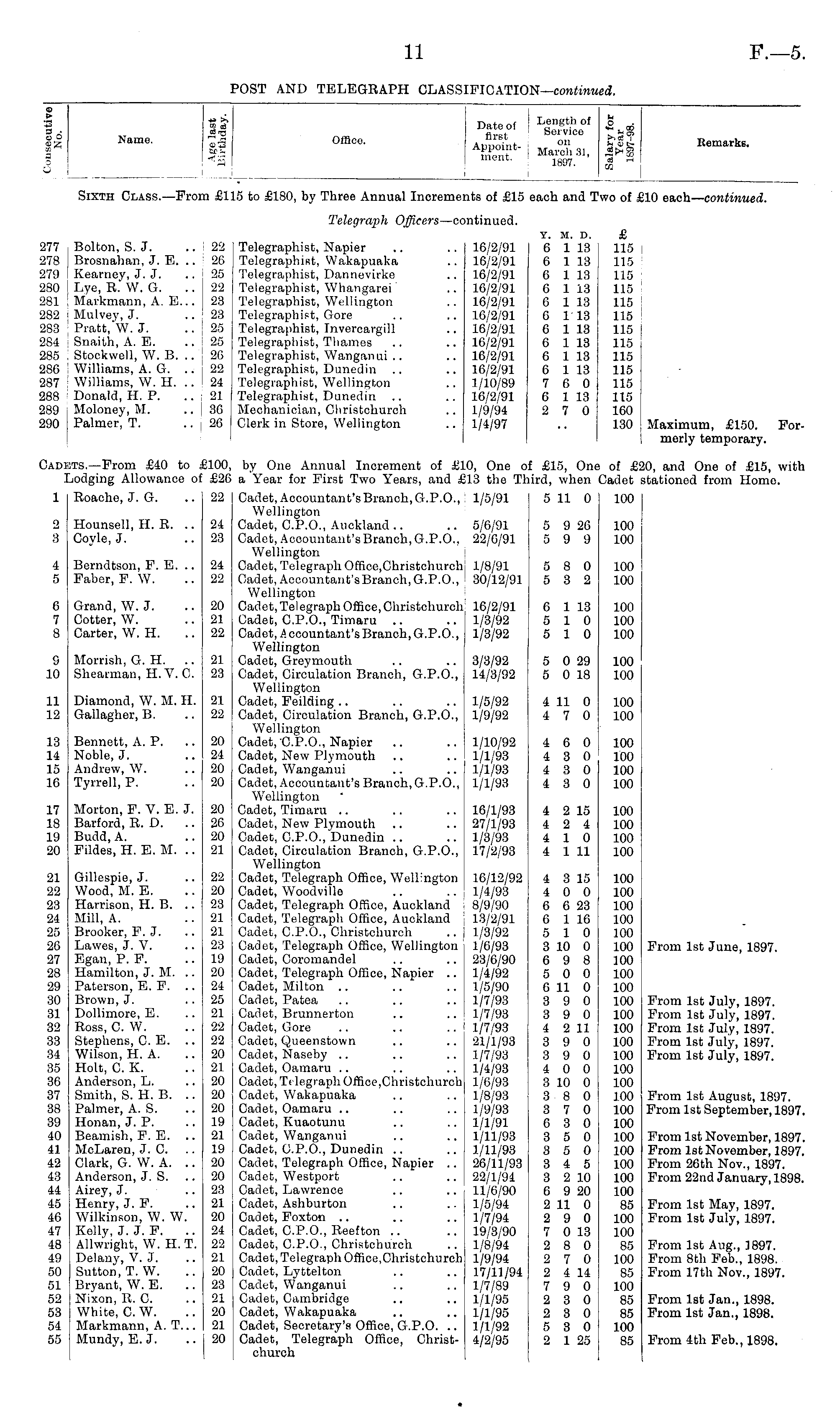 > 2>_ . 2 Name. ~ _ Office. Date of ! L |" g „ t i ! i of £._ first be " lce >._? _:!_..'- «*_£«. m mem. * H Remarks. Sixth Class.—From £1 .5 to £180, by Three Annual Increments of £15 each and Two of £10 each— continued. Bolton, S. J. .. 22 Brosnahan, J. E. .. 26 Kearney, J.J. .. 25 Lye, R. W. G. .. 22 Markmann, A. E... 23 Mulvey, J. .. 23 Pratt,'W. J. ..25 Snaith, A. E. .. 25 Stockwoll, W. B. .. 26 Williams, A. G. .. j 22 Williams, W. H. .. 24 Donald, H. P. .. 21 Moloney, M. .. 36 Palmer, T. .. 26 Telegraph Officers —continued. Y. m. d. £ 6 1 13 115 ! 6 1 13 115 6 1 13 115 6 1 13 115 6 1 13 115 6 1 13 115 6 1 13 115 6 1 13 115 6 1 13 115 6 1 13 115 7 6 0 115 6 1 13 115 2 7 0 160 130 Maximum, £150. For- , merly temporary. !77 !78 !79 !80 !81 !82 !83 184 !85 !86 187 !88 !89 190 Telegraphist, Napier .. .. 16/2/91 Telegraphist, Wakapuaka .. 16/2/91 Telegraphist, Dannevirke .. 16/2/91 Telegraphist, Whangarei .. 16/2/91 Telegraphist, Wellington .. 16/2/91 Telegraphist, Gore .. .. 16/2/91 Telegraphist, Tnvercargill .. 16/2/91 Telegraphist, Thames .. .. 16/2/91 Telegraphist, Wanganui .. .. 16/2/91 Telegraphist, Dunedin .. .. 16/2/91 Telegraphist, Wellington .. 1/10/89 Telegraphist, Dunedin .. .. 16/2/91 Mechanician, Christchurch .. 1/9/94 Clerk in Store, Wellington .. 1/4/97 '■A I) :ts.—From £40 to £100, -lodging Allowance of £26 Roache, J. G. .. 22 by One Annual Increment of £10, One c a Year for First Two Years, and £13 the Tl f £15, One of £20, and One of £15, with rird, when Cadet stationed from Home. 1 2 3 4 5 6 7 8 S 10 11 12 13 14 15 16 17 18 19 20 21 22 23 24 25 26 27 28 29 30 31 32 33 34 35 36 37 38 39 40 41 42 43 44 45 46 47 48 49 50 51 52 53 54 55 Hounsell, H. R. .. 24 Coyle, J. .. 23 Berndtson, F. E. .. 24 Faber, F. W. .. 22 Grand, W. J. .. 20 Cotter, W. .. 21 Carter, W. H. .. 22 Morrish, G. H. .. 21 Shearman, H. V. C. 23 Diamond, W. M. H. 21 Gallagher, B. .. 22 Bennett, A. P. .. 20 Noble, J. .. 24 Andrew, W. .. 20 Tyrrell, P. .. 20 Morton, F. V. E. J. 20 Barford, R. D. .. 26 Budd, A. .. 20 Fildes, H. E. M. .. 21 Gillespie, J. .. 22 Wood, M. E. .. 20 Harrison, H. B. .. 23 Mill, A. .. 21 Brooker, F. J. .. 21 Lawes, J. V. .. 23 Egan, P. F. .. 19 Hamilton, J. M. .. 20 Paterson, E. F. .. 24 Brown, J. 25 Dollimore, E. .. 21 Ross, C. W. .. 22 Stephens, C E. .. 22 Wilson, H. A. .. 20 Holt, C. K. .. 21 Anderson, L. 20 Smith, S. H. B. .. 20 Palmer, A. S. .. 20 Honan, J. P. .. 19 Beamish, F. E. .. 21 McLaren, J. C. .. 19 Clark, G. W. A. .. 20 Anderson, J. S. .. 20 Airey, J. .. 23 Henry, J. F. .. 21 Wilkinson, W. W. 20 Kelly, J. J. F. .. 24 Allwright, W. H. T. 22 Delany, V. J. .. 21 Sutton, T. W. .. 20 Bryant, W. E. .. 23 Nixon, R. C. .. 21 White, C W. .. 20 Markmann, A. T... 21 Mundy, E.J. .. 20 Cadet, Accountant's Branch,G.P.O., 1/5/91 Wellington Cadet, C.P.O., Auckland .. .. 5/6/91 Cadet, Accountant's Branch, G.P.O., 22/6/91 Wellington Cadet, Telegraph Office.Christchurch, 1/8/91 Cadet, Accountant's Branch, G.P.O., | 30/12/91 Wellington Cadet, Telegraph Office, Christchurch 16/2/91 Cadet, C.P.O., Timaru .. .. I 1/3/92 Cadet, Accountant's Branch, G.P.O., ' 1/3/92 Wellington Cadet, Greymouth .. .. I 3/3/92 Cadet, Circulation Branch, G.P.O., j 14/3/92 Wellington Cadet, Feilding .. .. .. 1/5/92 Cadet, Circulation Branch, G.P.O., 1/9/92 Wellington Cadet, C.P.O., Napier .. .. 1/10/92 Cadet, New Plymouth .. .. 1/1/93 Cadet, Wanganui .. .. 1/1/93 Cadet, Accountant's Branch, G.P.O., 1/1/93 Wellington Cadet, Timaru .. .. .. 10/1/93 Cadet, New Plymouth .. .. 27/1/93 Cadet, C.P.O., Dunedin .. .. 1/3/93 Cadet, Circulation Branch, G.P.O., 17/2/93 Wellington Cadet, Telegraph Office, Wellington ; 16/12/92 Cadet, Woodville .. .. 1/4/93 Cadet, Telegraph Office, Auckland 8/9/90 Cadet, Telegraph Office, Auckland 13/2/91 Cadet, C.P.O., Christchurch .. j 1/3/92 Cadet, Telegraph Office, Wellington 1/0/93 Cadet, Coromandel .. .. 23/6/90 Cadet, Telegraph Office, Napier .. 1/4/92 Cadet, Milton .. .. .. 1/5/90 Cadet, Patea .. .. .. 1/7/93 Cadet, Brunnerton .. .. 1/7/93 Cadet, Gore .. .. .. 1/7/93 Cadet, Queenstown .. .. 21/1/93 Cadet, Naseby .. .. .. 1/7/93 Cadet, Oamaru .. .. .. 1/4/93 Cadet, Telegraph Office.Christchurch 1/0/93 Cadet, Wakapuaka .. .. 1/8/93 Cadet, Oamaru .. .. .. 1/9/93 Cadet, Kuaotunu .. .. 1/1/91 Cadet, Wanganui .. .. 1/11/93 Cadet, C.P.O., Dunedin .. .. ] 1/11/93 Cadet, Telegraph Office, Napier .. j 26/11/93 Cadet, Westport .. .. 22/1/94 Cadet, Lawrence .. .. 11/6/90 Cadet, Ashburton .. .. 1/5/94 Cadet, Foxton .. .. .. 1/7/94 Cadet, C.P.O., Reefton .. .. 19/3/90 Cadet, C.P.O., Christchurch .. 1/8/94 Cadet, Telegraph Office.Christchurch' 1/9/94 Cadet, Lyttelton .. .. 17/11/94 Cadet, Wanganui .. .. 1/7/89 Cadet, Cambridge .. .. 1/1/95 Cadet, Wakapuaka .. .. 1/1/95 Cadet, Secretary's Office, G.P.O. .. 1/1/92 Cadet, Telegraph Office, Christ- 4/2/95 church 5 11 0 100 5 9 26 100 5 9 9 100 5 8 0 100 5 3 2 100 6 1 13 100 5 10 100 5 10 100 5 0 29 100 5 0 18 100 4 11 0 100 4 7 0 100 4 6 0 100 4 3 0 100 4 3 0 100 4 3 0 100 4 2 15 100 4 2 4 100 4 10 100 4 1 11 100 4 3 15 100 4 0 0 100 6 6 23 100 6 1 16 100 5 10 100 3 10 0 100 From 1st June, 1897. 6 9 8 100 5 0 0 100 6 11 0 100 3 9 0 100 From 1st July, 1897. 3 9 0 100 From 1st July, 1897. 4 2 11 100 From 1st July, 1897. 3 9 0 100 From 1st July, 1897. 3 9 0 100 From 1st July, 1897. 4 0 0 100 3 10 0 100 3 8 0 100 From 1st August, 1897. 3 7 0 100 From 1st September, 1897. 6 3 0 100 3 5 0 100 From 1st November, 1897. 3 5 0 100 From 1st November, 1897. 3 4 5 100 From 26th Nov., 1897. 3 2 10 100 From 22nd January, 1898. 6 9 20 100 2 11 0 85 From 1st May, 1897. 2 9 0 100 From 1st July, 1897. 7 0 13 100 2 8 0 85 From 1st Aug., 1897. 2 7 0 100 From 8th Feb., 1898. 2 4 14 85 From 17th Nov., 1897. 7 9 0 100 2 3 0 85 From 1st Jan., 1898. 2 3 0 85 From 1st Jan., 1898. 5 3 0 100 2 1 25 85 From 4th Feb., 1898.