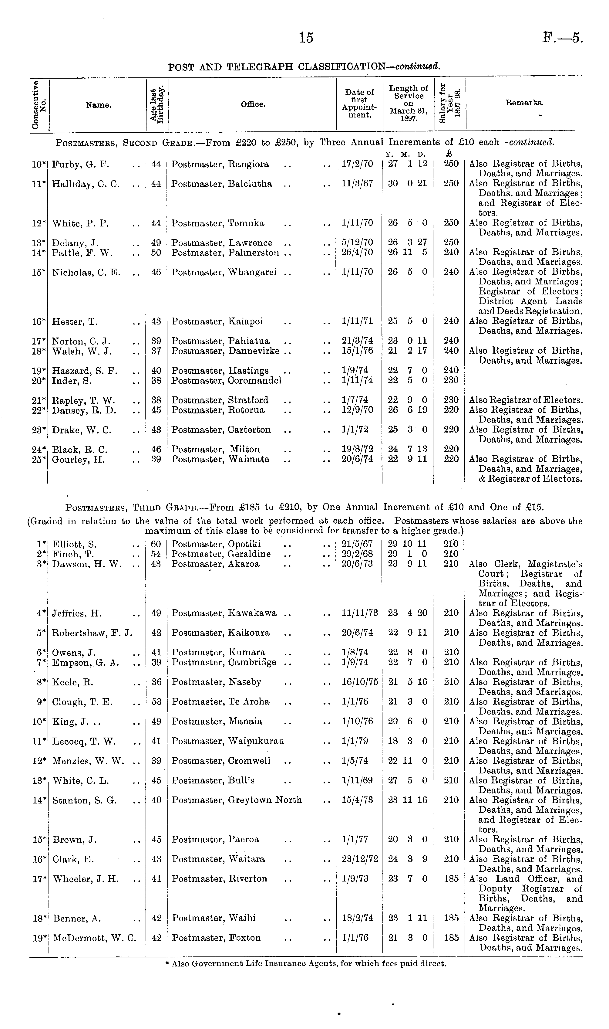_ > a . o o 10 SB a o o Name. t_ s3 C_r_j _H .pq Office. t-»„, . _ Length of Dato of Rpvvipp first on Appoint- March 81, ment. lm^ u •£_» a _ C_ _. _ cS <* Remarks. Postmasters, Seco; IND .rade.—From £220 to £250, by Thre :ee Annual ee Annua Increments of £10 each— continued. ;s of £,'. £ 250 10* 11* Furby, G. F. Halliday, 0. C. 44 44 Postmaster, Rangiora .. Postmaster, Balclutha 17/2/70 11/3/67 17/2/70 11/3/67 Y. M. d. £ 27 1 12 I 250 Also Registrar of Births, Deaths, and Marriages. 30 0 21 250 Also Registrar of Births, Deaths, and Marriages; and Registrar of Electors. 26 5 0 250 Also Registrar of Births, Deaths, and Marriages. 250 White, P. P. Postmaster, Temuka 1/11/70 1/11/70 12* 44 250 13* 14* Delany, J. Pattle, F. W. 49 50 Postmaster, Lawrence Postmaster, Palmerston 5/12/70 26/4/70 5/12/70 26/4/70 26 3 27 250 26 11 5 240 Also Registrar of Births, Deaths, and Marriages. 26 5 0 240 Also Registrar of Births, Deaths, and Marriages; Registrar of Electors; District Agent Lands and Deeds Registration. 25 5 0 240 Also Registrar of Births, Deaths, and Marriages. 250 240 15* Nicholas, C. E. 46 Postmaster, Whangarei .. 1/11/70 1/11/70 240 Hester, T. Postmaster, Kaiapoi 1/11/71 1/11/71 16* 43 240 17* 18* Norton, C J. Walsh, W. J. 39 37 Postmaster, Pahiatua Postmaster, Dannevirke 21/3/74 15/1/76 21/3/74 15/1/76 23 0 11 240 21 2 17 240 Also Registrar of Births, Deaths, and Marriages. 240 240 19* 20* Haszard, S. F. Inder, S. 40 88 Postmaster, Hastings Postmaster, Coromandel 1/9/74 1/11/74 1/9/74 1/11/74 22 7 0 240 22 5 0 230 240 230 21* 22* Rapley, T. W. Dansey, R. D. 38 45 Postmaster, Stratford Postmaster, Rotorua 1/7/74 12/9/70 1/7/74 12/9/70 22 9 0 i 230 Also Registrar of Electors. 26 6 19 220 Also Registrar of Births, Deaths, and Marriages. 25 3 0 220 Also Registrar of Births, Deaths, and Marriages. 230 220 23* Drake, W. C 43 Postmaster, Carterton 1/1/72 1/1/72 220 24* 25* Black, R. C. Gourley, H. 46 39 Postmaster, Milton Postmaster, Waimate 19/8/72 20/6/74 19/8/72 20/6/74 24 7 13 220 22 9 11 220 Also Registrar of Births, Deaths, and Marriages, & Registrar of Electors. 220 220 Postmasters, Th: :rd Grade.—From £185 to £210, by One ue of the total work performed at e. mum of this class to bo considered for e Annual e Annual :ach office r transfer Increment of £10 and One of £15. Grai led in relation to thi i i va 3ach office, r transfer i Postmasters whose salaries are above the ;o a higher grade.) 29 10 11 210 29 1 0 210 23 9 11 210 Also Clerk, Magistrate's Court; Registrar of Births, Deaths, and Marriages; and Registrar of Electors. 23 4 20 210 Also Registrar of Births, Deaths, and Marriages. 22 9 11 210 Also Registrar of Births, Deaths, and Marriages. 22 8 0 210 22 7 0 210 Also Registrar of Births, Deaths, and Marriages. 21 5 16 210 Also Registrar of Births, Deaths, and Marriages. 21 3 0 210 Also Registrar of Births, Deaths, and Marriages. 20 6 0 210 Also Registrar of Births, Deaths, and Marriages. 18 3 0 210 Also Registrar of Births, Deaths, and Marriages. 22 11 0 210 Also Registrar of Births, Deaths, and Marriages. 27 5 0 210 Also Registrar of Births, Deaths, and Marriages. 23 11 1G 210 Also Registrar of Births, Deaths, and Marriages, and Registrar of Electors. 20 3 0 210 j Also Registrar of Births, Deaths, and Marriages. 24 3 9 210 Also Registrar of Births, Deaths, and Marriages. 23 7 0 185 Also Land Officer, and Deputy Registrar of Births, Deaths, and Marriages. 23 1 11 185 Also Registrar of Births, Deaths, and Marriages. 21 3 0 185 | Also Registrar of Births, Deaths, and Marriages. naxi 1* 2* 3* j Elliott, S. .. | Finch,T. Dawson, H. W. 60 54 43 Postmaster, Opotiki Postmaster, Geraldine Postmaster, Akaroa 21/5/67 29/2/68 20/6/73 21/5/67 29/2/68 20/6/73 Jeffries, H. Postmaster, Kawakawa .. 11/11/73 4* 49 210 5*| Robertslmw, F. J. 12 Postmaster, Kaikoura .. .. I 20/6/74 210 6*' 7* Owens, J. .. i Empson, G. A. 41 39 Postmaster, Kumara Postmaster, Cambridge 1/8/74 1/9/74 210 210 8* Keele, R. 36 Postmaster, Naseby 10/10/75 210 9* Clough, T. E. 53 Postmaster, Te Aroha 1/1/76 210 10* King, J. .. 49 Postmaster, Manaia 1/10/76 210 11* Lecocq, T. W. 41 Postmaster, Waipukurau 1/1/79 210 12* Menzies, W. W. .. 39 Postmaster, Cromwell 1/5/74 210 13* White, C. L. 45 Postmaster, Bull's 1/11/69 210 14* Stanton, S. G. 40 Postmaster, Greytown North 15/4/73 210 Brown, J. Postmaster, Paeroa 1/1/77 15* 45 16* Clark, E. 43 Postmaster, Waitara 23/12/72 17* Wheeler, J. H. 11 Postmaster, Riverton 1/9/73 Benner, A. Postmaster, Waihi 18/2/74 18* 42 19* McDermott, W. C. 42 Postmaster, Foxton .. 1/1/76 * Also Government Life Insurance A| ;ents, for which fees paid direct.