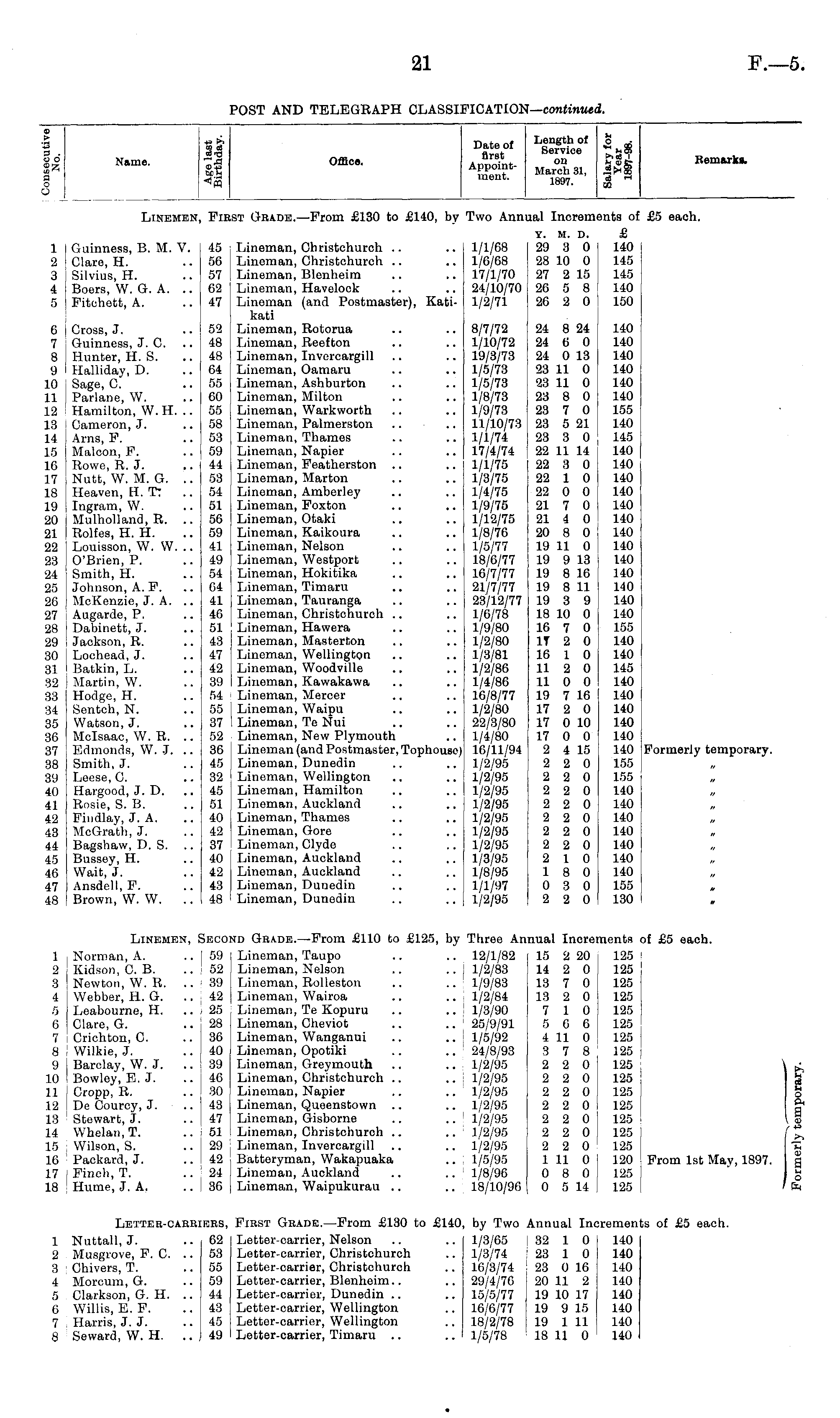 ID > •43 3 . o o ®;z; a o o Name. co to pa Office. Date of Length of A^e 0 _. t_ March31 ' ment. 189?^ lit a3 _ _ Cfl r. _ Remarks. Linemen, First Grade. —From £130 to £140, by Two Anm ._ lal Incrern 3nts of £5 each. 1 2 3 4 5 1 I Guinness, B. M. V. 2 1 Clare, H. 3 i Silvius, H. 4 | Boers, W. G. A. 5 | Fitchett, A. 45 Lineman, Christchurch .. .. 1/1/68 56 Lineman, Christchurch .. .. 1/6/68 57 Lineman, Blenheim .. .. 17/1/70 62 Lineman, Havelock .. .. 24/10/70 47 Lineman (and Postmaster), Kati- 1/2/71 kati 52 Lineman, Rotorua .. .. 8/7/72 48 Lineman, Reefton .. .. 1/10/72 48 Lineman, Invercargill .. .. 19/3/73 64 Lineman, Oamaru .. .. 1/5/73 55 Lineman, Ashburton .. .. 1/5/73 60 Lineman, Milton .. .. 1/8/73 55 Lineman, Warkworth .. .. 1/9/73 58 Lineman, Palmerston .. .. 11/10/73 53 Lineman, Thames .. .. 1/1/74 59 Lineman, Napier .. .. 17/4/74 44 Lineman, Featherston .. .. 1/1/75 53 Lineman, Marton .. .. 1/3/75 54 Lineman, Amberley .. .. 1/4/75 51 Lineman, Foxton .. .. 1/9/75 56 Lineman, Otaki .. .. 1/12/75 59 Lineman, Kaikoura .. .. 1/8/76 41 Lineman, Nelson .. .. 1/5/77 49 Lineman, Westport .. .. 18/6/77 54 Lineman, Hokitika .. .. 16/7/77 64 Lineman, Timaru .. .. 21/7/77 41 Lineman, Tauranga .. .. 23/12/77 46 Lineman, Christchurch .. .. 1/6/78 51 Lineman, Hawera .. .. 1/9/80 43 Lineman, Masterton .. .. 1/2/80 47 Lineman, Wellington .. .. 1/3/81 42 Lineman, Woodville .. .. 1/2/86 39 Lineman, Kawakawa .. .. 1/4/86 54 Lineman, Mercer .. .. 16/8/77 55 I Lineman, Waipu .. .. 1/2/80 37 I Lineman, Te Nui .. .. 22/3/80 52 Lineman, New Plymouth .. | 1/4/80 36 I Lineman (and Postmaster, Tophouse) 16/11/94 45 ' Lineman, Dunedin .. .. I 1/2/95 32 ! Lineman, Wellington .. .. j 1/2/95 45 I Lineman, Hamilton .. .. 1/2/95 51 Lineman, Auckland .. .. 1/2/95 40 ! Lineman, Thames .. .. 1/2/95 42 Lineman, Gore .. .. 1/2/95 37 Lineman, Clyde .. .. 1/2/95 40 Lineman, Auckland .. .. 1/3/95 42 Lineman, Auckland .. .. 1/8/95 43 Lineman, Dunedin .. .. 1/1/97 48 '■ Lineman, Dunedin .. .. 1/2/95 45 56 57 62 •17 y. m. d. 29 3 0 28 10 0 27 2 15 26 5 8 26 2 0 £ 140 145 145 140 150 6 7 8 9 10 11 12 13 11 15 16 17 18 19 20 21 22 23 24 25 26 27 28 29 30 31 32 33 34 35 36 37 38 39 40 41 42 43 44 45 46 ■17 •18 6 j Cross, J. 7 Guinness, J. C. 8 I Hunter, H. S. 9 i Halliday, D. 0 ! Sage, C. 1 I Parlane, W. 2 Hamilton, W. H. .. 3 Cameron, J. 4 Arns, F. 5 Malcon, F. 6 Rowe, R. J. 7 Nutt, W. M. G. .. .8 Heaven, H. T. 9 Ingram, W. 10 I Mulholland, R. .. 11 I Rolfes, H. H. !2 I Louisson, W. W. .. 13 ! O'Brien, P. 14 Smith, H. 15 Johnson, A. F. !6 McKenzie, J. A. 17 i Augarde, P. 18 | Dabinett, J. !9 I Jackson, R. 10 I Lochead, J. 11 I Batkin, L. 12 i Martin, W. 13 Hodge, H. (4 Sentch, N. 15 Watson, J. 16 Mclsaac, W. R. .. 17 Edmonds, W. J. .. 18 Smith, J. 19 Leese, C 10 Hargood, J. D. ; 1 Rosie, S. B. .2 Fiudlay, J. A. ,3 McGrath, J. 14 Bagshaw, D. S. .. : 5 Bussey, H. 16 Wait, J. ,7 Ansdell, F. 18 Brown, W. W. 52 48 48 64 55 60 55 58 53 59 44 53 54 51 56 59 41 49 54 64 41 46 51 43 1.7 ■12 39 51 55 37 52 86 45 32 45 51 40 42 37 40 42 48 48 24 8 24 24 6 0 24 0 13 23 11 0 23 11 0 23 8 0 23 7 0 23 5 21 23 3 0 22 11 14 22 8 0 22 1 0 22 0 0 21 7 0 21 4 0 20 8 0 19 11 0 19 9 13 19 8 16 19 8 11 19 3 9 18 10 0 16 7 0 IT 2 0 16 1 0 11 2 0 11 0 0 19 7 16 17 2 0 17 0 10 17 0 0 2 4 15 2 2 0 2 2 0 2 2 0 2 2 0 2 2 0 2 2 0 2 2 0 2 10 18 0 0 3 0 2 2 0 140 140 140 140 140 140 155 140 145 140 140 140 140 140 140 140 140 140 140 140 140 ; 140 155 140 i 140 145 140 140 140 140 140 140 155 155 140 140 140 140 140 140 140 155 130 Formerly temporary. 1 2 3 4 5 6 7 8 9 10 11 12 13 14 16 16 17 18 Linemen, I 1 i Norman, A. 2 Kidson.C. B. 3 Newton, W. R. .. 4 Webber, H. G. 5 Leabourne, H. 6 Clare, G. 7 Crichton, C. 8 ! Wilkie, J. 9 Barclay, W. J. .0 Bowley, E.J. 1 Cropp, R. .2 De Courcy, J. .3 Stewart, J. .4 Whelan.T. .5 Wilson, S. .6 ! Packard, J. .7 [ Finch, T. .8 ! Hume, J. A. Second Grade.—From £110 to £125, by Three An [ 59 | Lineman, Taupo .. .. 12/1/82 52 Lineman, Nelson .. .. j 1/2/83 39 ! Lineman, Rolleston .. .. 1/9/83 : 42 j Lineman, Wairoa .. .. ! 1/2/84 25 Lineman, Te Kopuru .. .. I 1/3/90 28 Lineman, Cheviot .. .. ' 25/9/91 36 Lineman, Wanganui .. .. j 1/5/92 40 Lineman, Opotiki .. .. 24/8/93 39 Lineman, Greymouth .. .. 1/2/95 40 Lineman, Christchurch .. .. 1/2/95 30 Lineman, Napier .. .. 1/2/95 43 Lineman, Queenstown .. .. 1/2/95 47 Lineman, Gisborne .. .. ! 1/2/95 51 Lineman, Christchurch .. .. 1/2/95 29 ; Lineman, Invercargill .. .. 1/2/95 42 j Batteryman, Wakapuaka .. 1/5/95 24 ■ Lineman, Auckland .. .. 1/8/96 j 36 | Lineman, Waipukurau .. .. 18/10/96 rual Increi 15 2 20 14 2 0 13 7 0 13 2 0 7 10 5 6 6 4 11 0 3 7 8 2 2 0 2 2 0 2 2 0 2 2 0 2 2 0 2 2 0 2 2 0 1 11 0 0 8 0 0 5 14 ments < 125 125 125 125 125 125 125 125 125 125 125 125 125 125 125 120 125 125 af £5 each. 1 From 1st May, 1897. I .1 R _ a /_! From 1st May, 1897. Letter-carri :ers, First Grade.—From £130 to £140, by Two . 62 Letter-carrier, Nelson .. .. 1/3/65 53 Letter-carrier, Christchurch .. 1/3/74 55 Letter-carrier, Christchurch .. 16/3/74 59 Letter-carrier, Blenheim.. .. 29/4/76 44 Letter-carrier, Dunedin .. .. 15/5/77 43 Letter-carrier, Wellington .. 16/6/77 45 Letter-carrier, Wellington .. 18/2/78 49 Letter-carrier, Timaru .. .. 1/5/78 Annual Inc srement ,8 of £5 each. 1 Nuttall, J. 2 Musgrove, F. C. 3 Chivers, T. 4 Morcum, G. 5 Clarkson, G. H. 6 Willis, E. F. 7 Harris, J. J. 8 Seward, W. H. 32 1 0 1 23 1 0 23 0 16 20 11 2 19 10 17 19 9 15 19 1 11 18 11 0 140 140 140 140 140 140 140 140