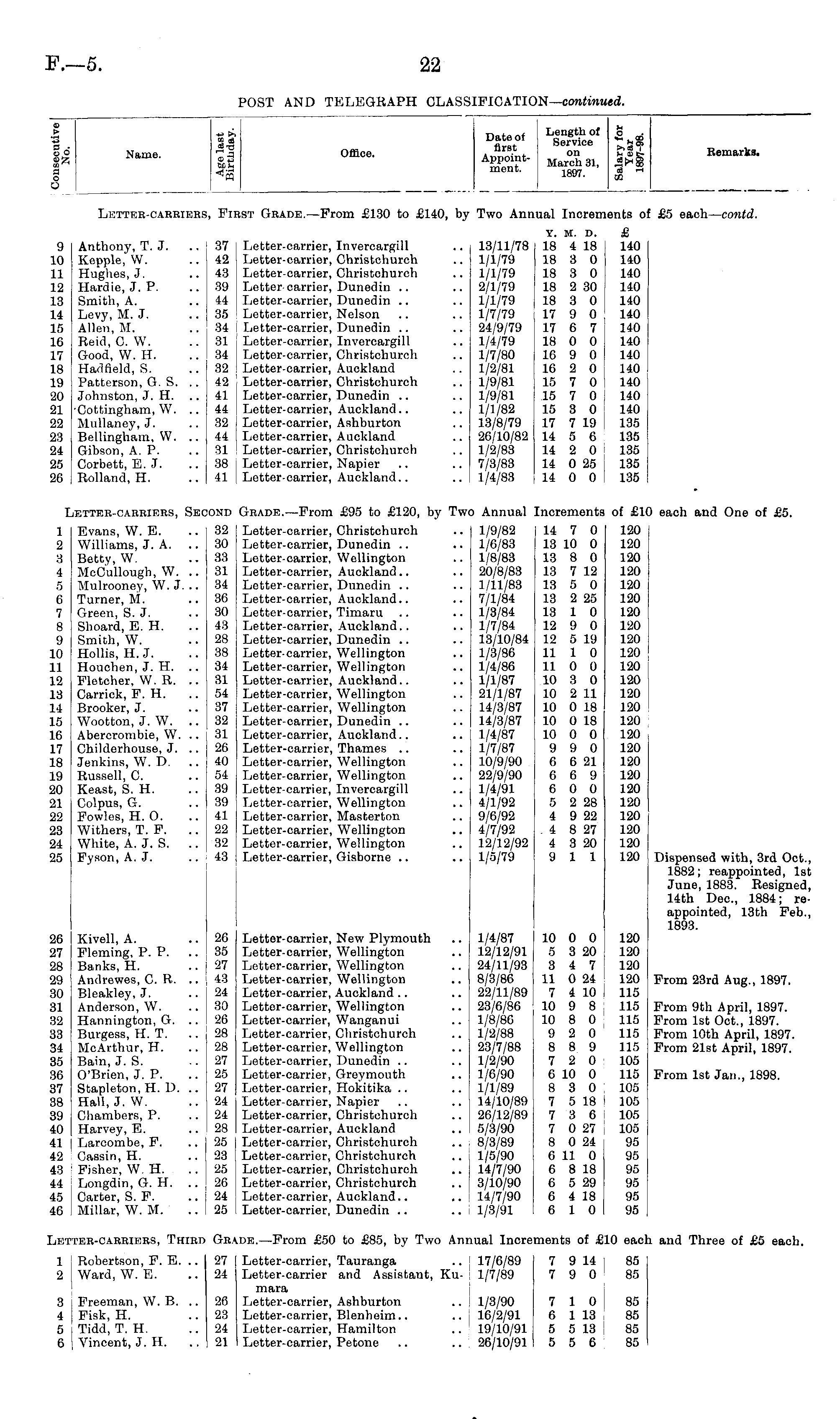 > •9 go 35 w 3 o o Name. ■w P. 5 c_ Cuot. Office. _„. „ „. Length of 8 Date of a B ? v i(>B *__ first on >>S . Appoint- March31 |)S§ ment - 1897. $ ~ Remarks. Letter-carrier ;, Fi: 1ST Grade.—From £130 to £140, by Two Annual Incren lents o: £5 each— contd. 9 10 11 12 13 14 15 16 17 18 19 20 21 22 23 24 25 26 I Anthony, T. J. I Kepple, W. Hughes, J. 1 Hardie, J. P. : Smith, A. : Levy, M. J. i Allen, M. i Reid, C. W. Good, W. H. : Hadfleld, S. i Patterson, G. S. i Johnston, J. H. Cottingham, W. .. 1 Mullaney, J. Bellingham, W. .. Gibson, A. P. Corbett, E. J. Rolland, H. 37 42 43 39 44 35 34 31 34 32 42 41 44 32 44 31 38 41 Letter-carrier, Invercargill Letter-carrier, Christchurch .. | Letter-carrier, Christchurch Letter carrier, Dunedin .. Letter-carrier, Dunedin Letter-carrier, Nelson Letter-carrier, Dunedin Letter-carrier, Invercargill Letter-carrier, Christchurch Letter-carrier, Auckland Letter-carrier, Christchurch Letter-carrier, Dunedin Letter-carrier, Auckland.. Letter-carrier, Ashburton Letter-carrier, Auckland Letter-carrier, Christchurch Letter-carrier, Napier Letter-carrier, Auckland.. Y. M. D. 13/11/78 18 4 18 1/1/79 18 3 0 1/1/79 18 3 0 2/1/79 18 2 30 1/1/79 18 3 0 1/7/79 17 9 0 24/9/79 17 6 7 1/4/79 | 18 0 0 1/7/80 16 9 0 1/2/81 16 2 0 1/9/81 ! 15 7 0 1/9/81 15 7 0 1/1/82 15 3 0 13/8/79 17 7 19 2G/10/82 14 5 6 1/2/83 14 2 0 7/3/83 14 0 25 1/4/83 14 0 0 £ I 140 140 140 140 140 140 140 140 140 140 140 140 140 135 135 135 135 135 Letter-carriers, Se' IOND Grade.—From £95 to £120, by Twc Annual Incrementi of £1( each and One of £5. 1 2 3 4 5 6 7 8 9 10 11 12 13 14 15 16 17 18 19 20 21 22 23 24 25 Evans, W. E. Williams, J. A. Betty, W. McCullough, W. .. Mulrooney, W. J. .. Turner, M. Green, S. J. Shoard, E. H. Smith, W. Hollis, H. J. Houchen, J. H. Fletcher, W. R. .. Carrick, F. H. Brooker, J. Wootton, J. W. .. Abercrombie, W. .. Childerhouse, J. .. Jenkins, W. D. Russell, C Keast, S. H. Colpus, G. Fowles, H. O. Withers, T. F. White, A. J. S. Fyson, A. J. 32 30 33 31 34 36 30 43 28 38 34 31 54 37 32 31 26 40 54 39 39 41 22 32 43 Letter-carrier, Christchurch Letter-carrier, Dunedin Letter-carrier, Wellington Letter-carrier, Auckland.. Letter-carrier, Dunedin Letter-carrier, Auckland.. Letter-carrier, Timaru Letter-carrier, Auckland.. Letter-carrier, Dunedin Letter-carrier, Wellington Letter-carrier, Wellington Letter-carrier, Auckland.. Letter-carrier, Wellington Letter-carrier, Wellington Letter-carrier, Dunedin Letter-carrier, Auckland.. Letter-carrier, Thames Letter-carrier, Wellington Letter-carrier, Wellington Letter-carrier, Invercargill Letter-carrier, Wellington Letter-carrier, Masterton Letter-carrier, Wellington Letter-carrier, Wellington Letter-carrier, Gisborne 1/9/82 14 7 0 1/6/83 13 10 0 1/8/83 13 8 0 20/8/83 13 7 12 1/11/83 13 5 0 7/1/84 13 2 25 1/3/84 13 1 0 1/7/84 12 9 0 13/10/84 12 5 19 1/3/86 11 1 0 1/4/86 11 0 0 1/1/87 10 3 0 21/1/87 10 2 11 14/3/87 10 0 18 14/3/87 10 0 18 1/4/87 10 0 0 1/7/87 9 9 0 10/9/90 6 6 21 22/9/90 6 6 9 1/4/91 6 0 0 4/1/92 5 2 28 9/6/92 4 9 22 4/7/92 4 8 27 12/12/92 4 3 20 1/5/79 9 11 120 120 120 120 120 120 120 120 120 120 120 120 120 120 120 120 120 120 120 120 120 120 120 120 120 Kivell, A. Fleming, P. P. Banks, H. Andrewes, C. R. i Bleakley, J. Anderson, W. Hannington, G. .. Burgess, H. T. McArthur, H. Bain, J. S. i O'Brien, J. P. Stapleton.H. D. .. Hall, J. W. Chambers, P. Harvey, E. j Larcombe, F. Gassin, H. Fisher, W. H. j Longdin, G. H. Carter, S. F. i I Millar, W. M. Letter-carrier, New Plymouth Letter-carrier, Wellington Letter-carrier, Wellington Letter-carrier, Wellington Letter-carrier, Auckland Letter-carrier, Wellington Letter-carrier, Wanganui Letter-carrier, Christchurch Letter-carrier, Wellington Letter-carrier, Dunedin Letter-carrier, Greymouth Letter-carrier, Hokitika Letter-carrier, Napier Letter-carrier, Christchurch Letter-carrier, Auckland Letter-carrier, Christchurch Letter-carrier, Christchurch Letter-carrier, Christchurch Letter-carrier, Christchurch .. j Letter-carrier, Auckland.. Letter-carrier, Dunedin .. Dispensed with, 3rd Oct., 1882; reappointed, 1st June, 1883. Resigned, 14th Dec, 1884; reappointed, 13th Feb., 1893. 26 27 28 29 30 81 32 33 34 35 36 37 88 39 40 41 42 13 44 46 40 26 35 27 43 24 30 26 28 28 27 25 27 24 24 28 25 23 25 26 24 25 1/4/87 12/12/91 24/11/93 8/3/86 22/11/89 23/6/86 1/8/86 1/2/88 23/7/88 1/2/90 1/6/90 1/1/89 14/10/89 20/12/89 5/3/90 8/3/89 1/5/90 14/7/90 3/10/90 14/7/90 1/3/91 I 10 0 0 120 5 3 20 120 3 4 7 : 120 11 0 24 120 7 4 10 115 10 9 8 115 10 8 0 115 9 2 0 115 8 8 9 115 7 2 0 105 6 10 0 115 8 3 0 105 7 5 18 105 7 3 6 105 7 0 27 105 8 0 24 95 6 11 0 95 6 8 18 95 6 5 29 95 6 4 18 95 6 10 95 From 23rd Aug., 1897. From 9th April, 1897. From 1st Oct., 1897. From 10th April, 1897. From 21st April, 1897. From 1st Jan., 1898. and Three of £5 each. 1TTER-CARRIERS, ThIRT Gr> .de.—From £50 to £85, by Two Ann Lual Incre lents of £10 eac! |E' 1 2 I Robertson, F. E. j Ward, W. E. 27 24 Letter-carrier, Tauranga .. [ Letter-carrier and Assistant, Ku17/6/89 1/7/89 7 9 14 | 85 7 9 0 85 3 4 5 6 I I Freeman, W. B. .. ! Fisk, H. , i Tidd, T. H. i j Vincent, J. H. 26 23 24 21 mara Letter-carrier, Ashburton .. j Letter-carrier, Blenheim.. Letter-carrier, Hamilton Letter-carrier, Petone .. 1/3/90 16/2/91 19/10/91 26/10/91 7 10! 85 6 1 13 85 5 5 13 85 5 5 6 85